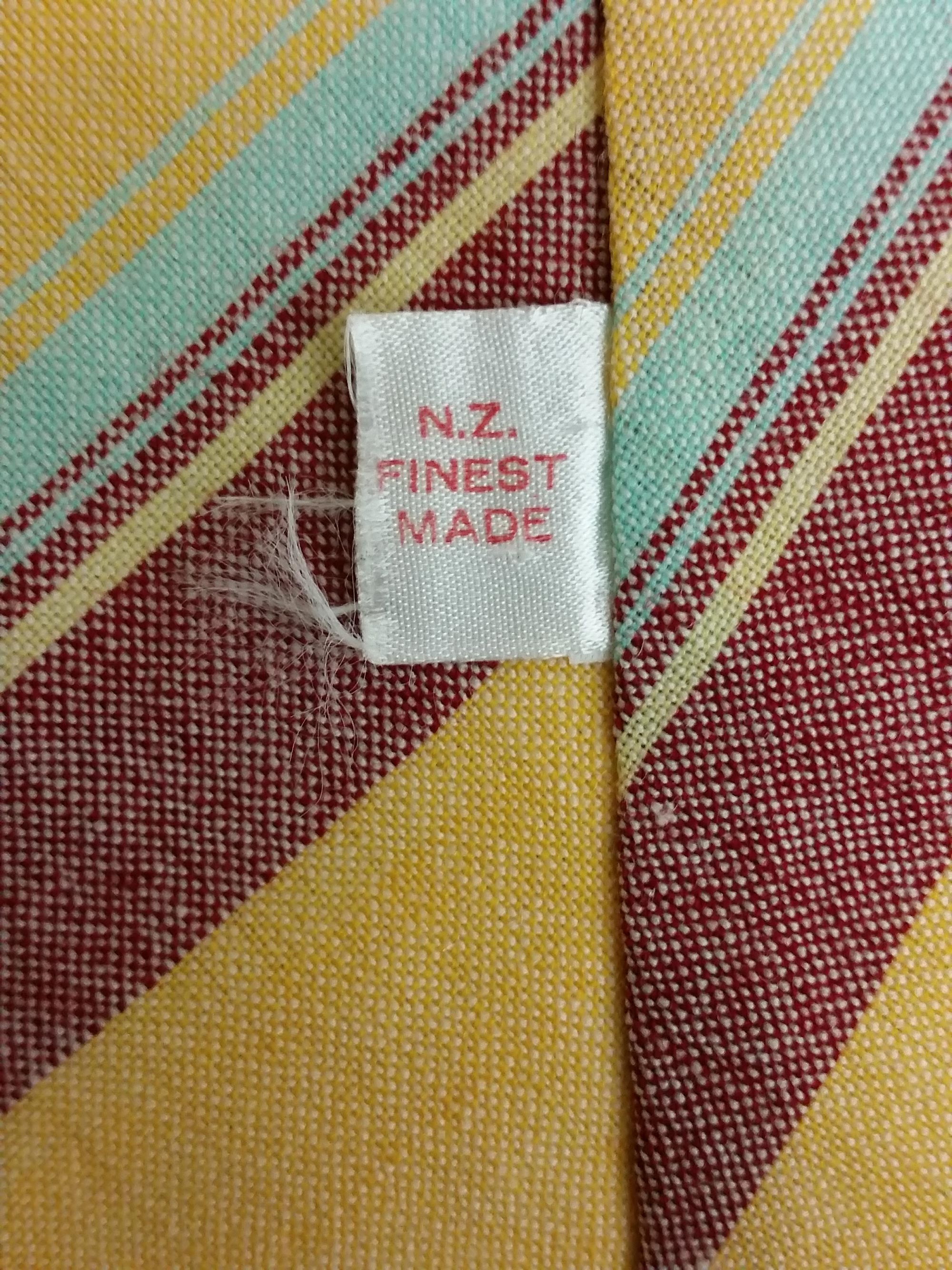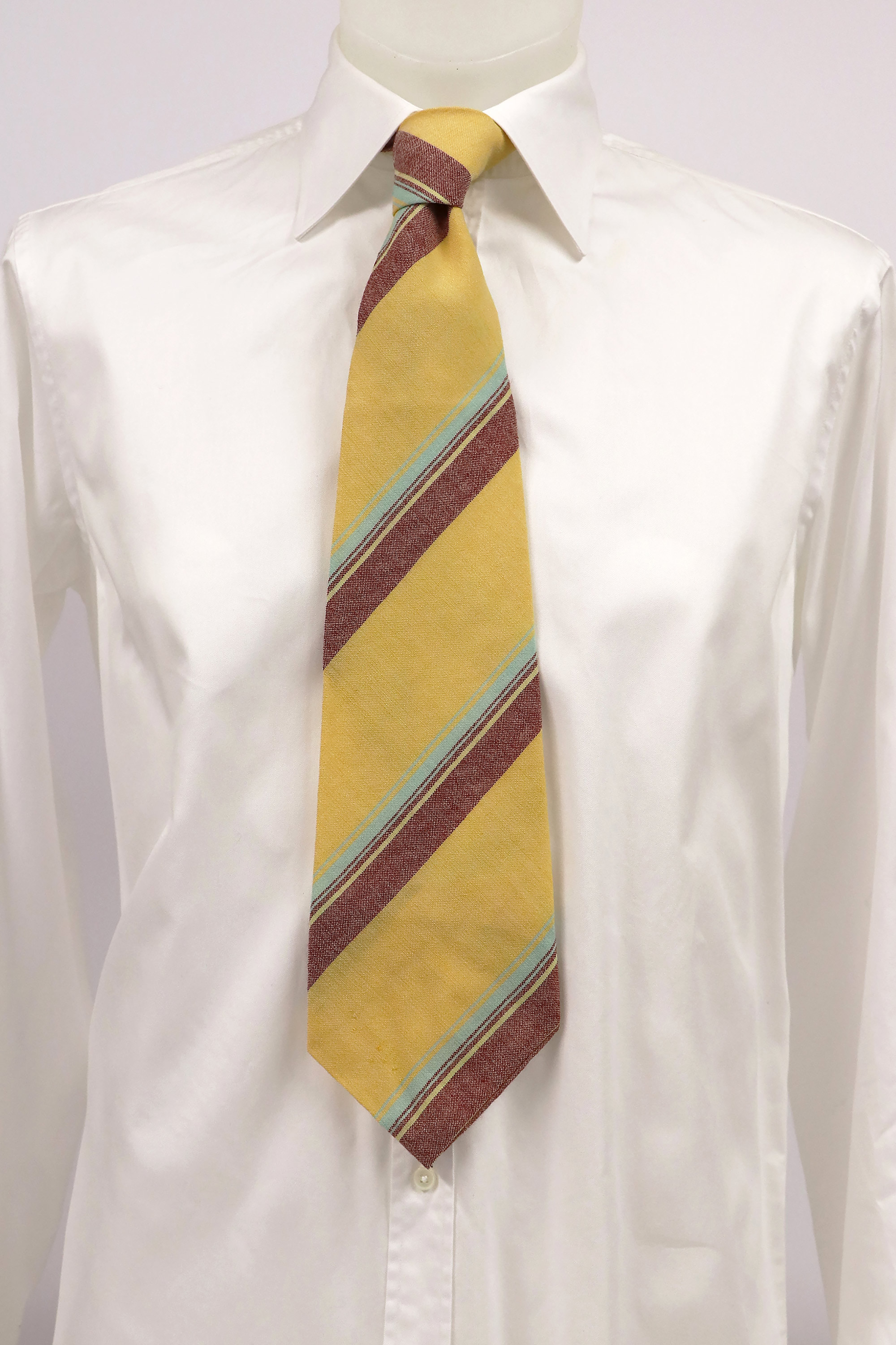 This Parisian tie is wool woven with a stripe pattern. Its tip is cut on and folded back (rather than a separate tip stitched in).