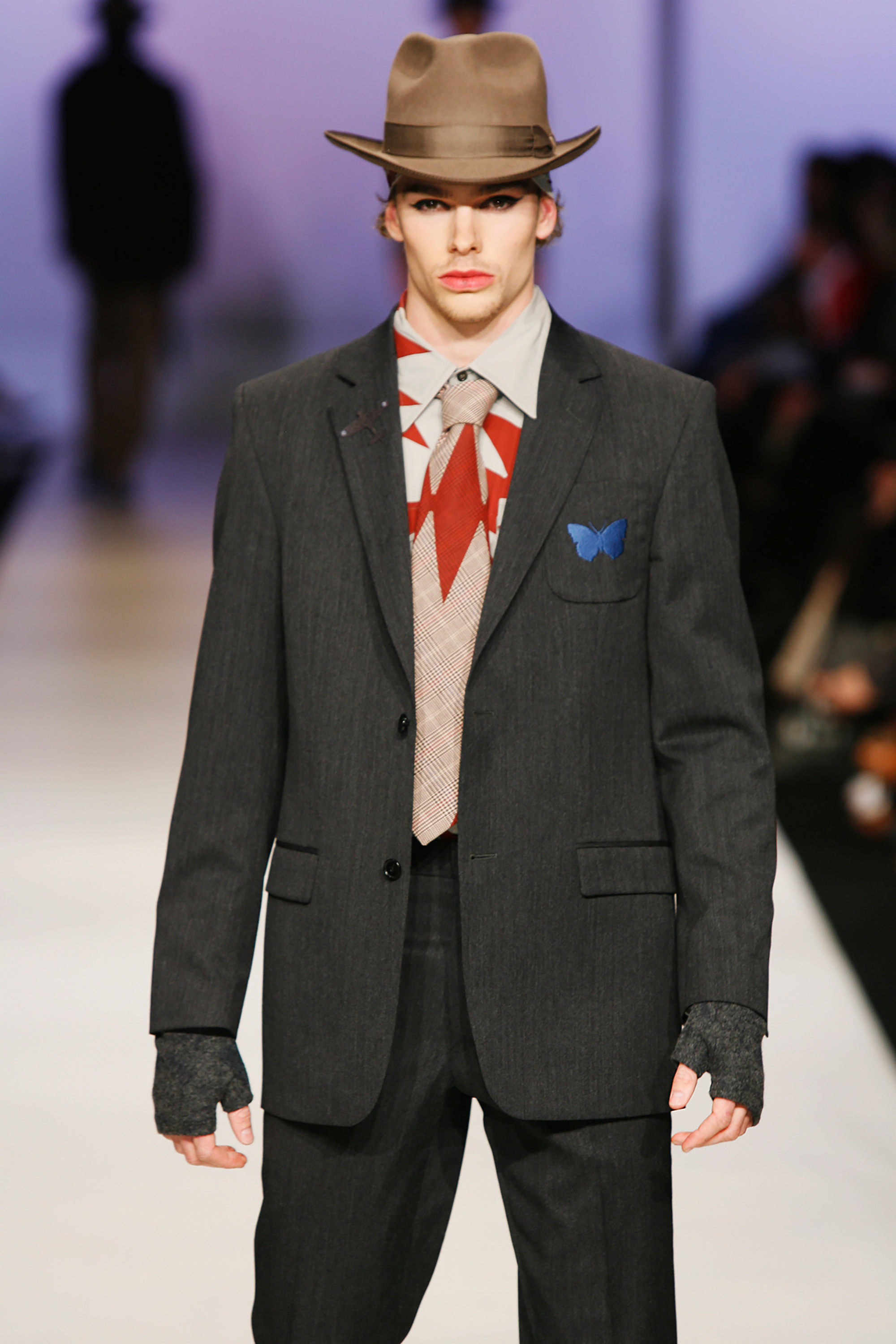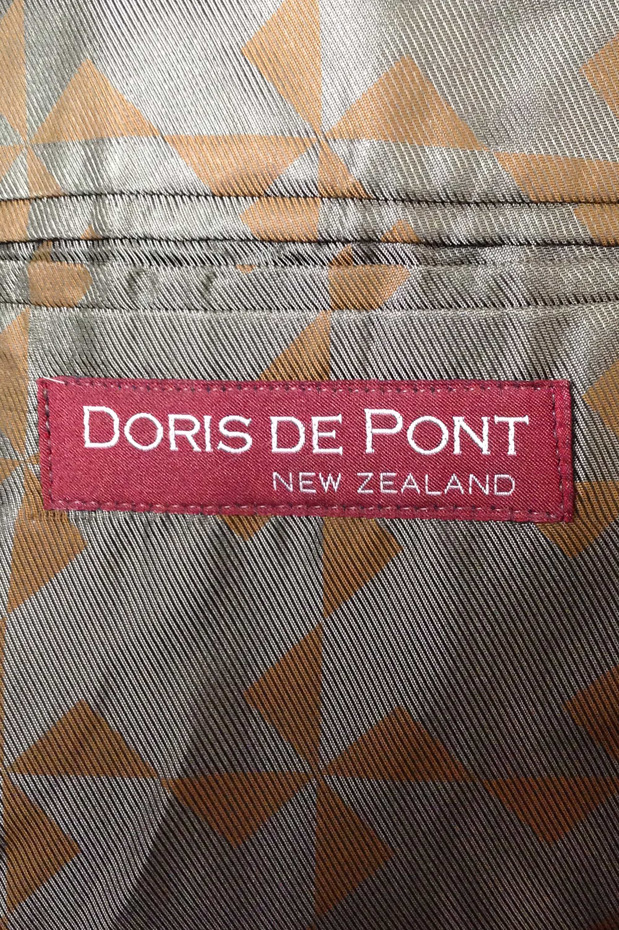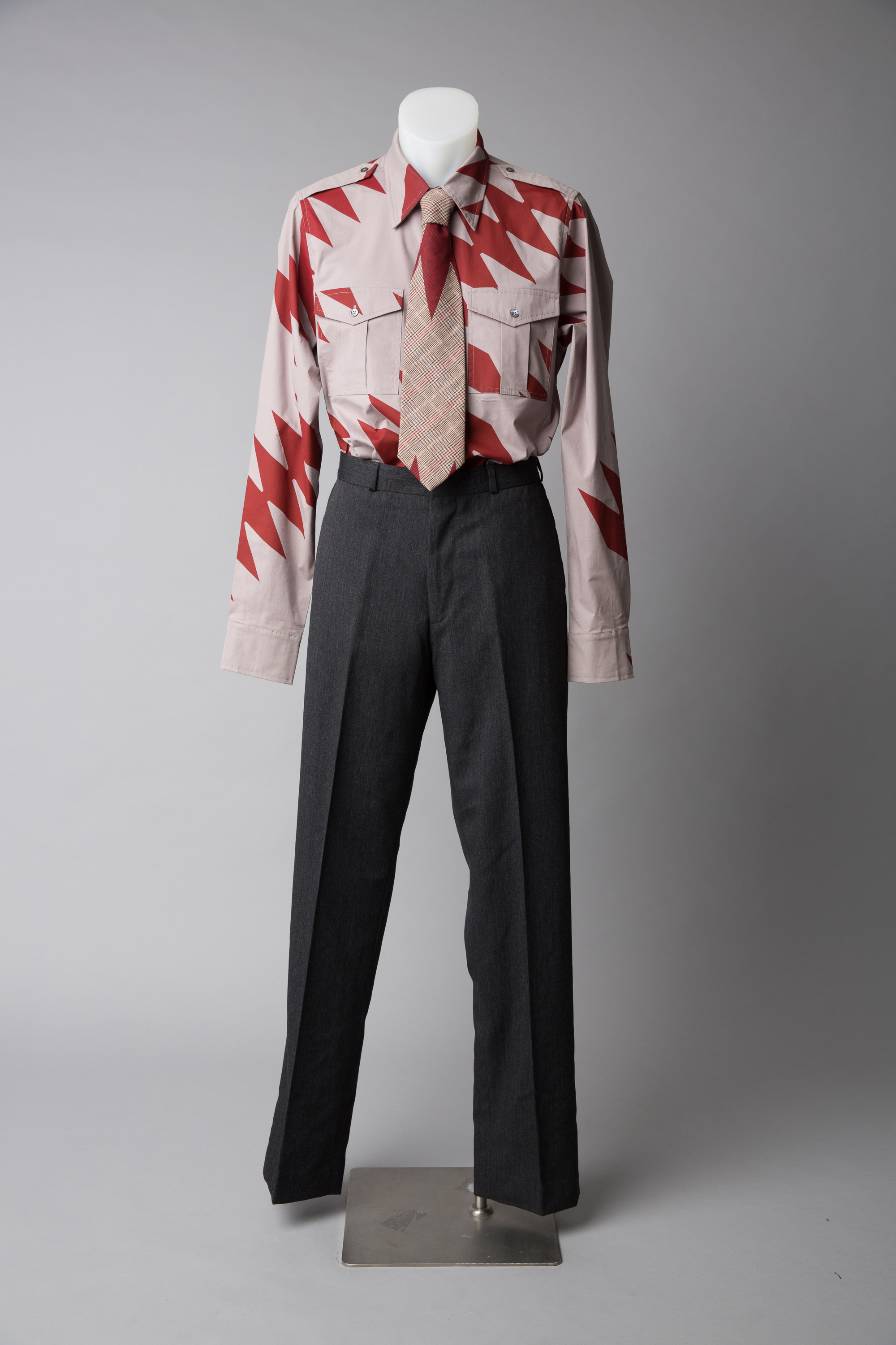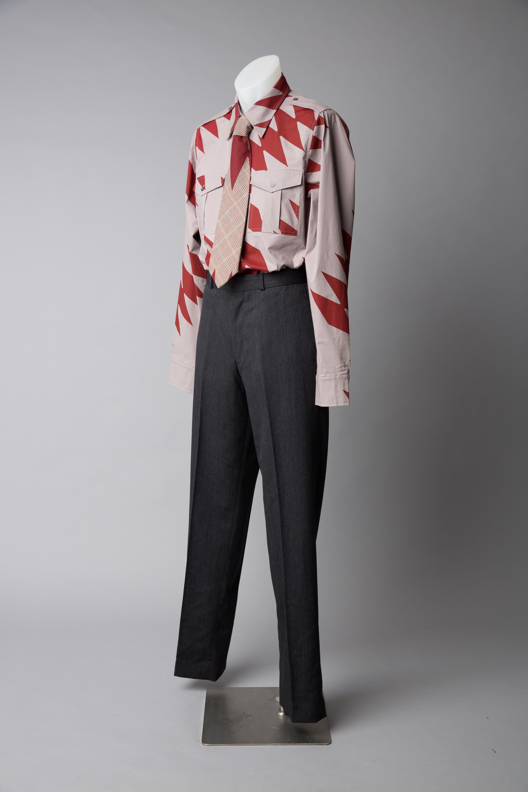 These garments - Mistake shirt, Pioneer tie, Split jacket and Enz trousers - are from Doris de Pont’s winter 2007 collection, Sampler. It was unveiled at New Zealand Fashion Week in September 2006. Taking inspiration from the 'cut out' art of celebrated contemporary New Zealand artist Richard Killeen, Doris designed winter prints that included “little bits of everything”. One of his prints, 'Great Hall of Jar', had caught Doris’ eye at an exhibition at the Ivan Anthony gallery in Auckland. "Some of his work with all the different illustrations looks like it is already a fabric pattern, so I wanted to see how it would work on fabric – the results are fantastic," Doris says. The shirt and tie is print is a tile pattern, reminiscent of the suits famous New Zealand band Split Enz donned in their early days. Doris also included a mix of iconography - including fighter planes, a butterfly in a jar, fish, bugs, foliage and a spiral with fork.