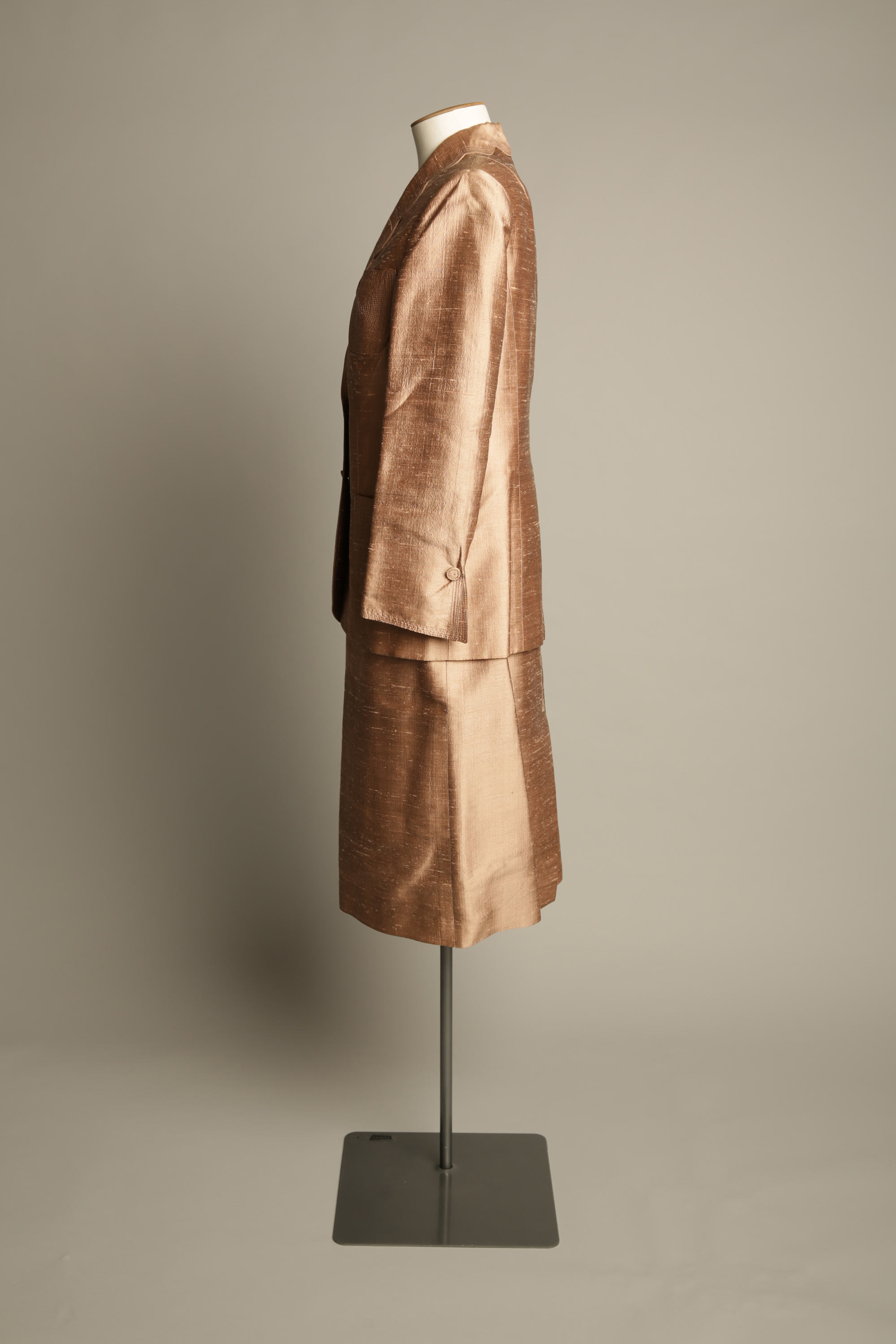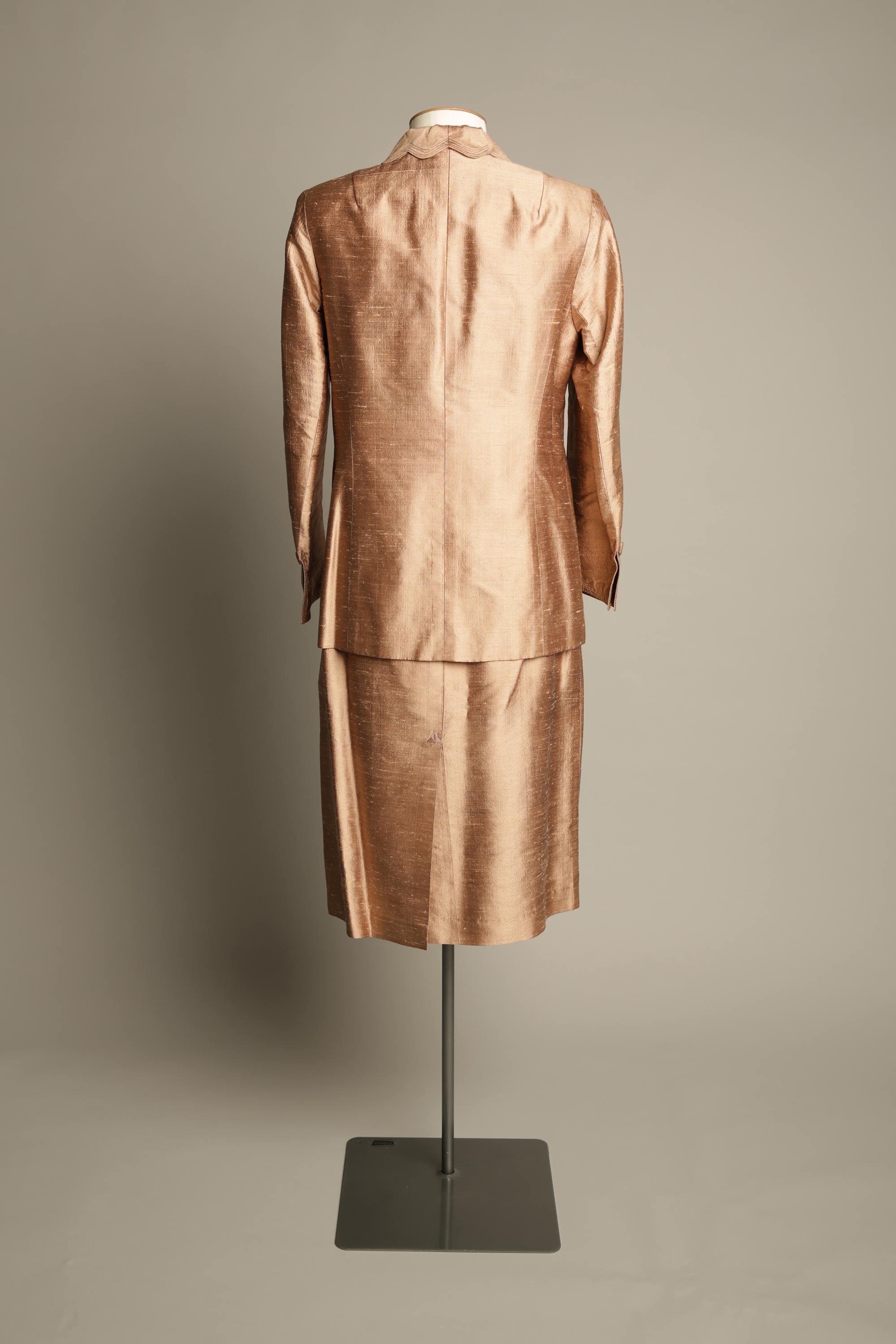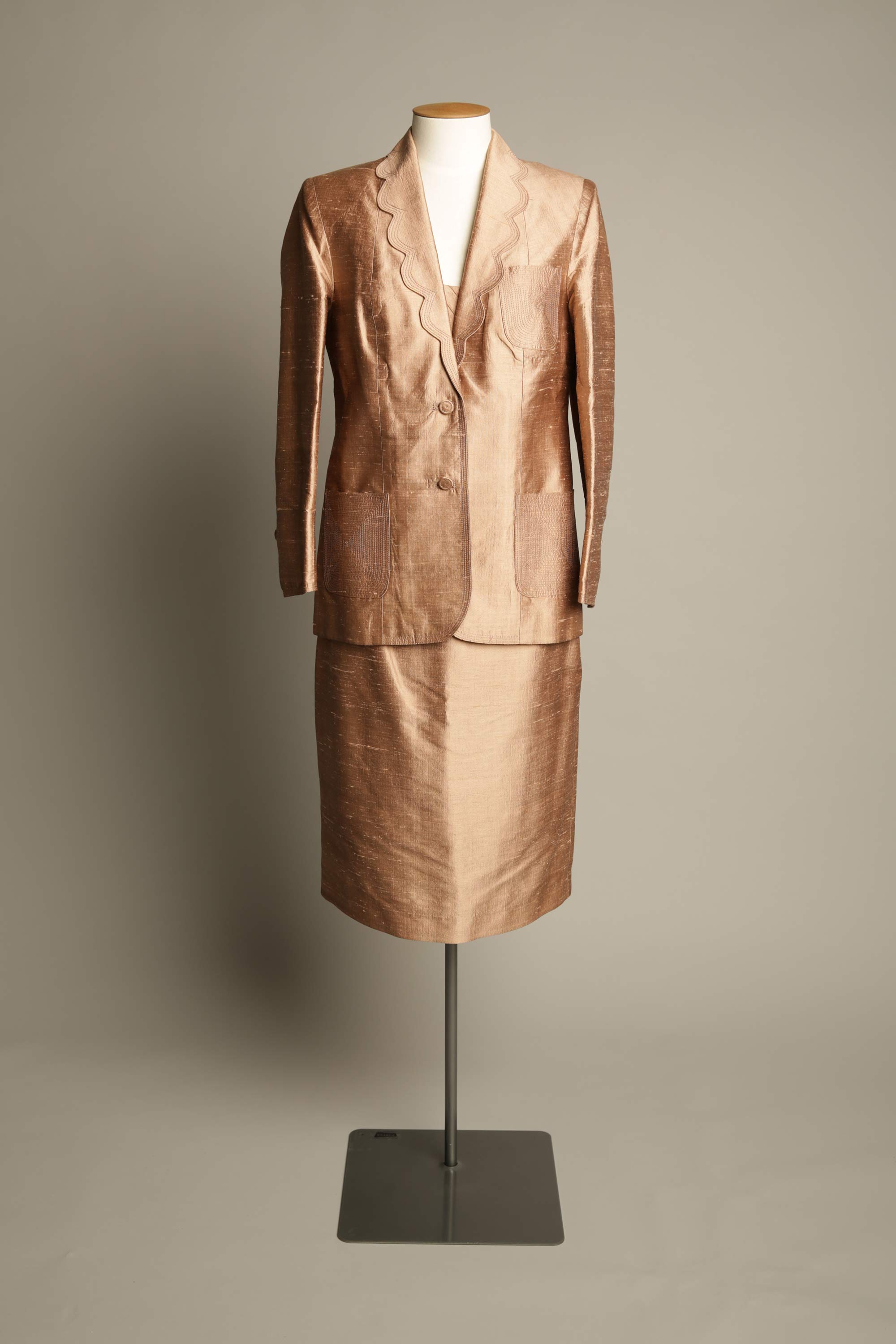 The jacket features scalloped lapels and the top has rows of pin tucks.