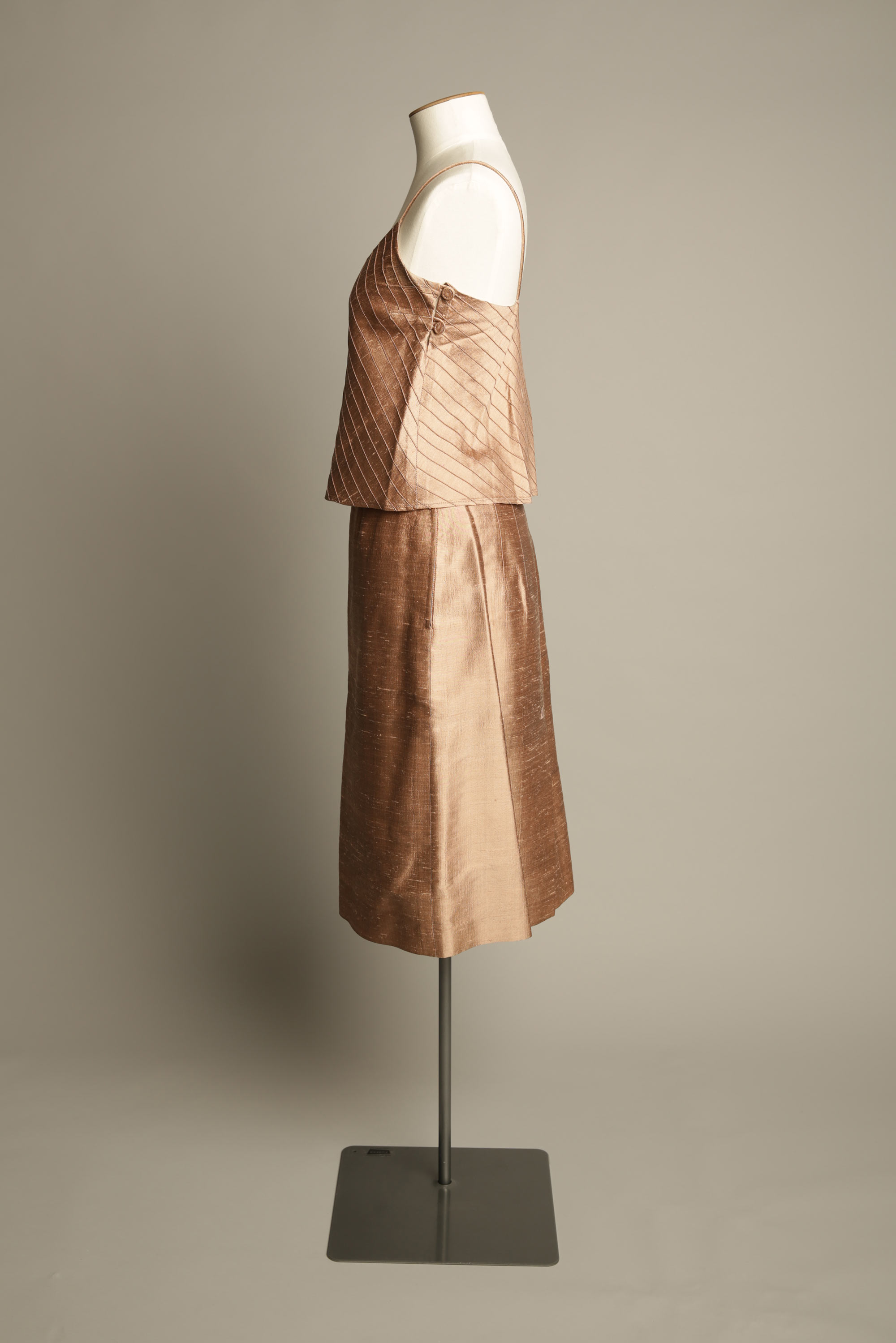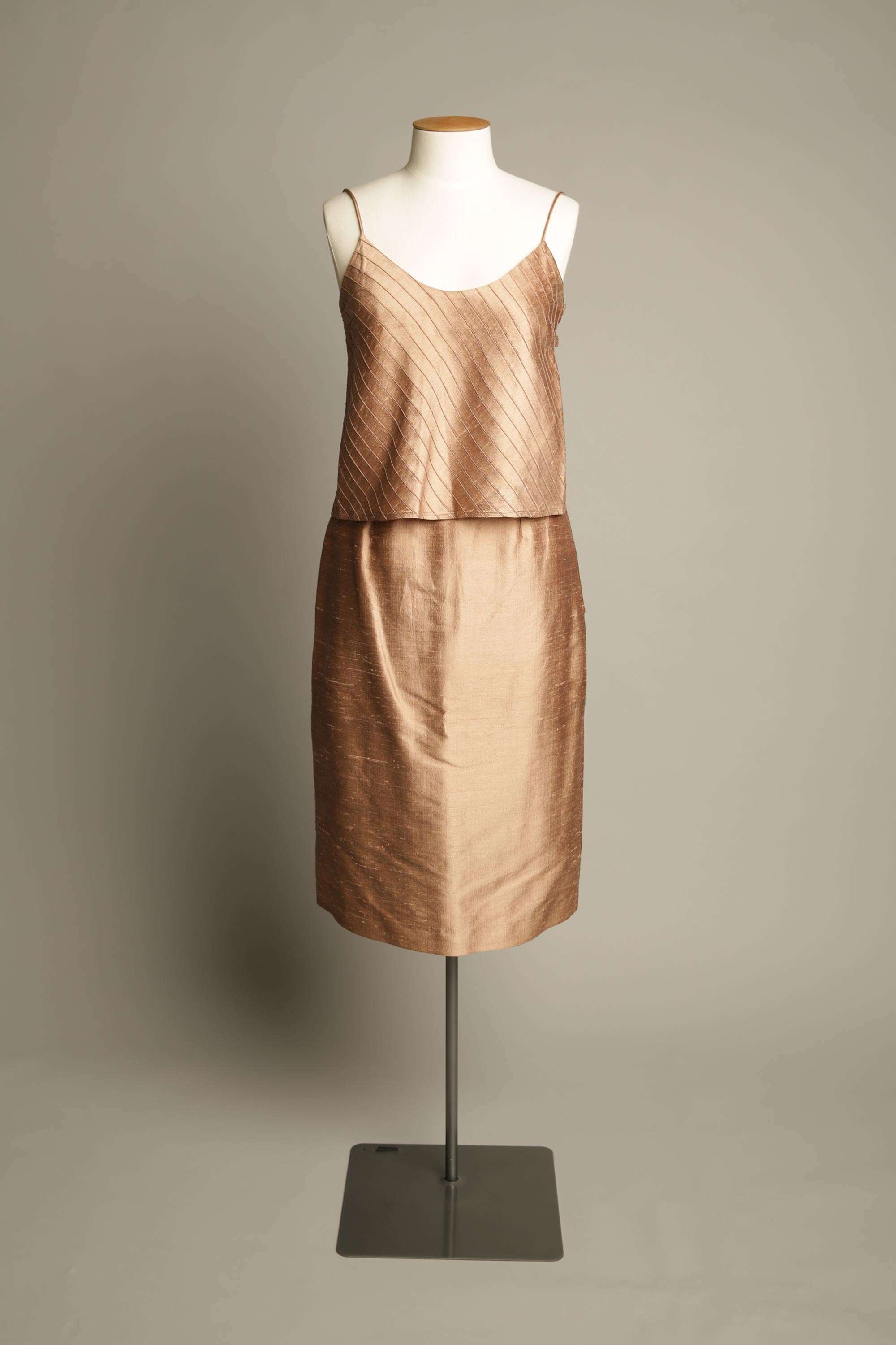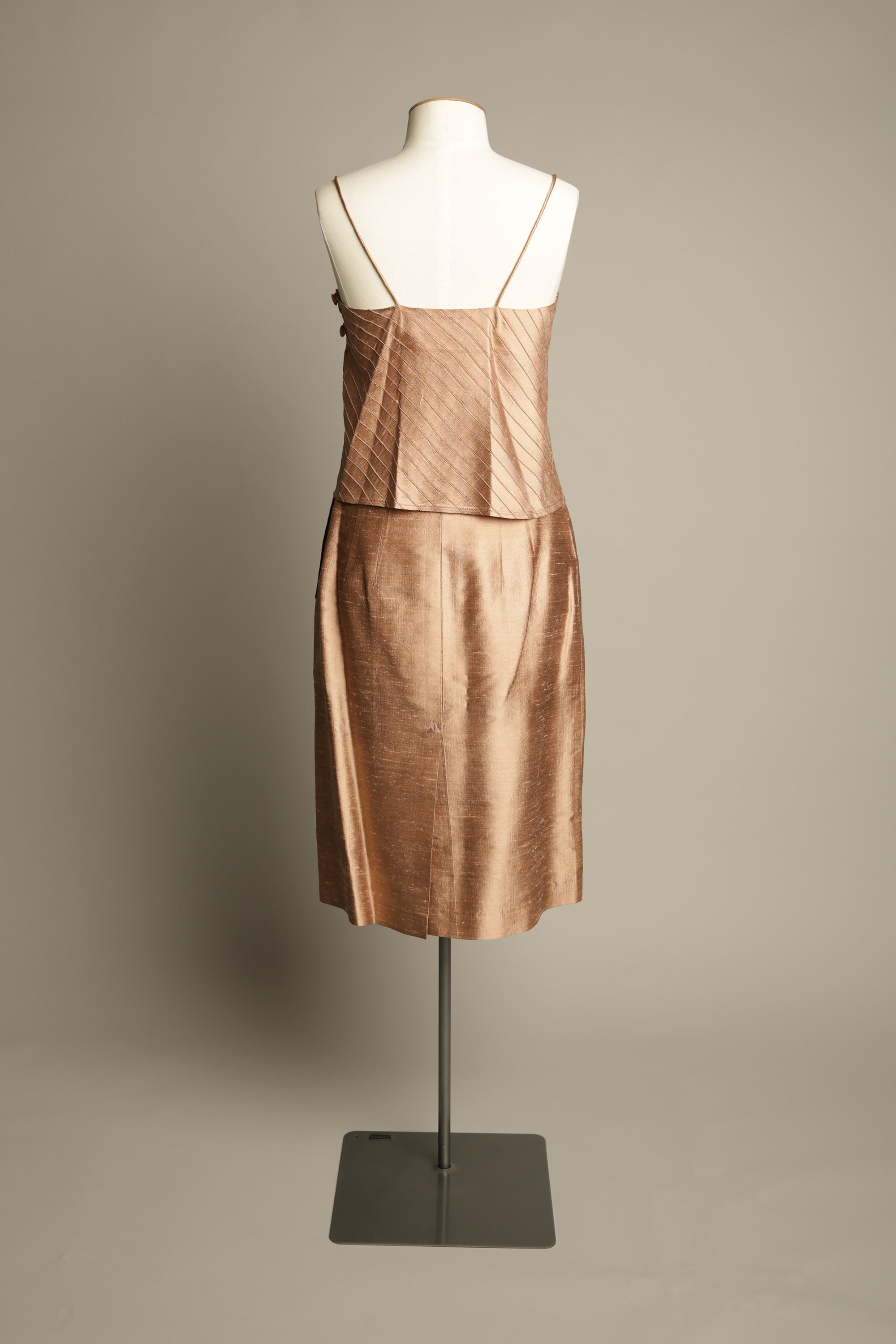 The jacket features scalloped lapels and the top has rows of pin tucks.
