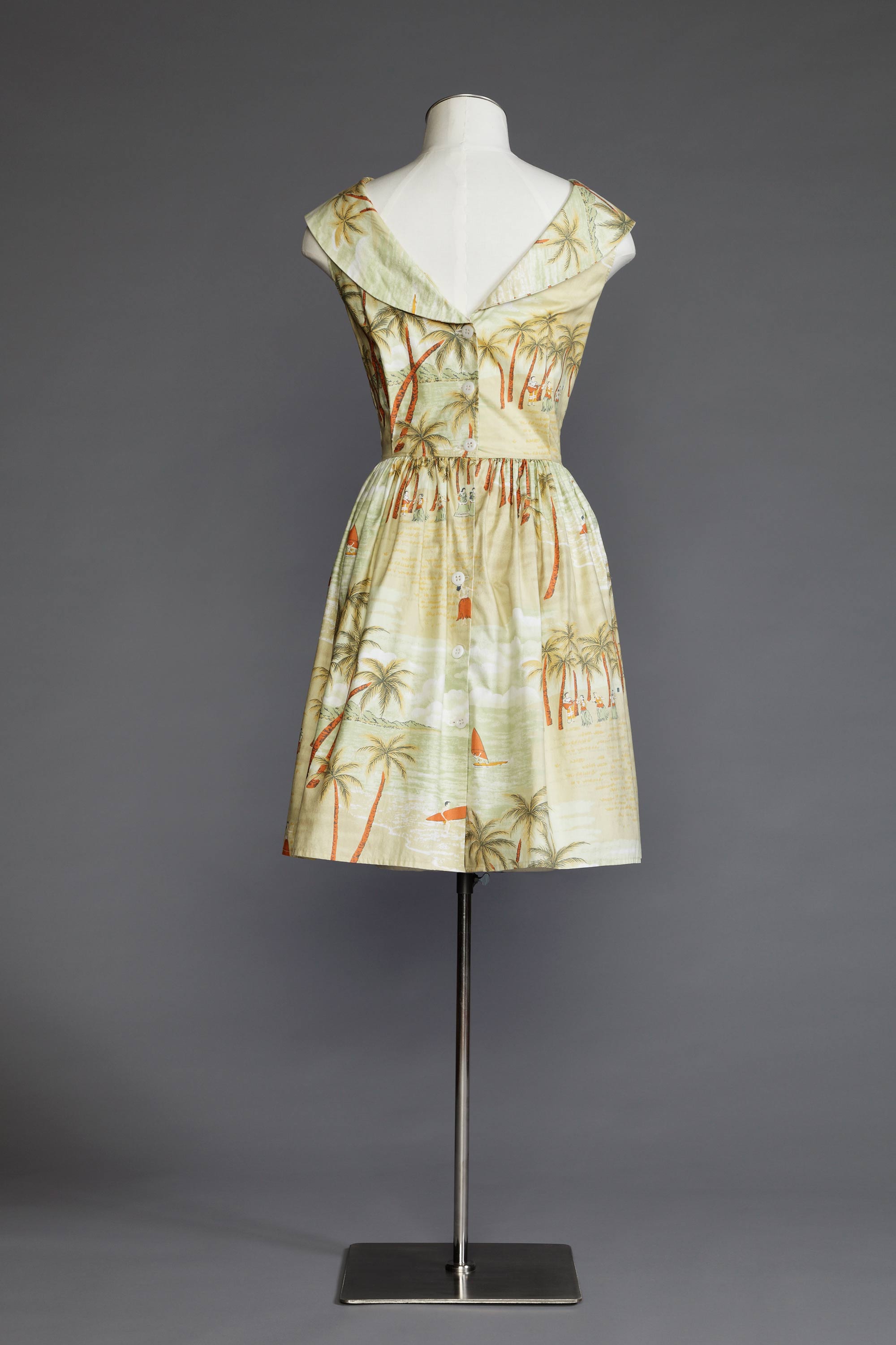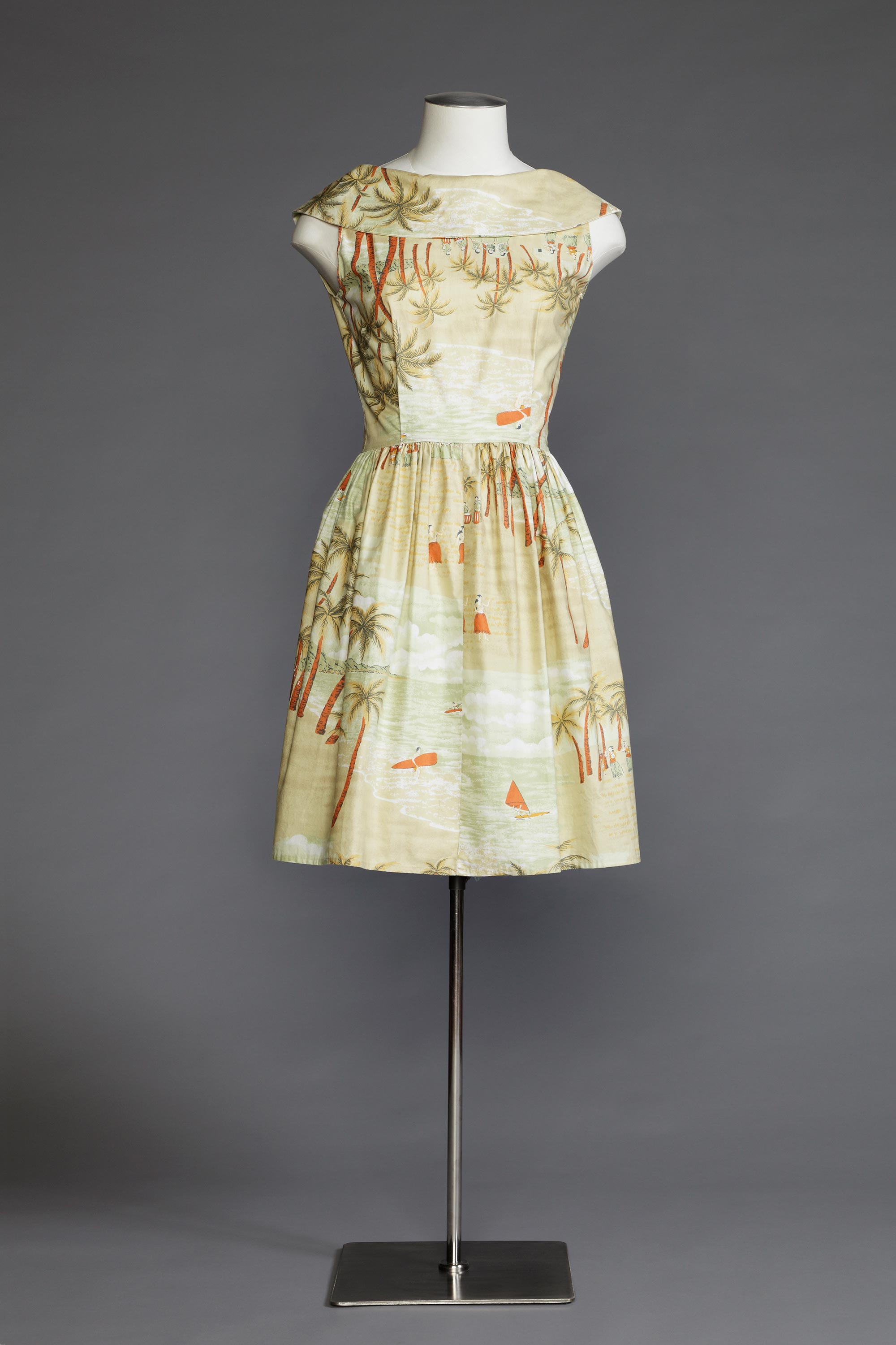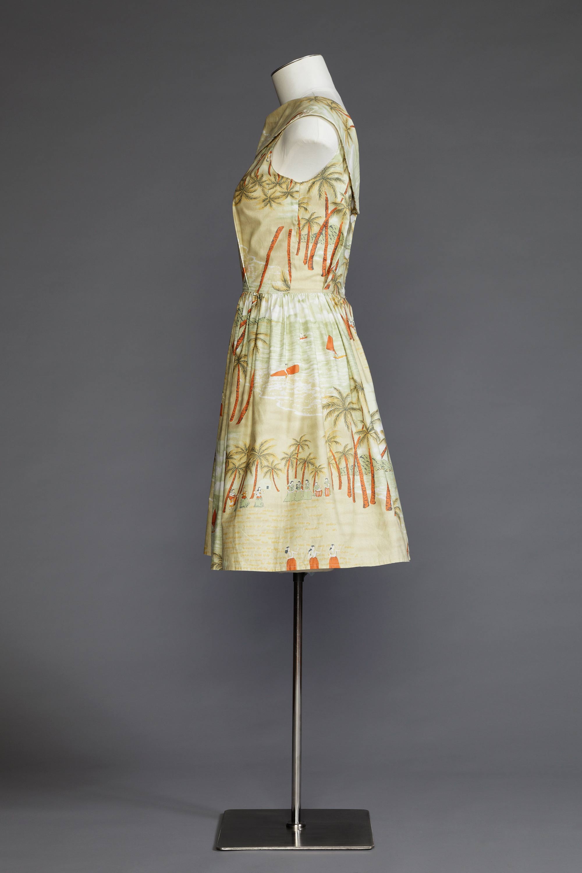 As a teenager, Dianne Ludwig spent many weekends with her Husqvarna sewing machine set up on the kitchen table, creating up-to-the-minute fashionable clothing. Dianne loved the immediacy of cutting, sewing, and finishing a garment within the space of a day and describes her attitude as "speed over accuracy", as the upside down bodice panel testifies. Dianne bought the fabric and pattern because she liked its 50s/60s styling, similar to that of the vintage dresses she was attracted to in op shops and at Auckland’s Cook Street Market. She put her own spin on the style, sometimes wearing this dress back-to-front. Read more about the history of home sewing in the New Zealand Fashion Museum publication Home Sewn.