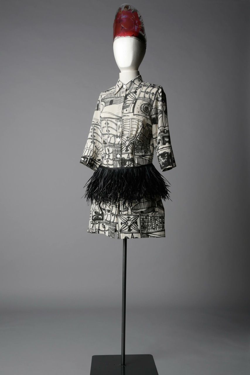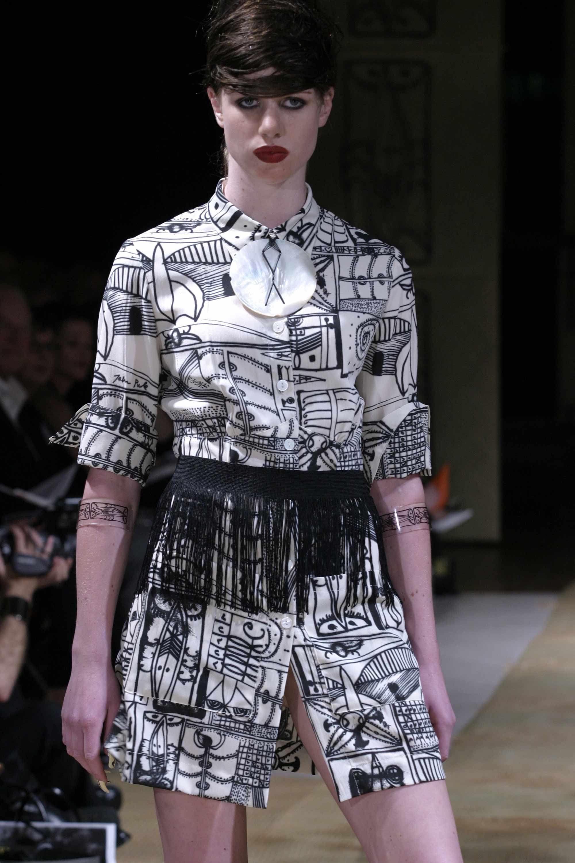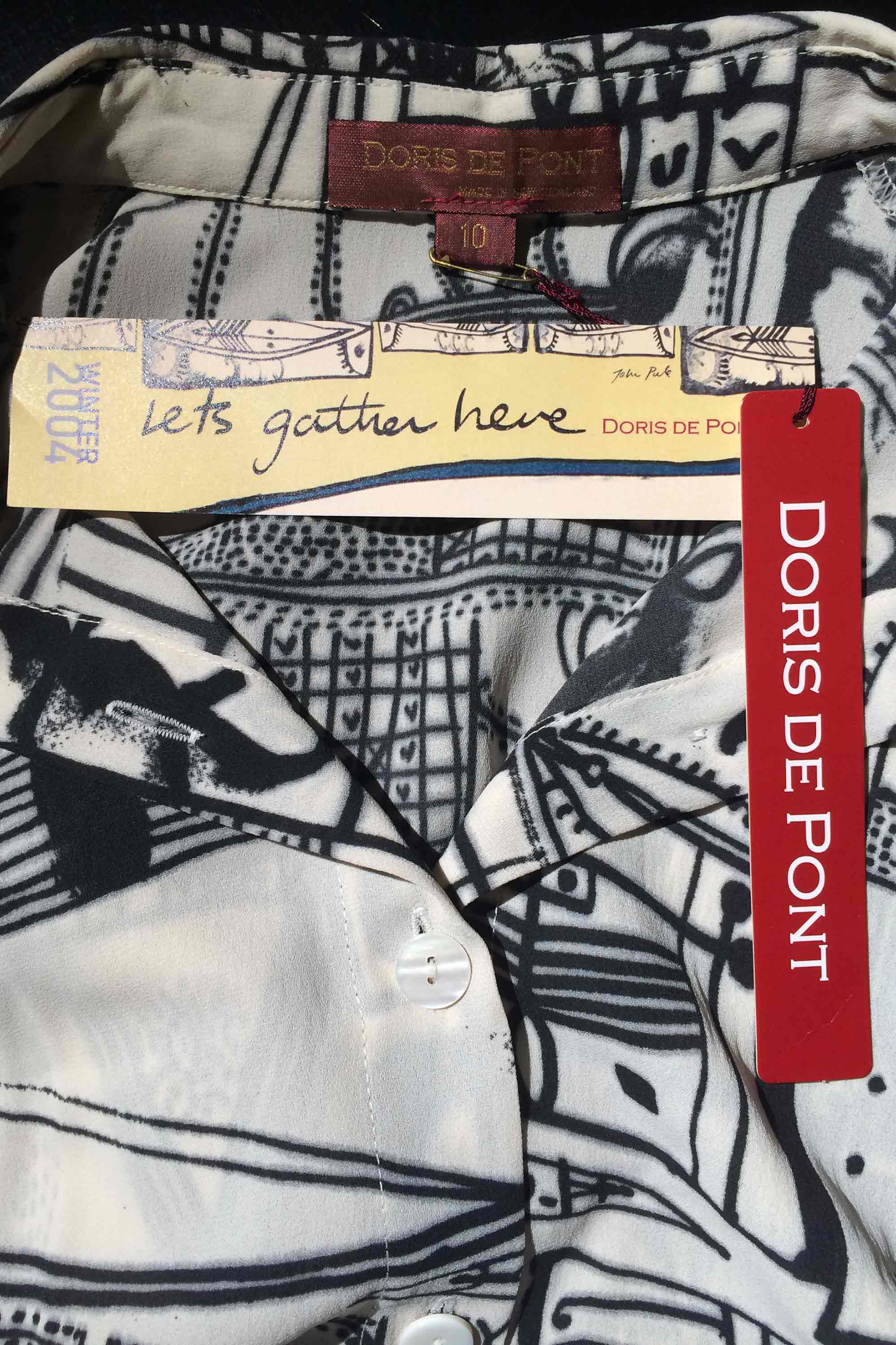 Doris de Pont's Let's Gather Here Winter 2004 collection was first seen at L'Oreal New Zealand Fashion week in an off-site show at St Kevin's Arcade on K Road. The soundtrack with music by Many Hands, an Auckland based group that mixes highland bagpipes, Rarotongan log drums, Chinese Guzeng, electric and acoustic guitars, flute and many other instruments created a sound perfectly suited to the theme of coming together. "With Auckland landmark, the Skytower, illuminated in the background the atmosphere was perfectly suited to the theme, Let’s Gather Here, in a place where all races, cultures and genders mix to celebrate their individuality and the cultural enrichment that diversity can generate if we embrace it," Doris says. Born in New Zealand to Dutch immigrant parents, Doris has always been interested in identity and the power of clothing to give expression to that. The Let's Gather Here collection was an opportunity to find and express herself after nine years designing under the label, DNA. "I found the right message to celebrate reclaiming my name and identity in the work of contemporary Niuean/New Zealand artist and writer John Pule." His work was used to create the prints for this collection. Inspired by her creative environment, Auckland’s colourful and multi-cultural K Road where she had her studio, Doris named all the pieces in the collection after places on the street. While the garments are conventionally European, their styling is inspired by Polynesian dressing where, in contrast to the western ideal, the fullness of the waist and hip are accentuated with overskirts and titi. The prints play with the imagery of the Pacific with graphic patterns that reference tattoo and the use of fine needlecord, which is printed to look like tapa cloth. Margo Barton made the headdress. Garments and accessories from the Let's Gather Here collection are in Te Papa Tongarewa Museum of New Zealand and the National Gallery of Victoria. The Superette shirt and titi are in the collection of the Auckland Museum.