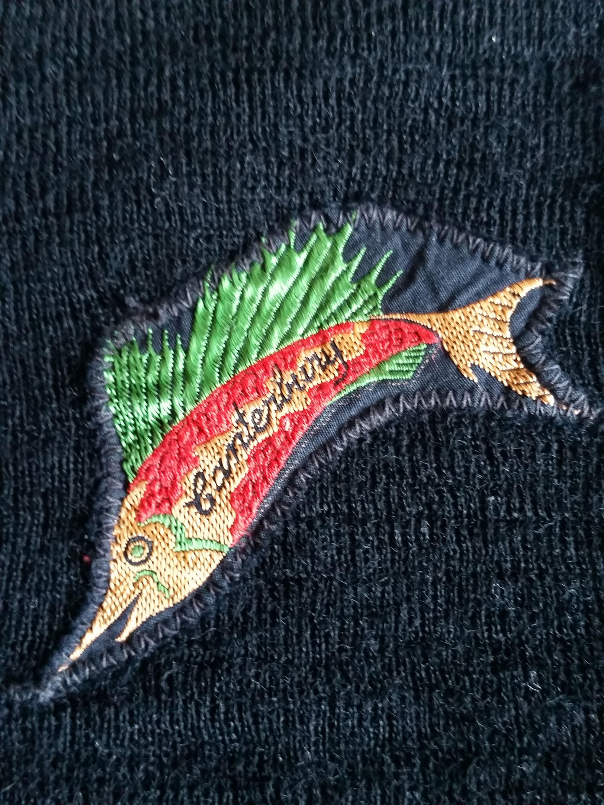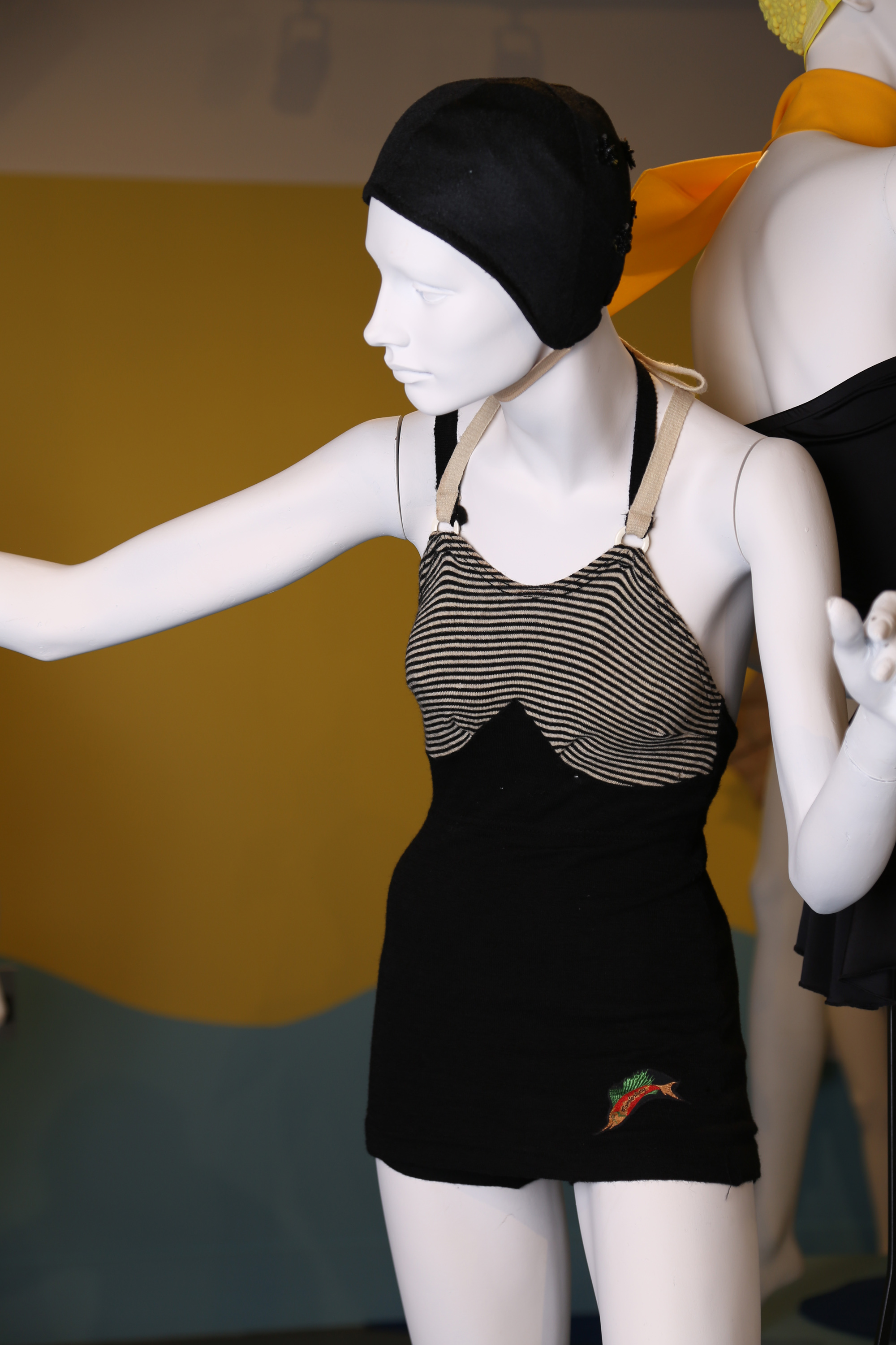 This swimsuit was made by New Zealand manufacturer, Canterbury. It has an embroidered badge of a flying fish and the name 'Canterbury' stitched to the front at the lower hem. The strap colours alternate and are attached to the suit with moulded plastic rings.