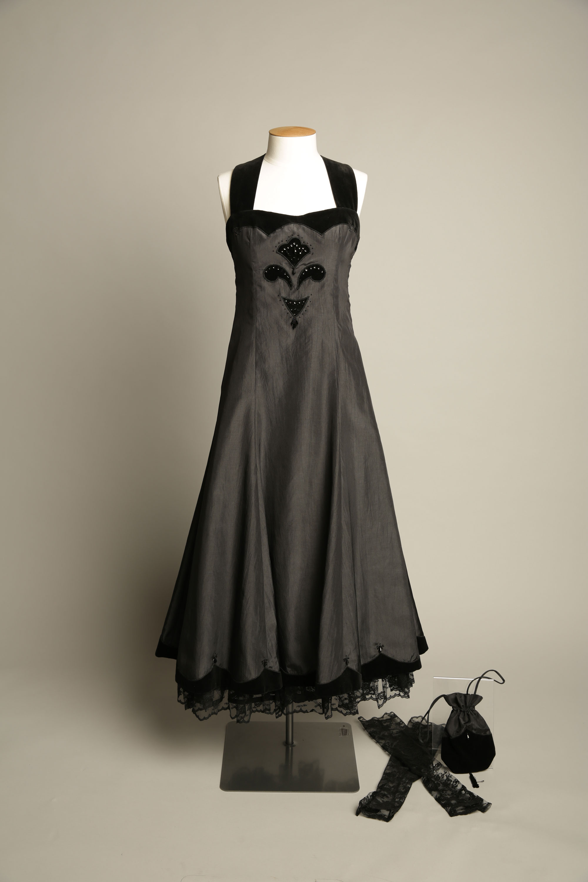 Evening dress, gloves, drawstring bag