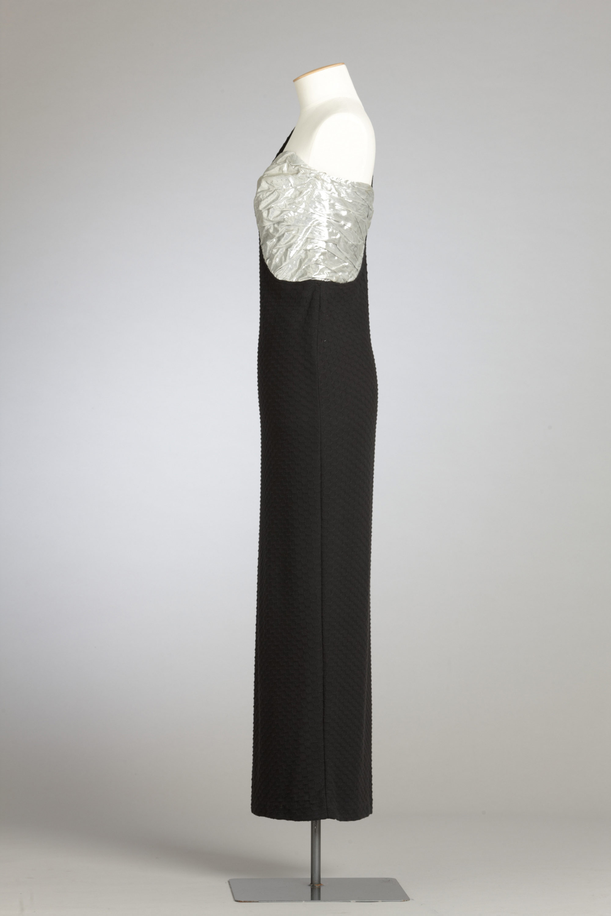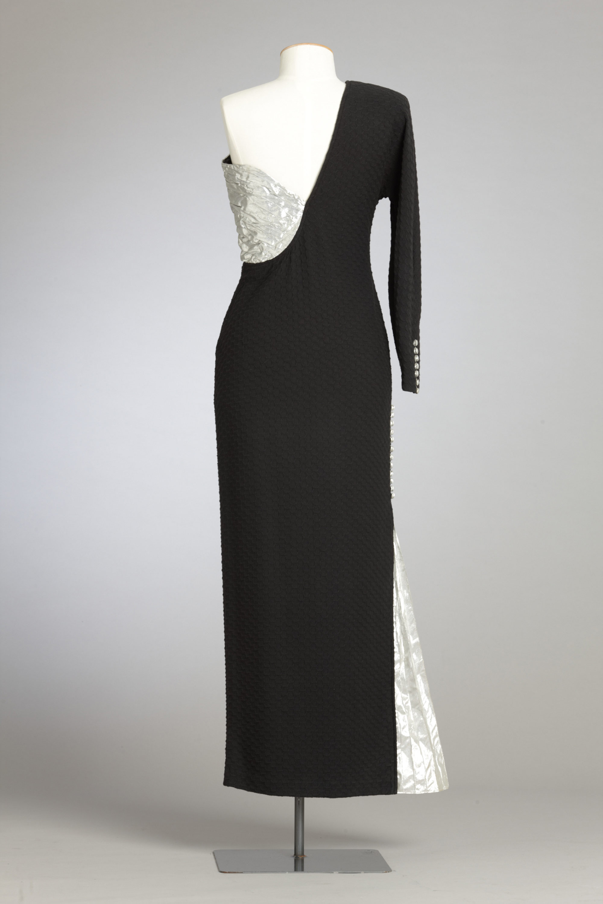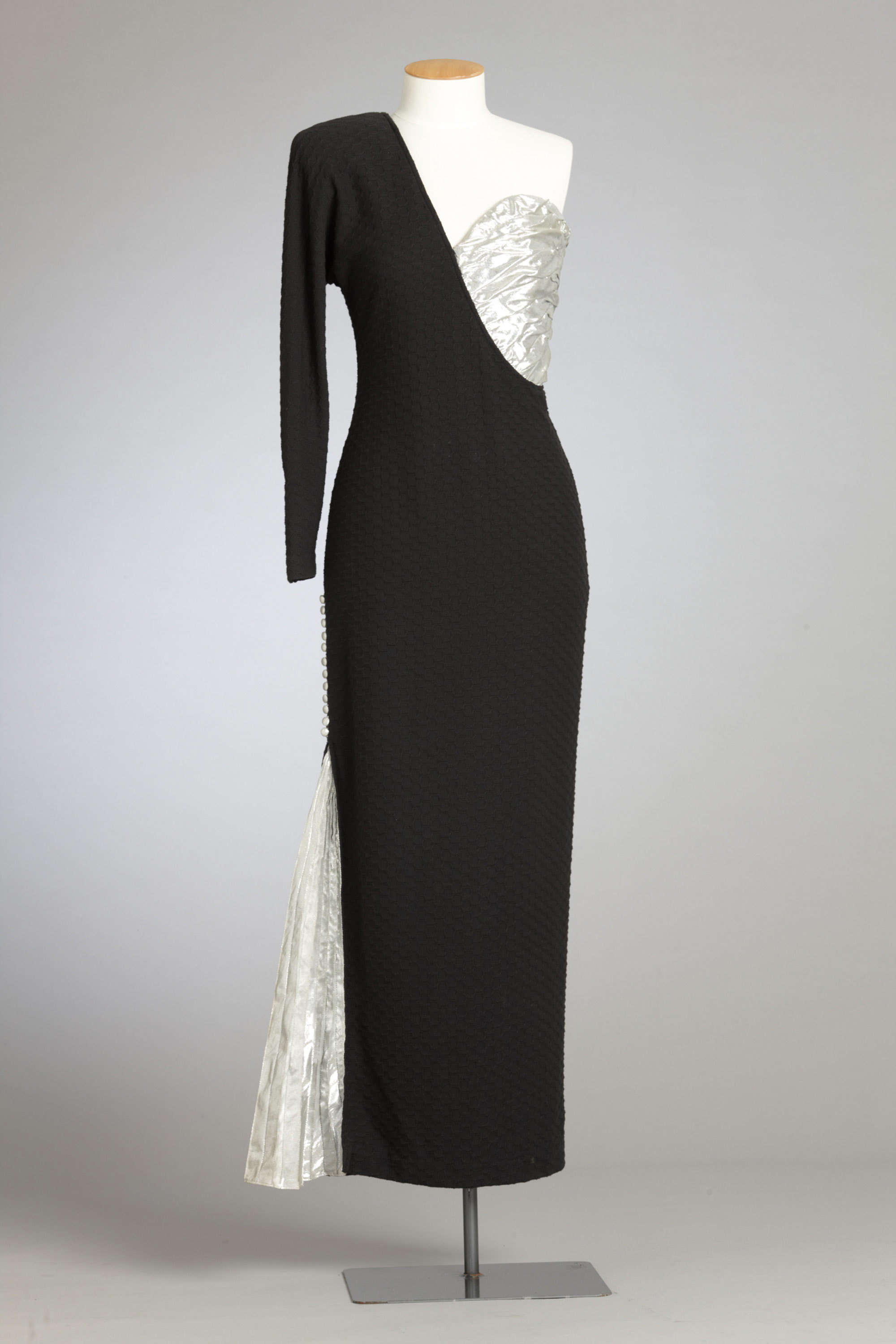 were broadcast on national television. Although this dress failed to make the final three in the awards, it charmed Stephanie Tattersfield who bought it and wore it a lot and updated it by removing the original shoulder pad and adjusting the shoulder line. Read more about wearing the colour black in the New Zealand Fashion Museum publication Black: The history of black in fashion, society and culture in New Zealand.