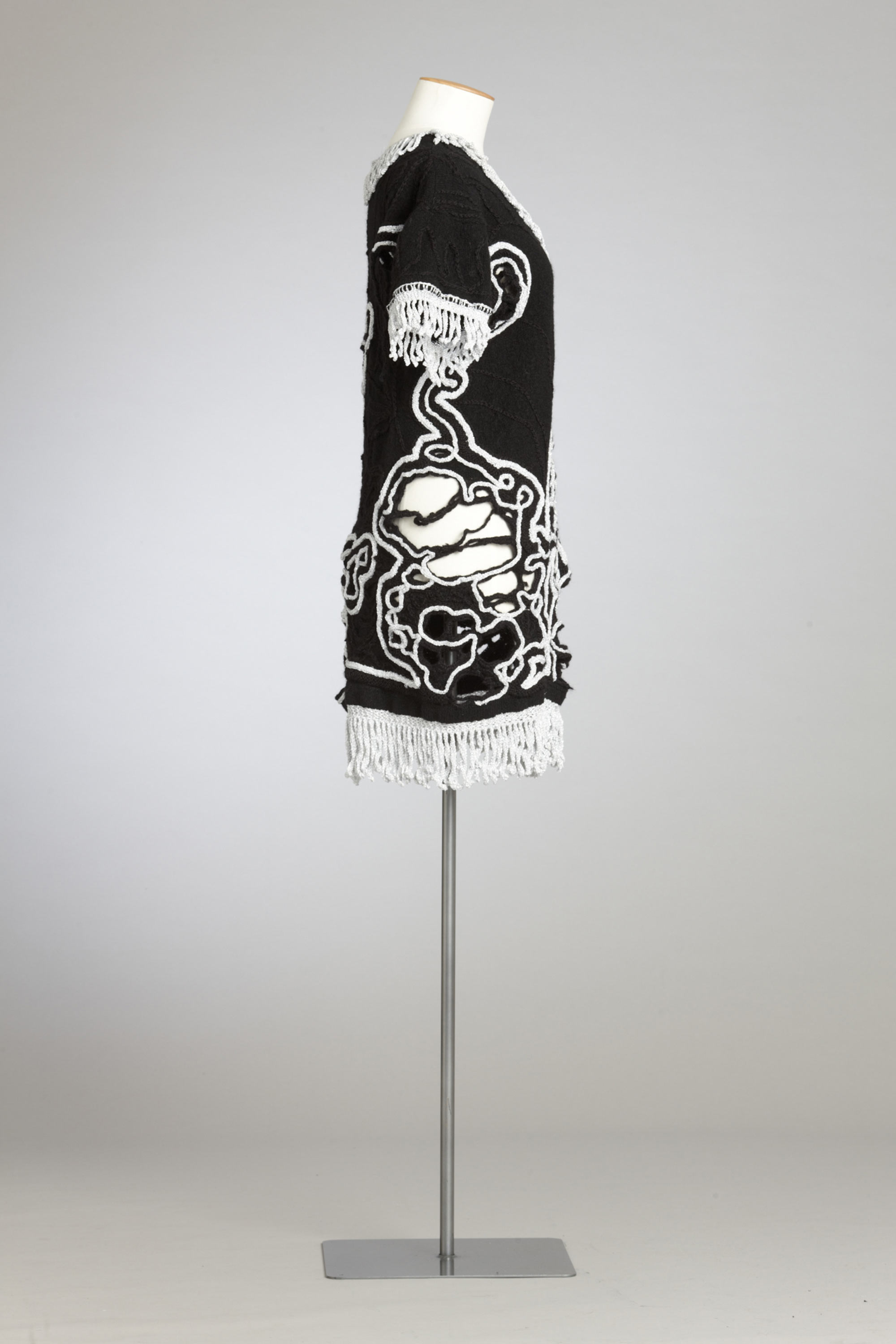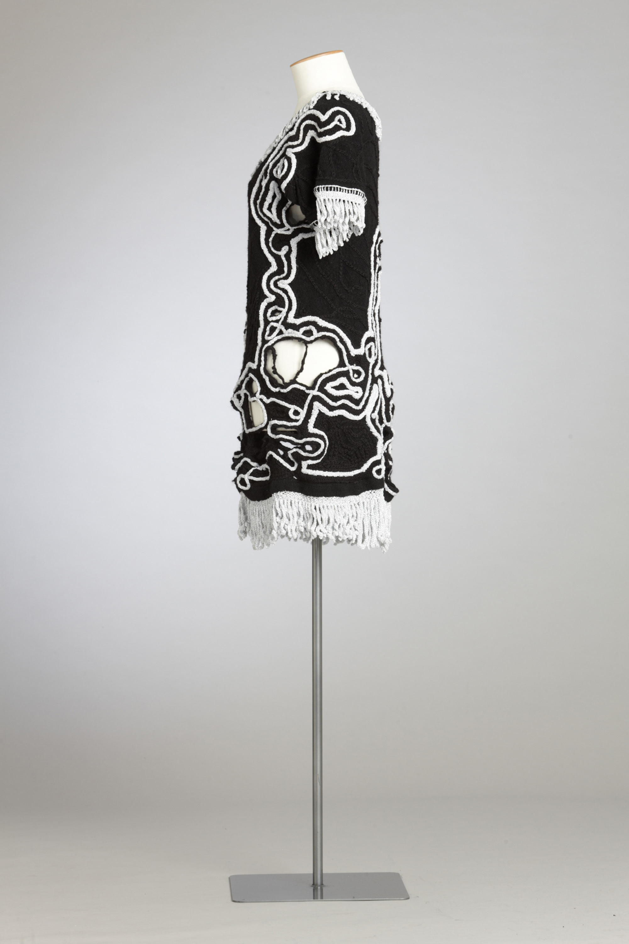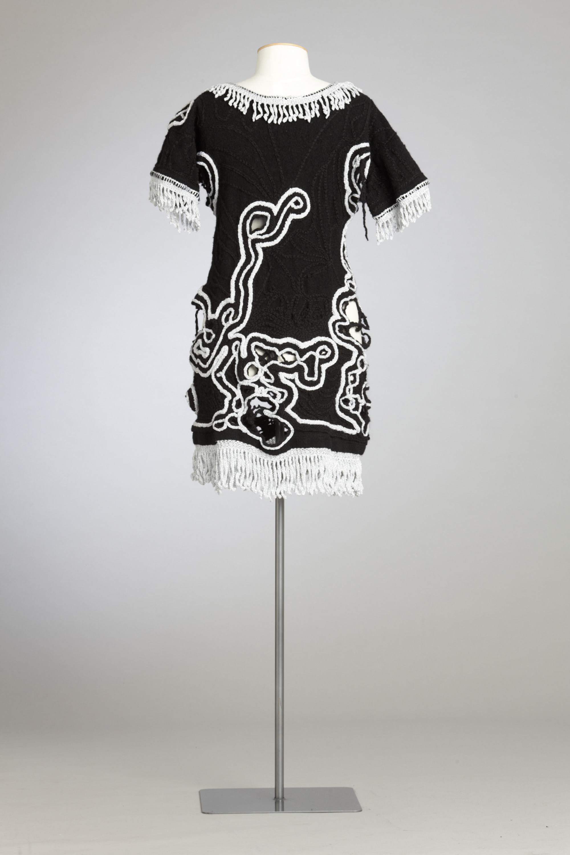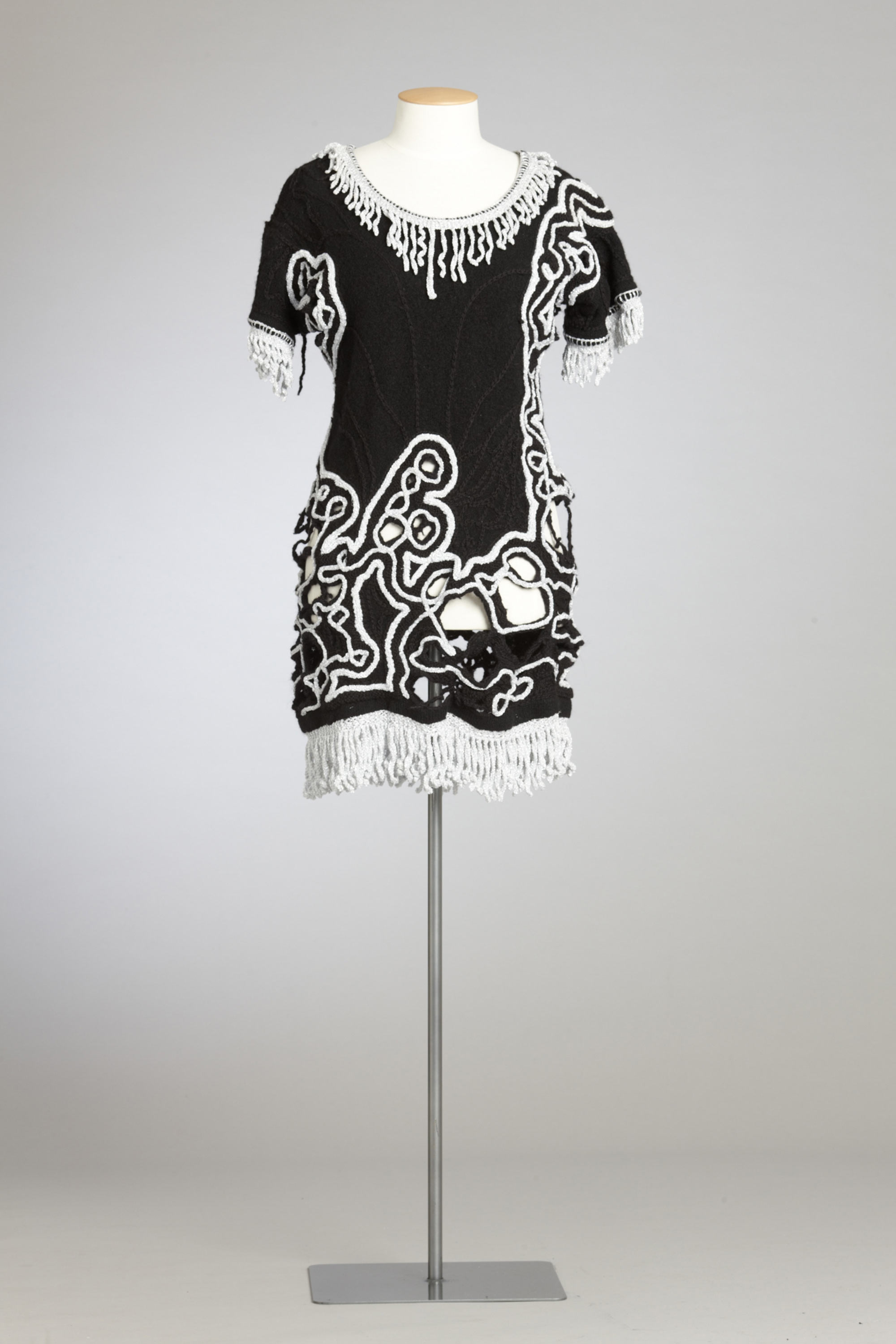 Old, worn, shearing singlets, traditionally men’s clothing, are transformed into women’s dresses by Anne Garvey from Te Kuiti. This garment was well received by the public, especially if they had background links to farming and recognised the singlets for what they once were, she says. Labelled 'up-cycling', recycling old farm clothes creates environmental awareness and eco fashion as a reflection of current trends. The singlets are taken from their original rural context to become clothing that is "social outing/urban chic". The original work-worn holes became an integral part of the re-design when reinforced with stitching and embellished. The only stumbling block Anne encountered was the labour-intensive method of construction. Read more about wearing the colour black in the New Zealand Fashion Museum publication Black: The history of black in fashion, society and culture in New Zealand.