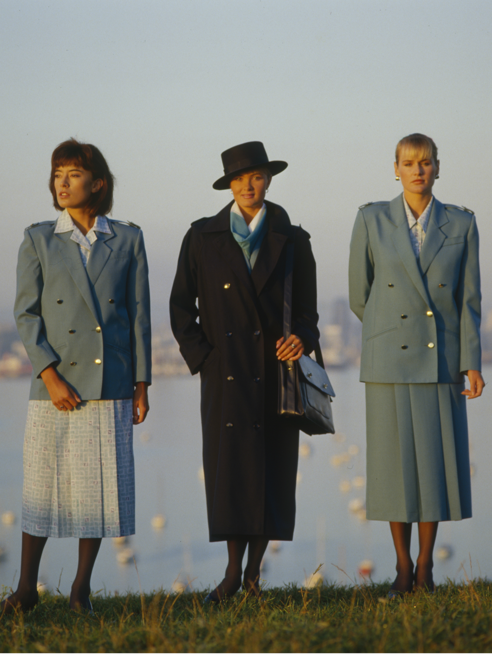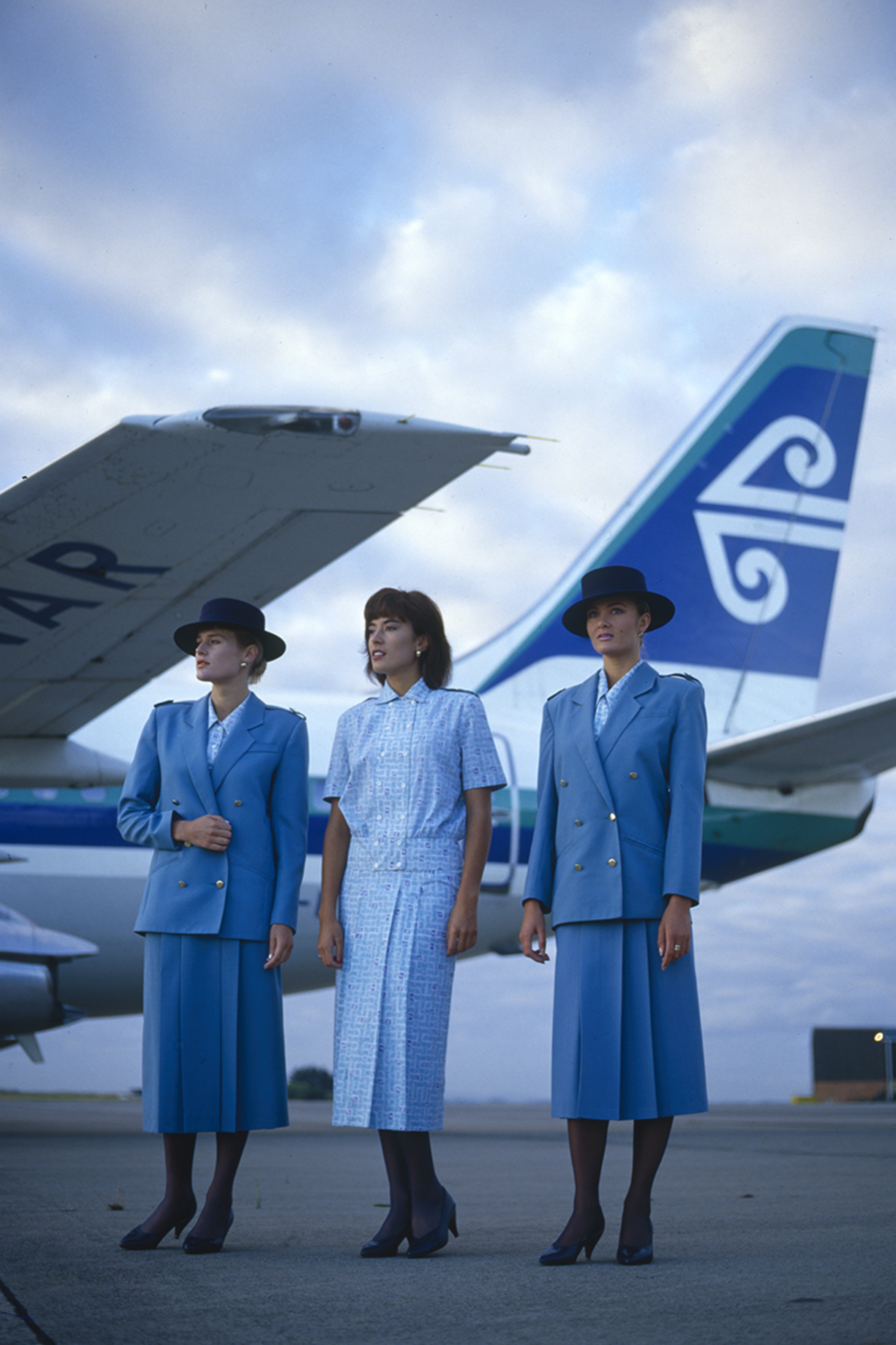 New Zealander Isabel Harris of Thornton Hall designed the new uniform range for female shorthaul and longhaul cabin crew introduced in August 1987. The collection had many combinations using the basic colours of teal and navy. The blouse and skirt were made from poly-cotton featuring a patterned print with a subtle Koru motif in random squares of navy and teal on a white background. The top blouses to a hip basque featuring a narrow, double-breasted front and could be worn buttoned up to the neck or opened to reveal a smart rever. Blouses in the dress uniform were in mid-teal and were complemented by a double-breasted jacket with brass buttons and epaulettes. The skirt had a slightly elasticised waistband and had two pleats in the front for ease of wear. The jacket and skirt were made from a poly-wool fabric containing 70 percent wool. The navy blue coat was made from a poly-wool gabardine that also had a high wool content and a double breasted button front with epaulettes. Two silk scarves - one long and other square, both featured navy blue, teal and white with a subtle koru motif.