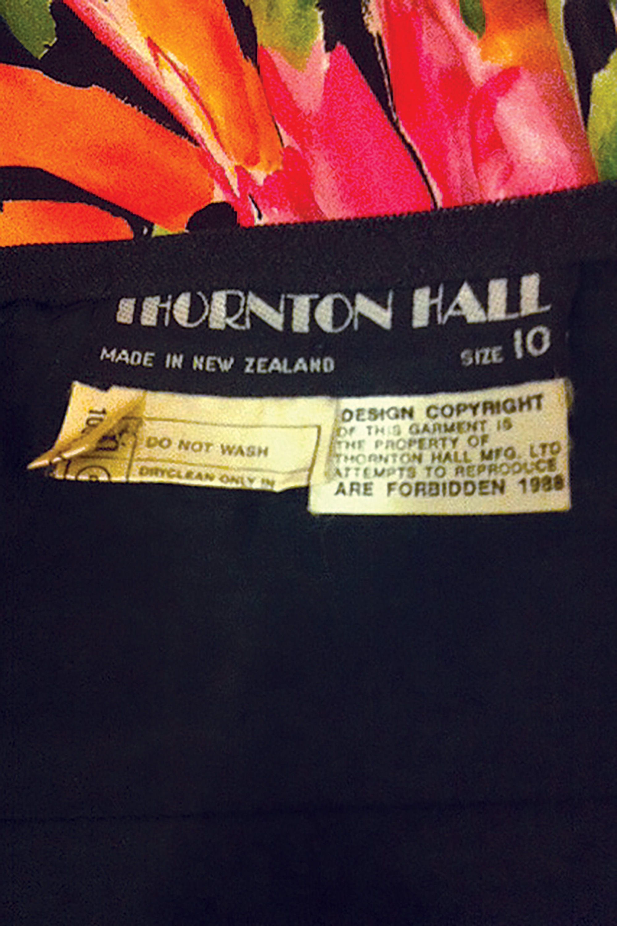 The label on this Thornton Hall dress reads: "Design copyright of this garment is the property of Thornton Hall Mtg Ltd. Attempts to reproduce are forbidden 1988." Thornton Hall’s success was to come at a commercial price though with some local manufacturers and home sewers copying the designs. Eventually the copying got to a point where owners Isabel Harris and Brian Hall decided to take legal action in a case that made New Zealand law history in 1988. The case was decided in Thornton Hall’s favour and contributed to the creation of the Copyright Act in 1994.
