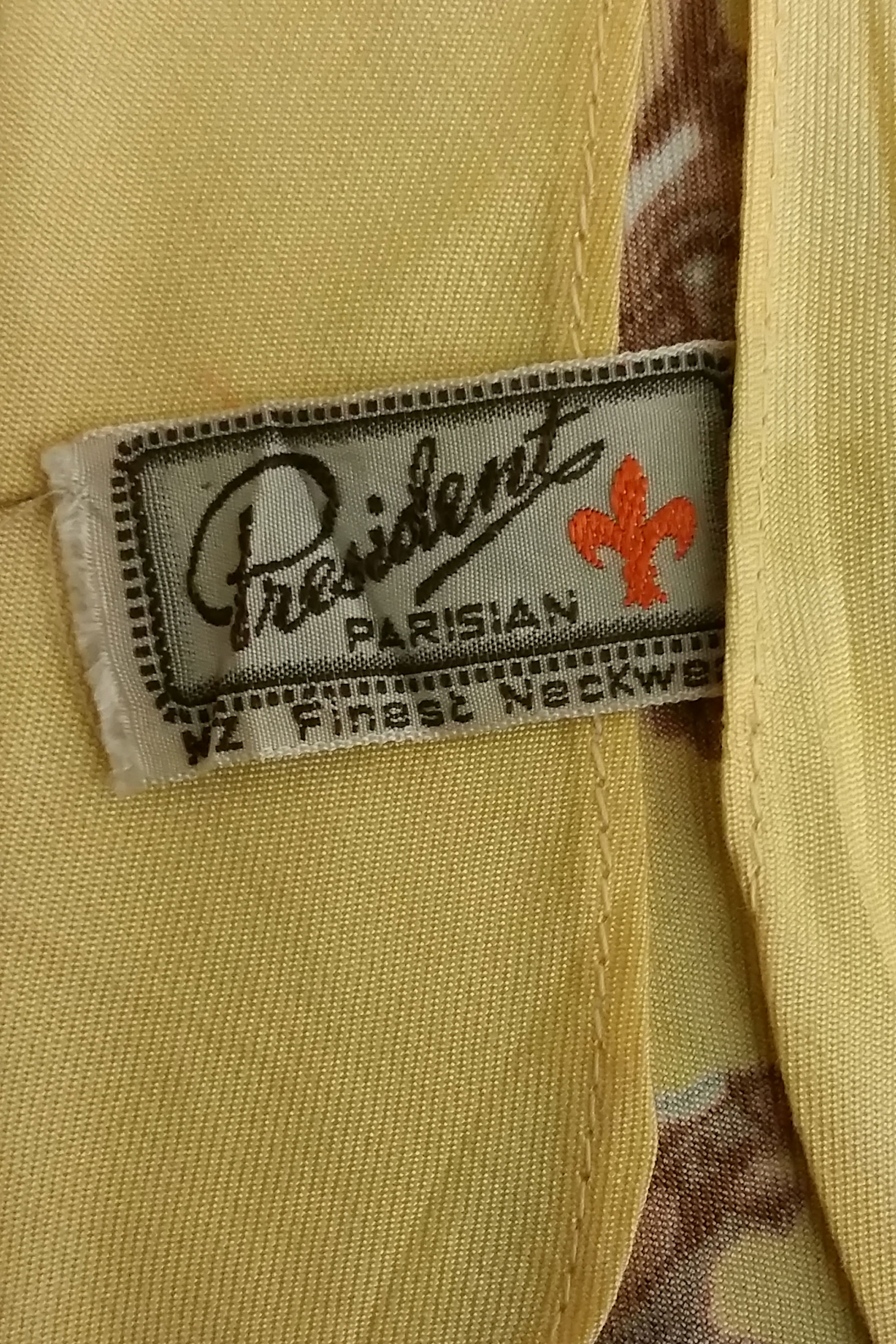 Parisian Neckwear was established in Auckland in 1919. This tie, which is labelled 'President' was made in the 1920s. It is unlined and cut more like a scarf than a modern tie.