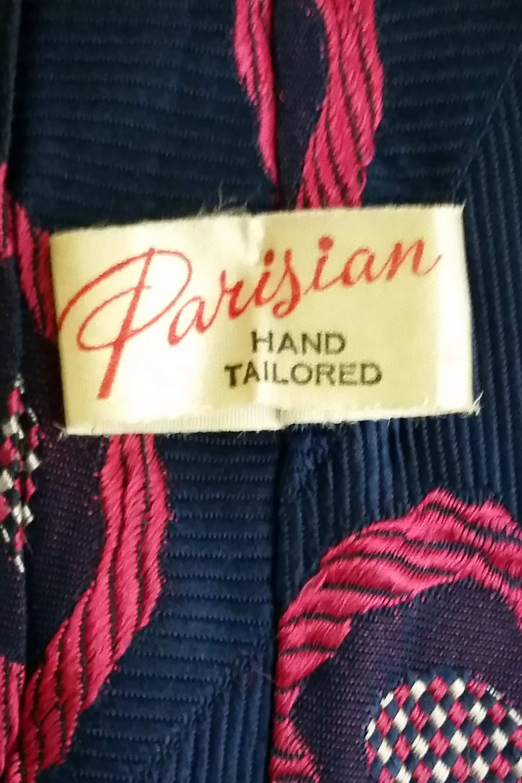 Parisian Neckwear was established in Auckland in 1919. This tie was made in the 1930s in the Parisian workroom located on Lorne Street in Auckland. By the 1930s, the Parisian label was a household name with 'Parisian Neckwear' being sold in retail and department stores throughout New Zealand.