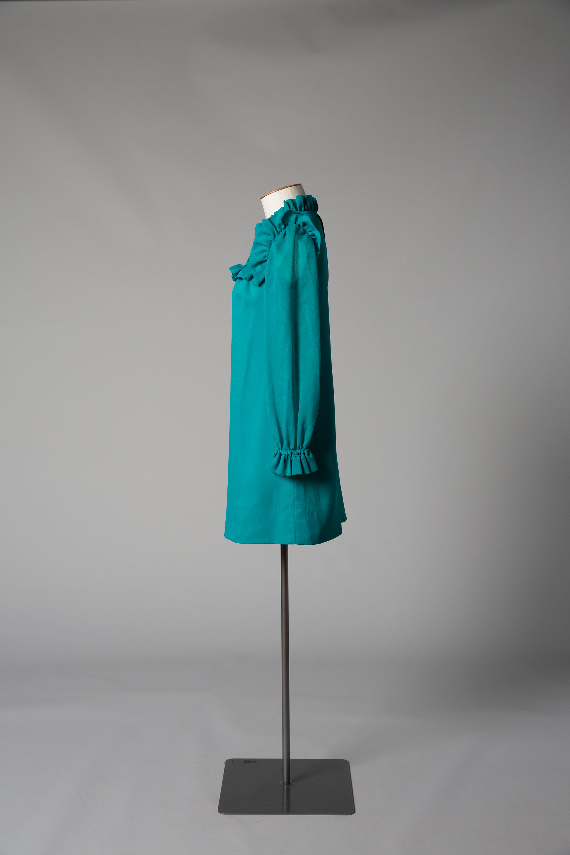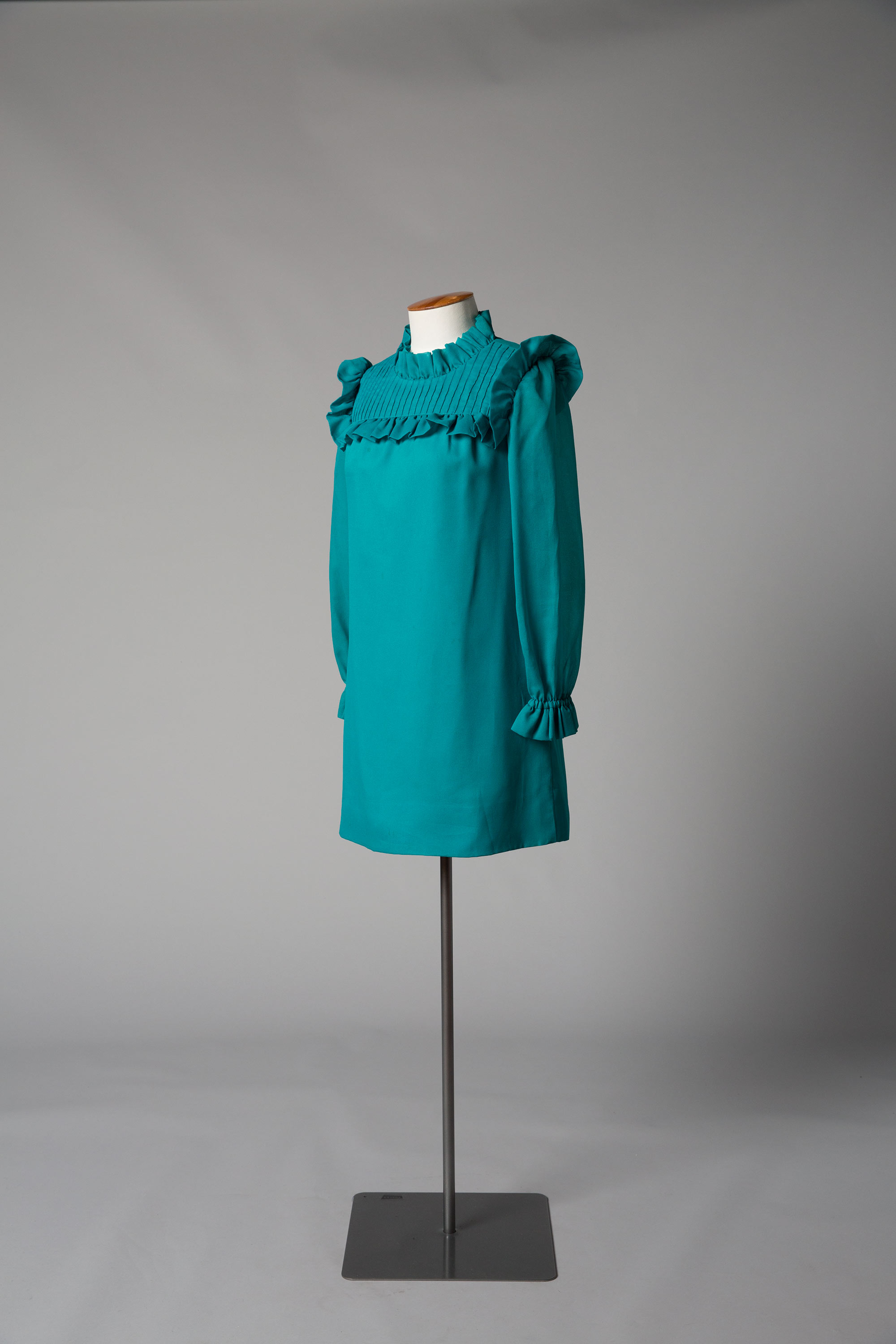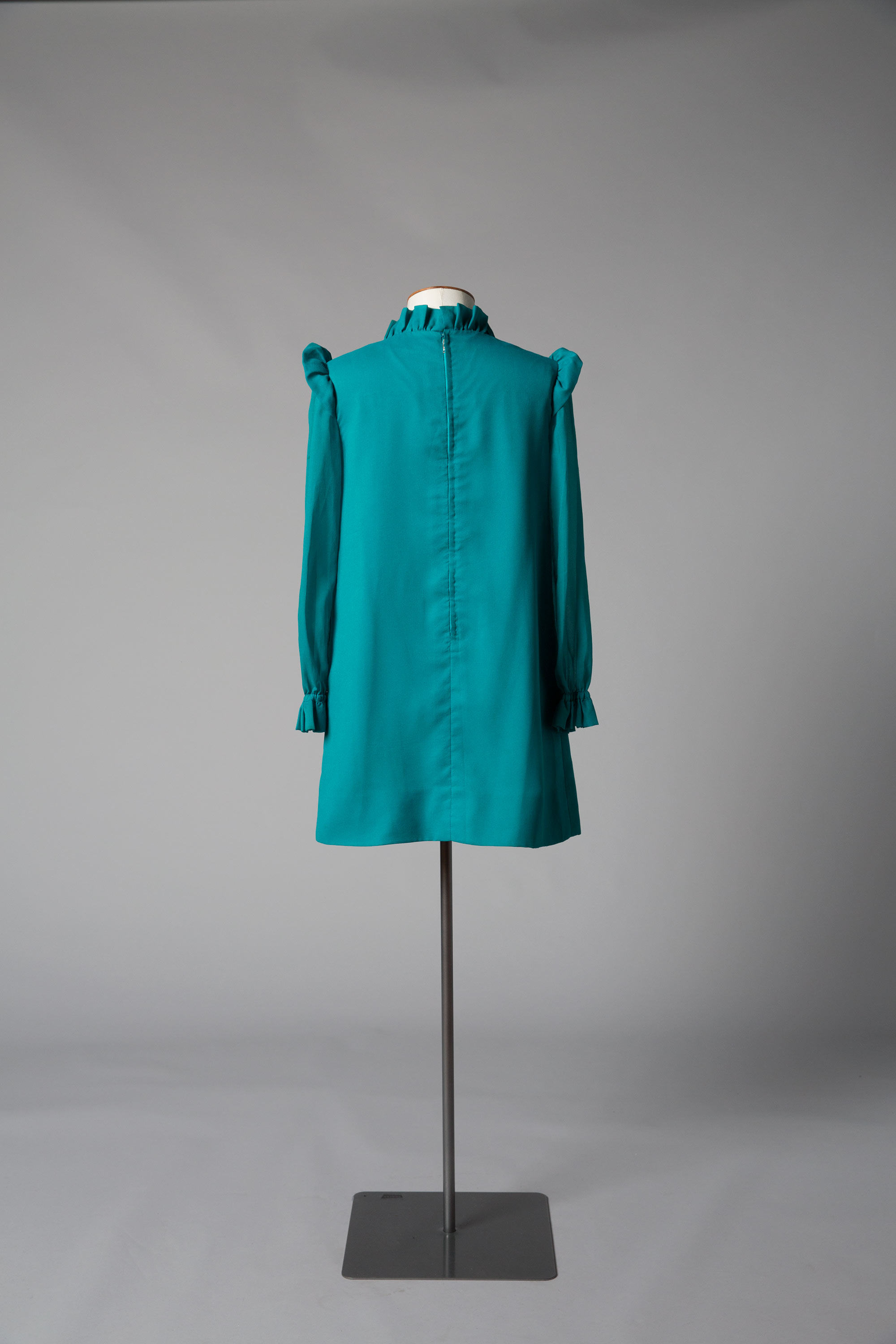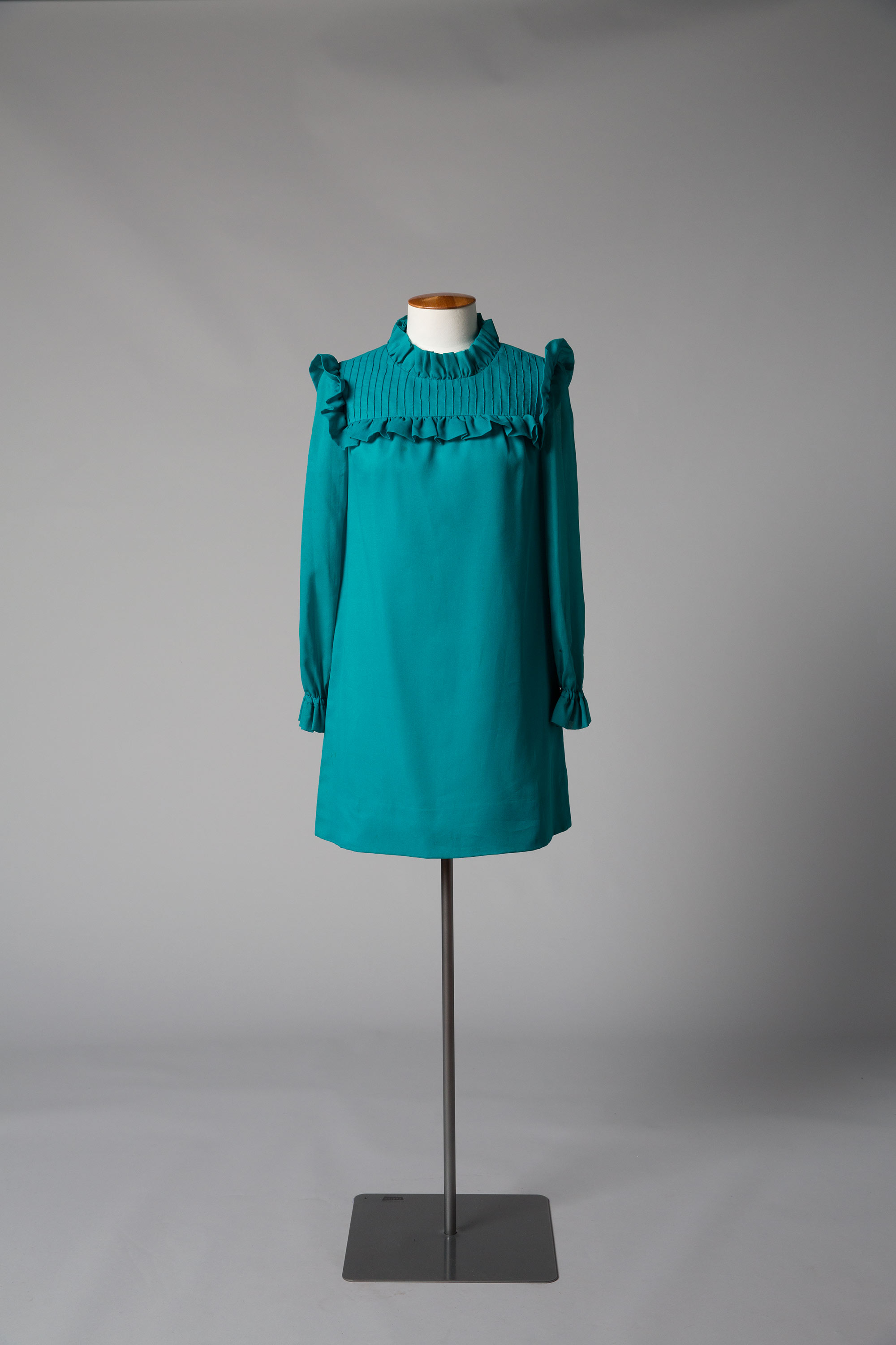 This A-line mini dress has ruffles, a pintucked yoke and sheer sleeves. The back zip is hand stitched in.