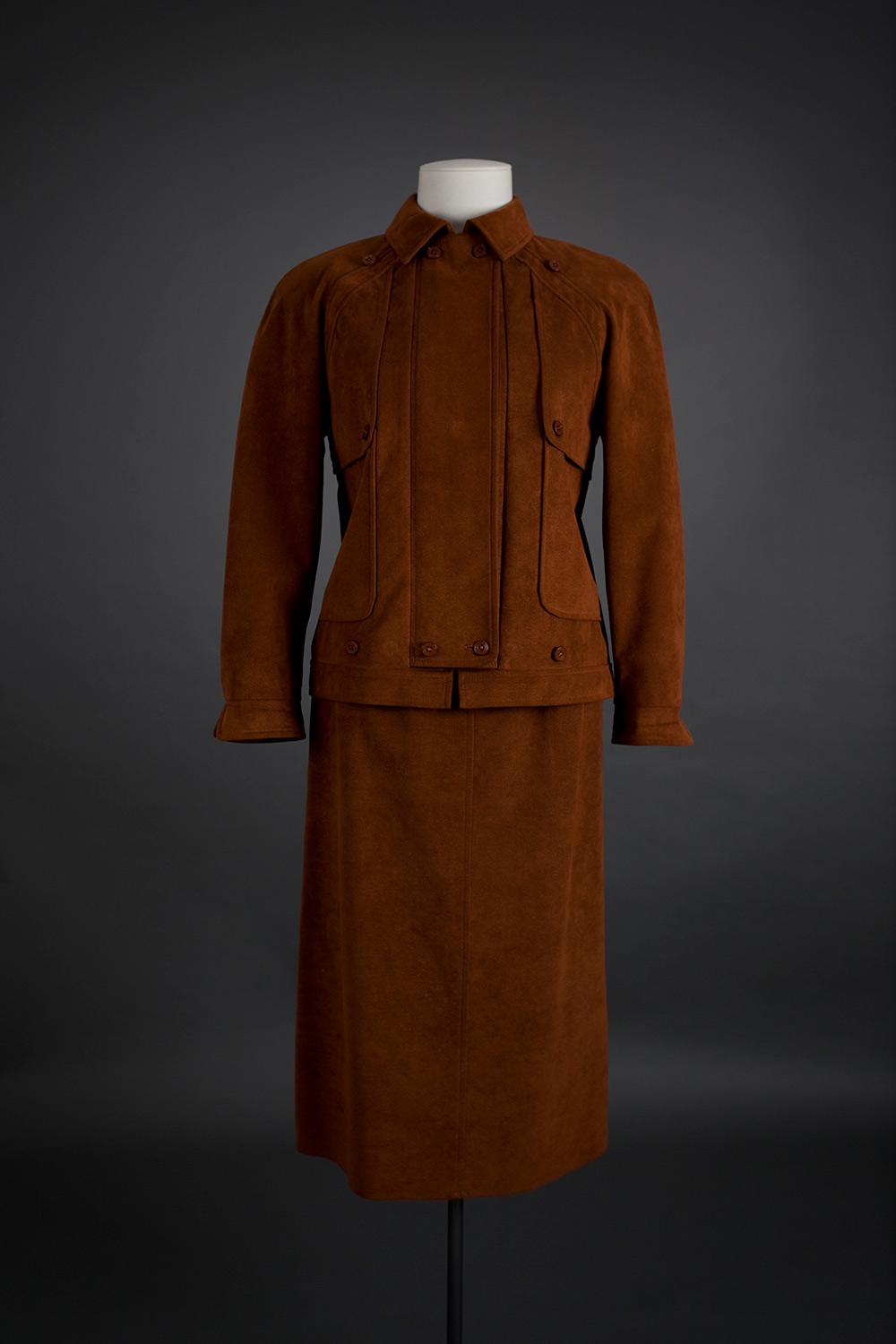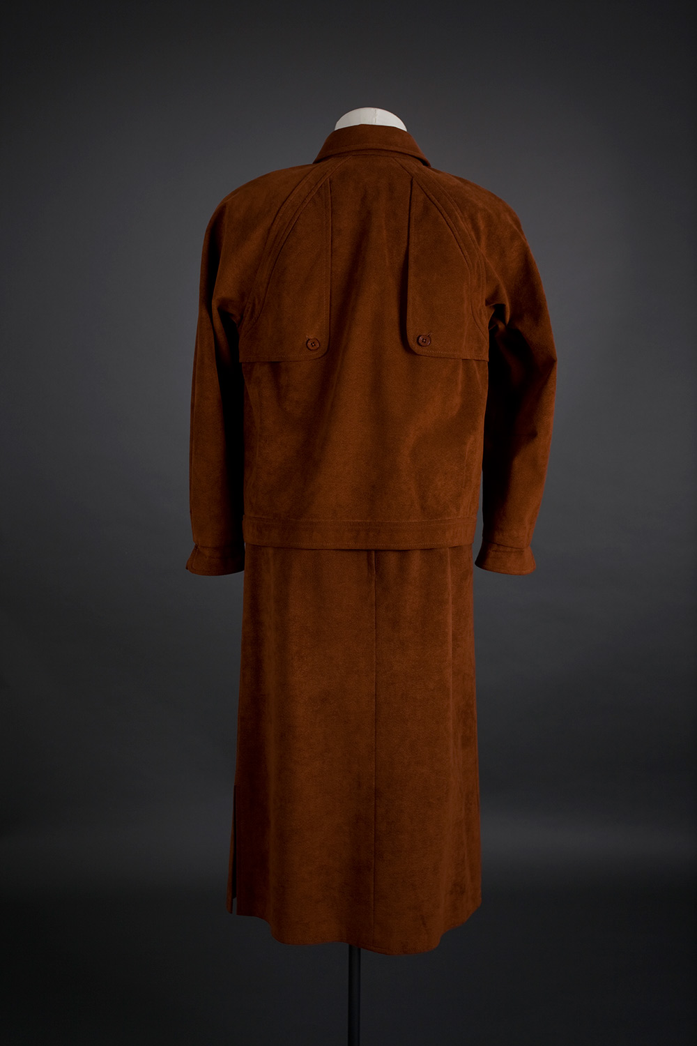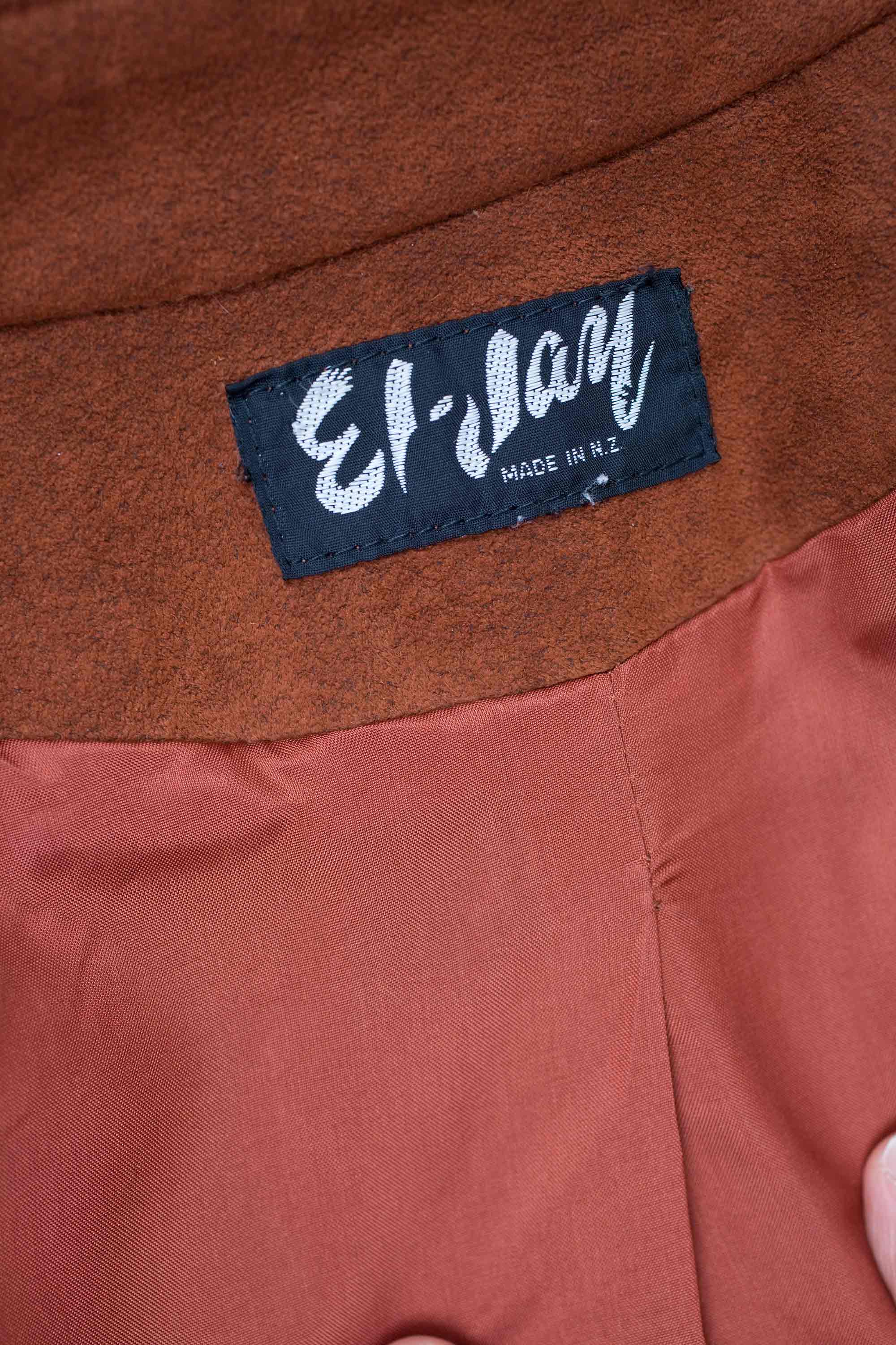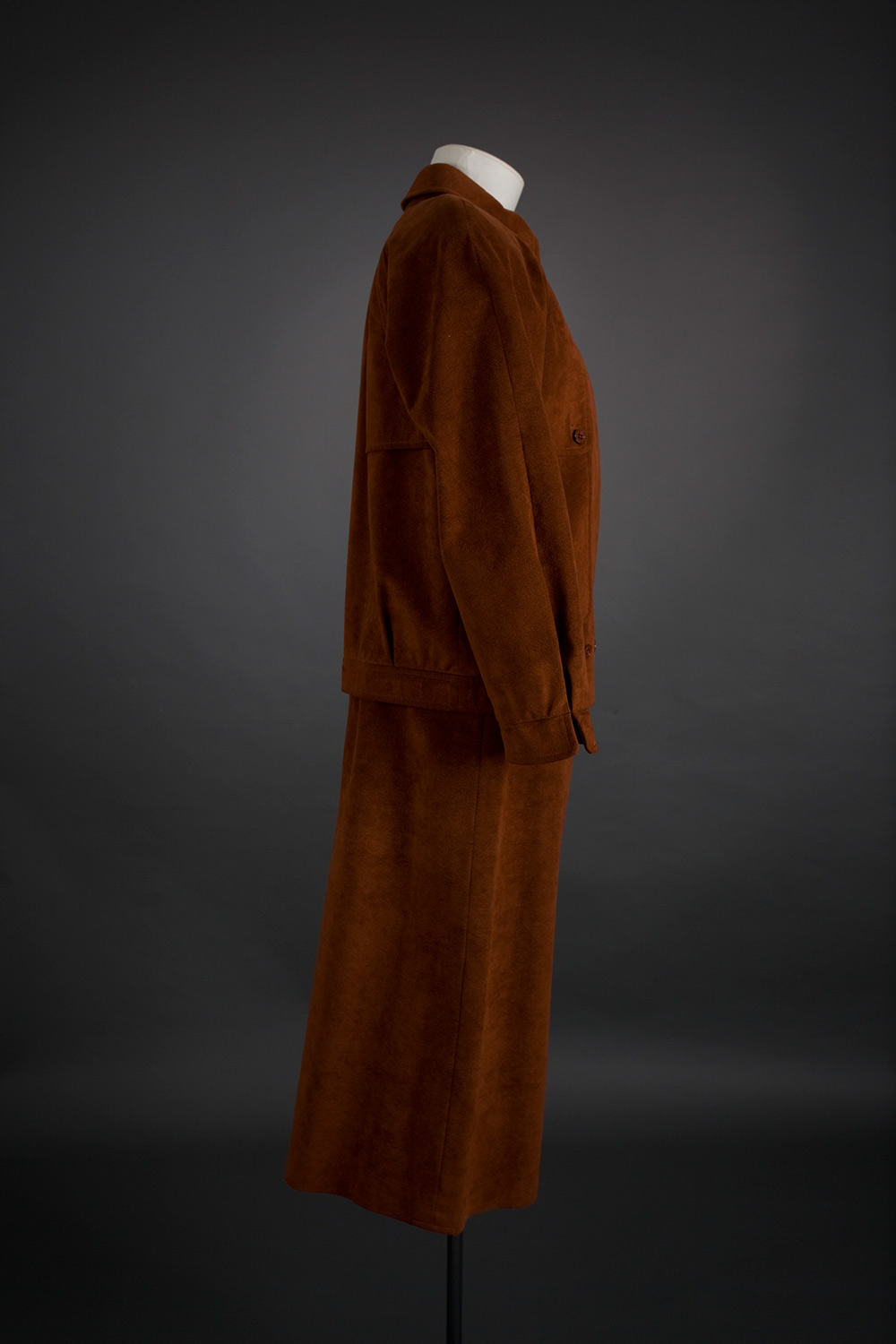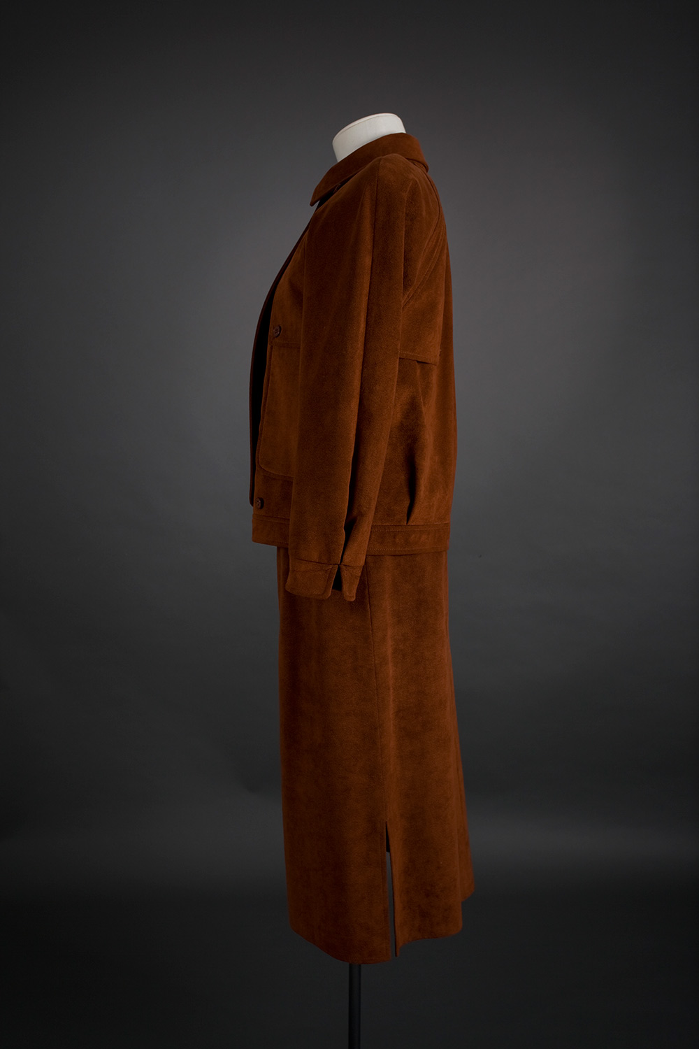 As the saleswoman for ultrasuede, Gwynne Hoskins, Kathy Hoskin’s mother in law, not only sold it successfully but also wore it and has a large number of distinctive pieces. This style was photographed for an Ultra Suede advertising campaign. Read more about Gus Fisher and the El Jay label in the New Zealand Fashion Museum publication Looking Terrific: The story of El Jay.