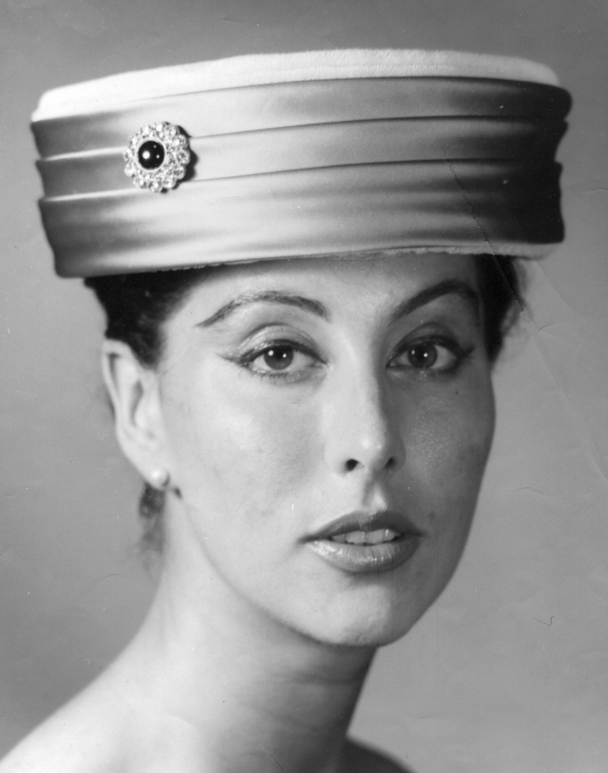 Lindsay Kennett started as a milliner in the early 1950s, going on to become one of the main wholesalers of model hats to stores around the country. From his Auckland workroom, he produced two seasonal collections per store per year. Every design was different. This hat is modelled by Robyn Garland. The photo was taken by Ted Mahieu, not long after he went out on his own as a commercial and fashion photographer.