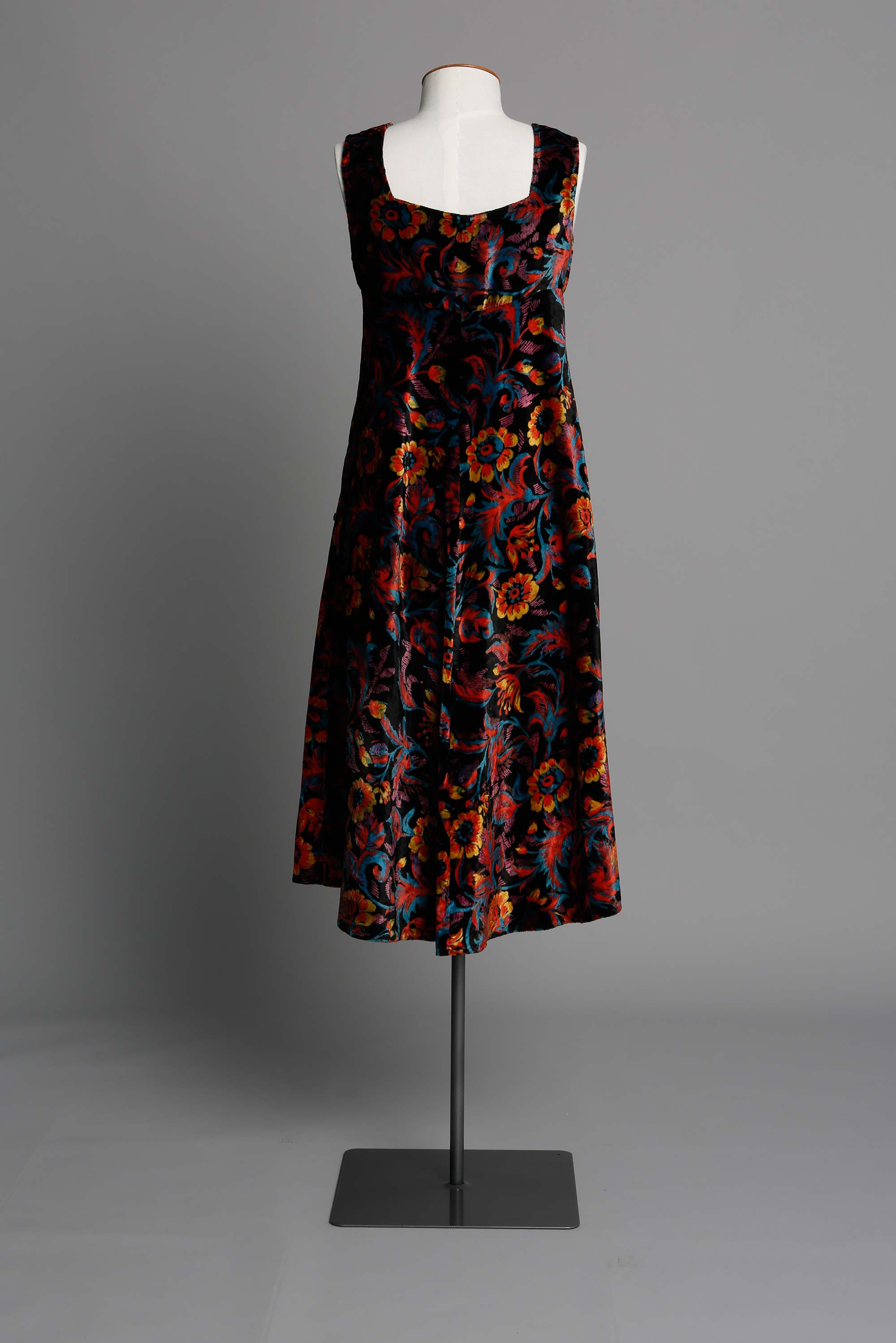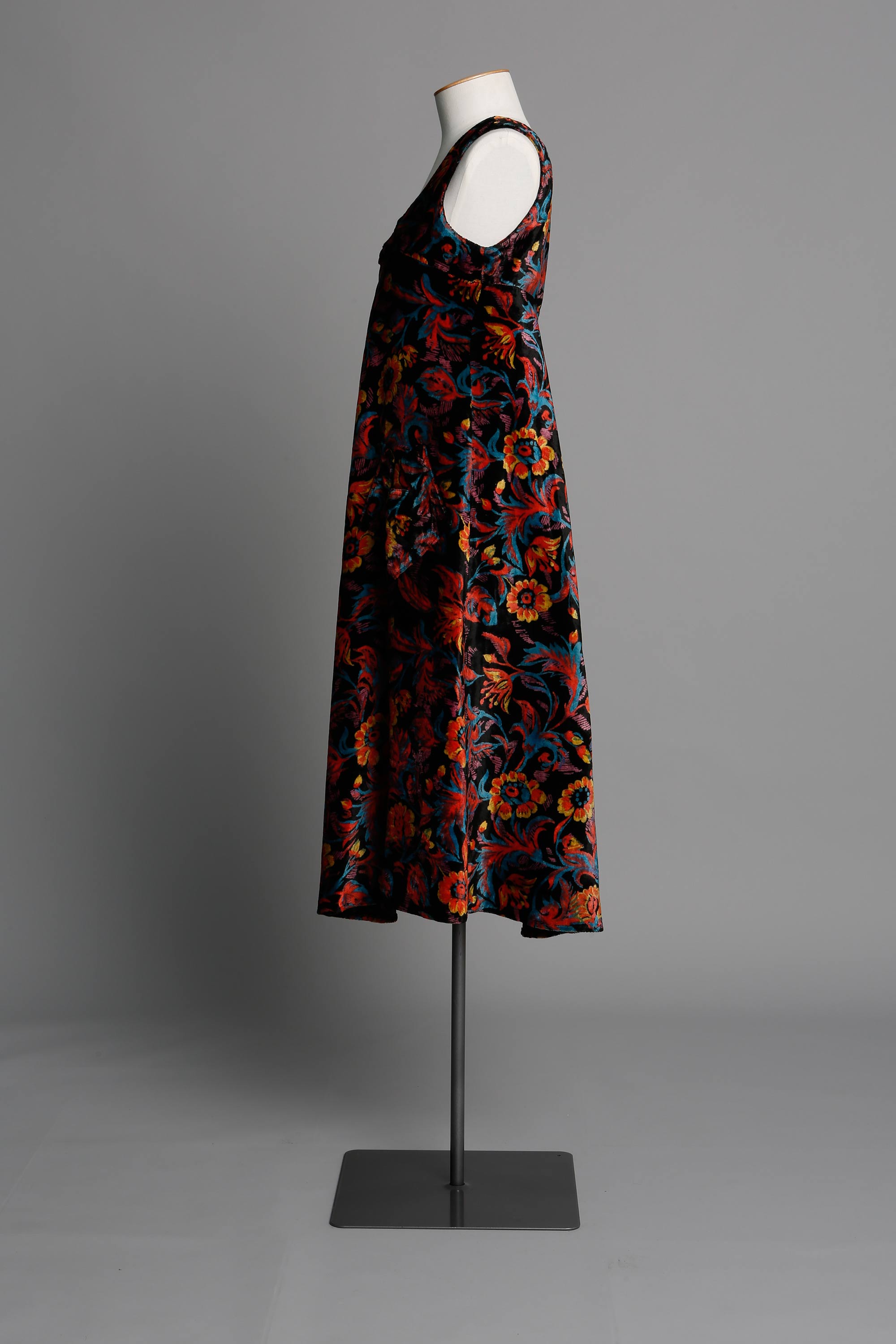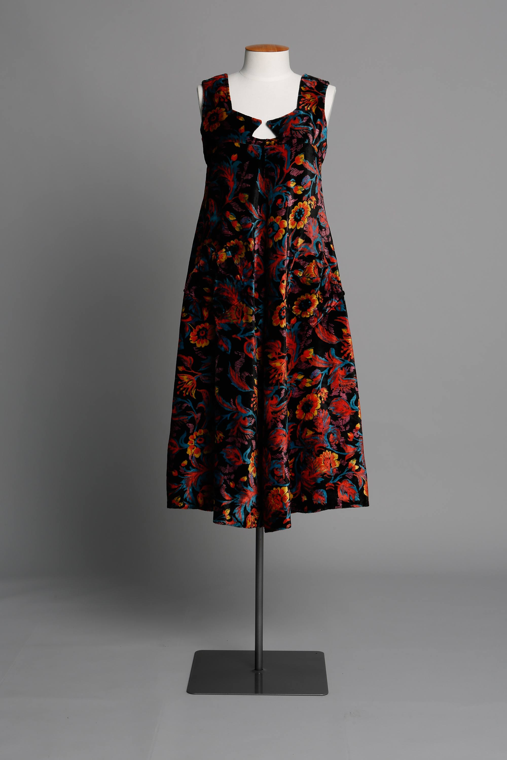 Tent dresses were popular in the mid 1970s. Linda Evans made a range in velvet prints and also a range in printed denim, keeping the same pocket and yoke detail.