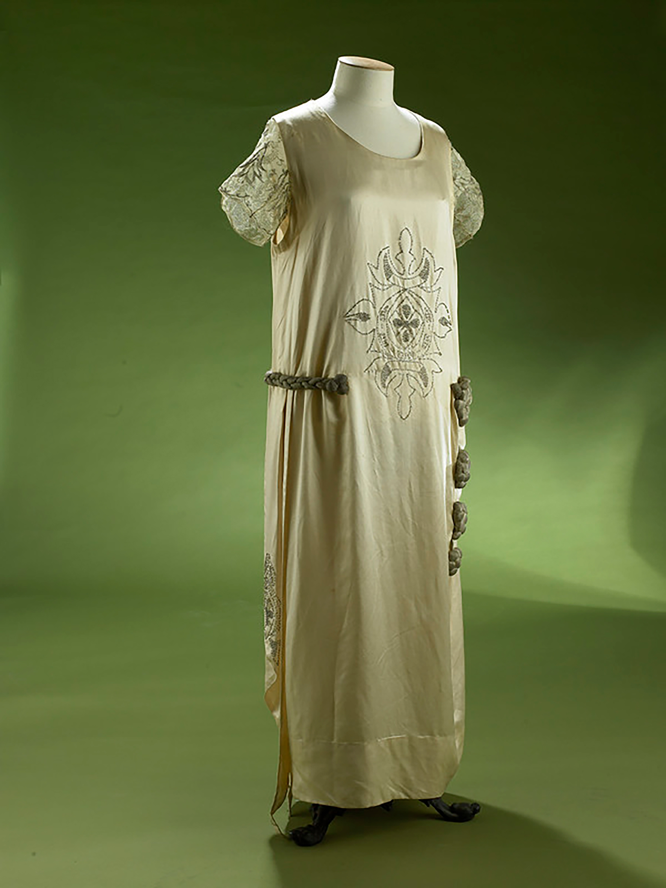 This shift-style wedding dress was made in Dunedin by The DSA (Drapery Supply Association) department store. The dress is lavishly embellished with classical motifs picked out in glass beading. Esther Botting, a teacher, wore this dress when she married Henry McQueen at Dunedin’s Knox Church on 28 September 1926. She wore the dress with a long train and a fine veil attached to a head band of wax flowers.