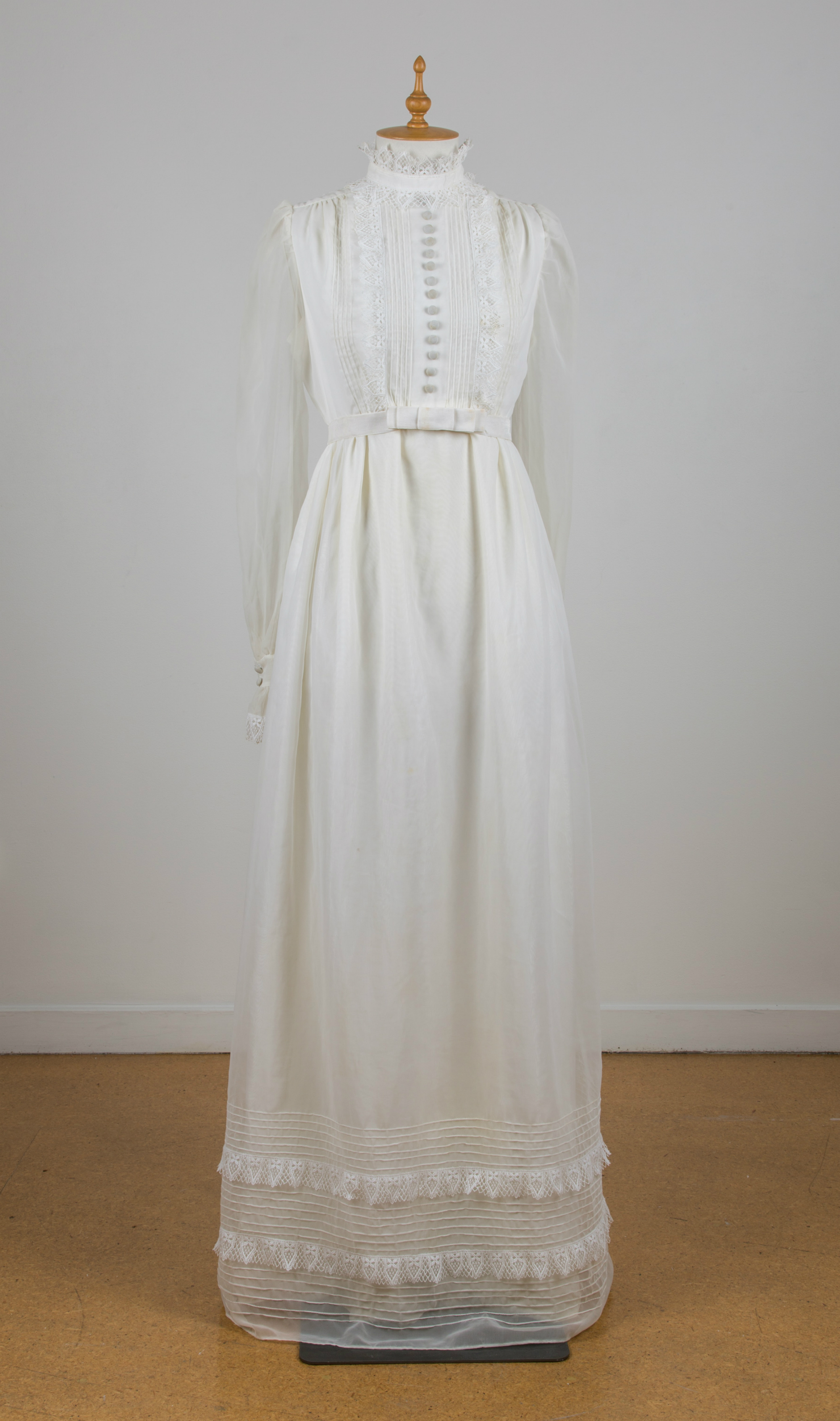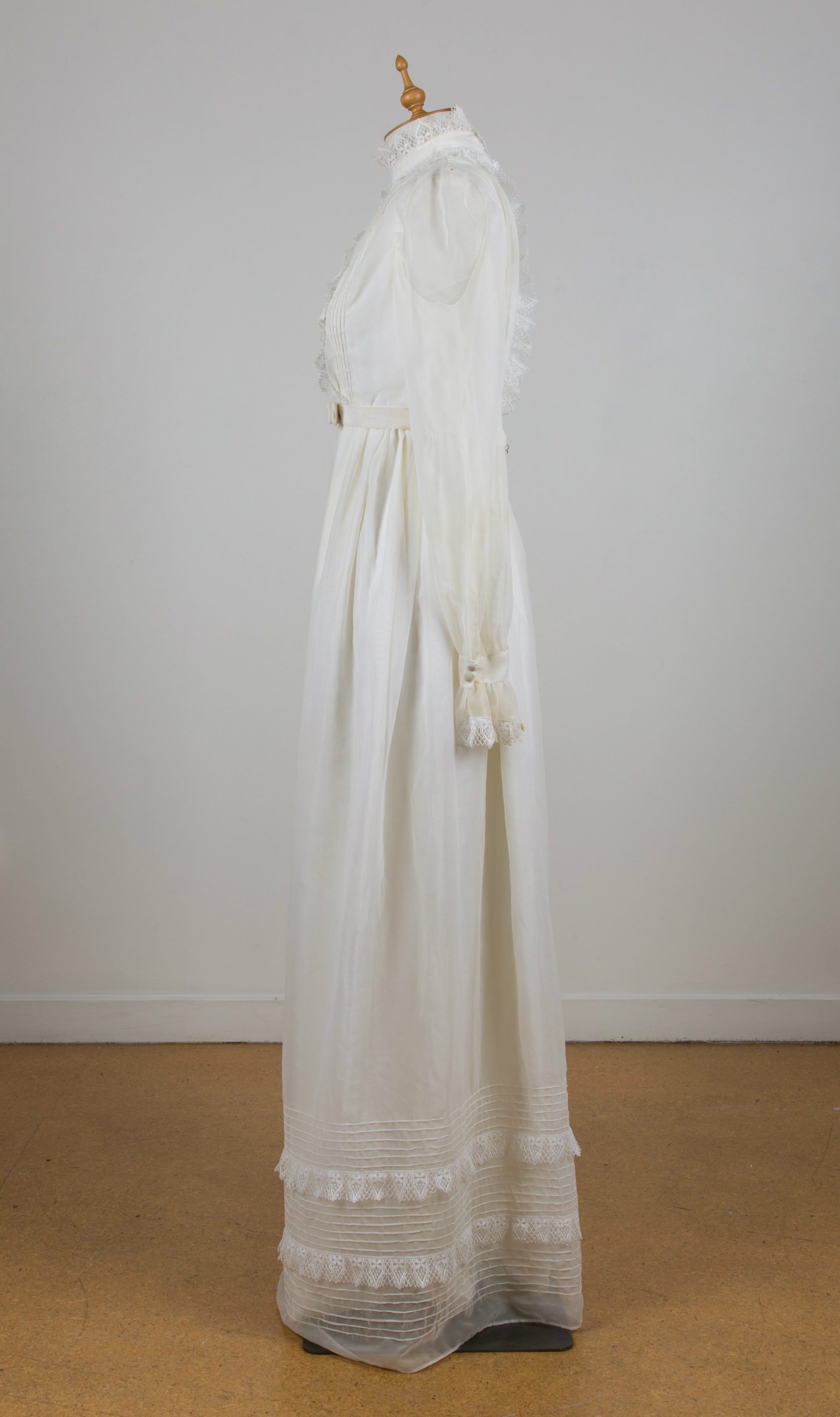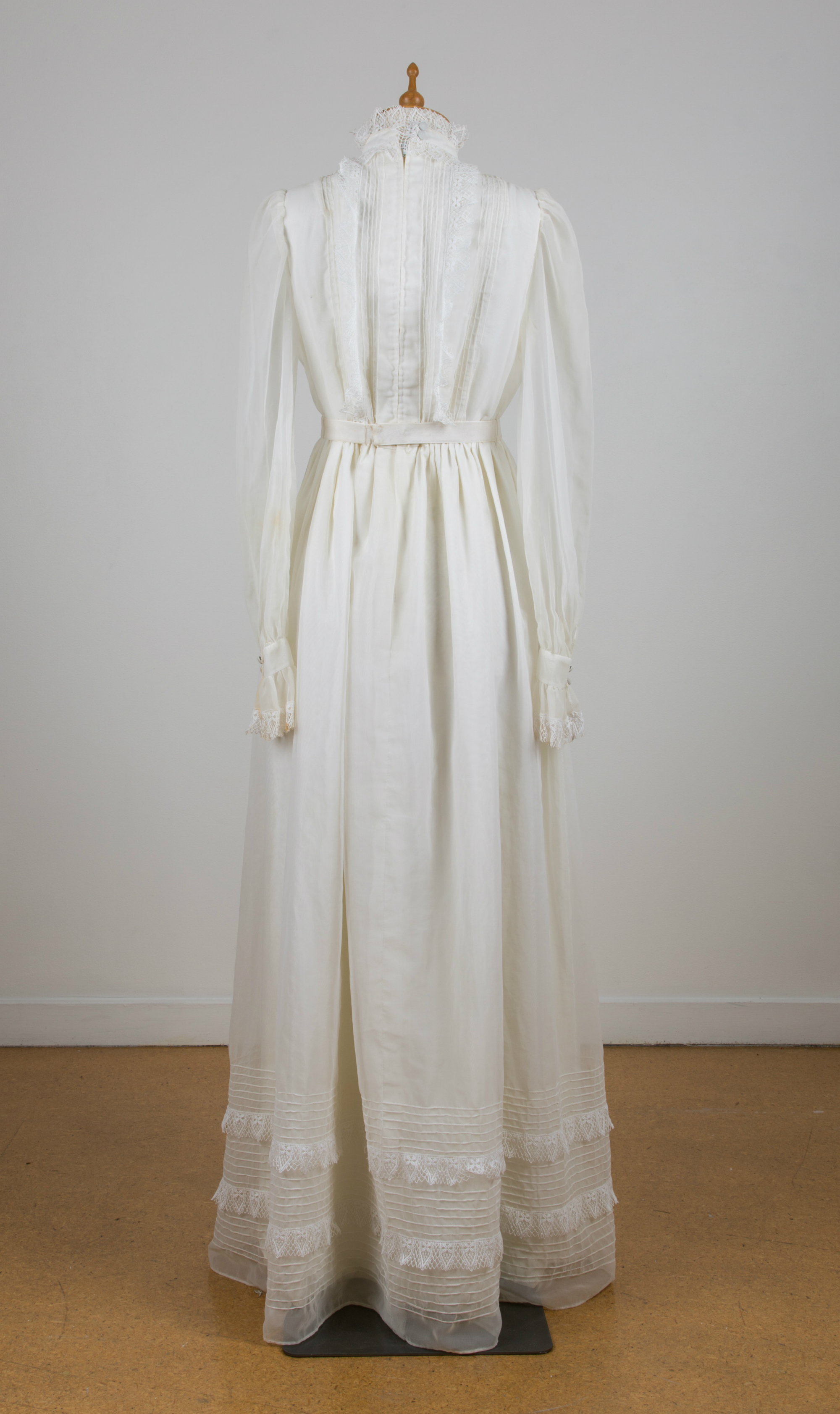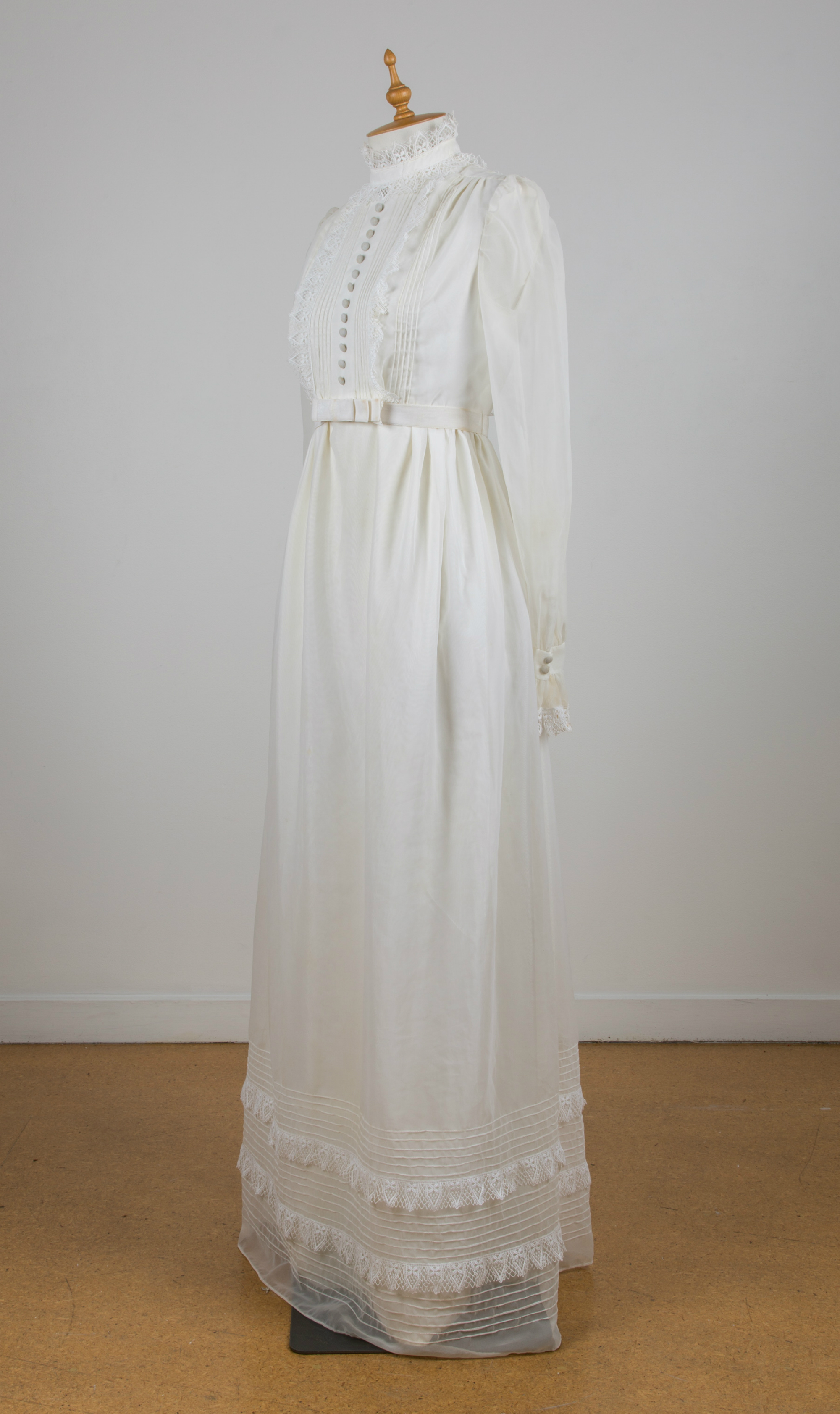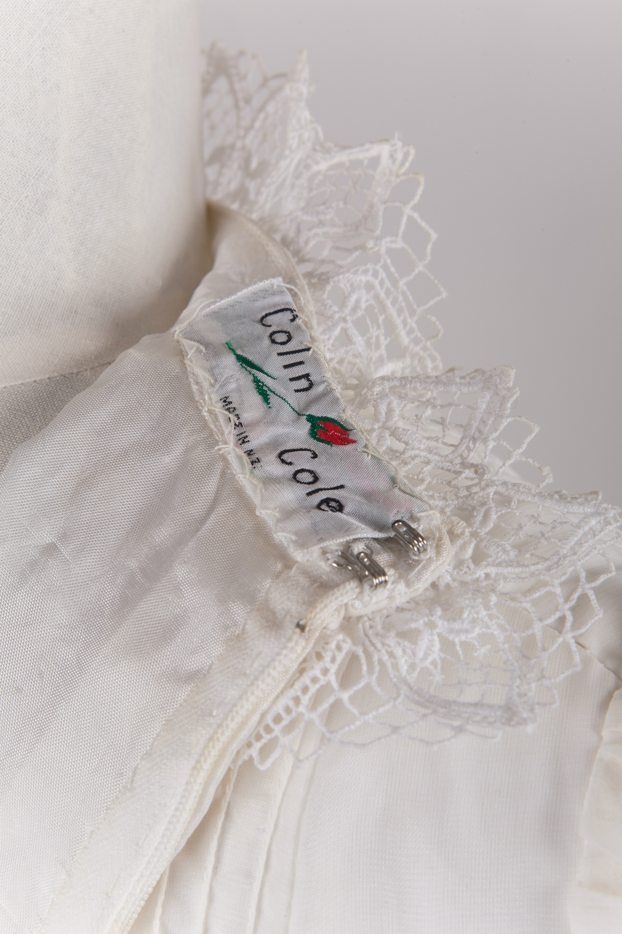 This wedding dress was designed by Colin Cole. Colin specialised in bespoke gowns, evening dresses, debutante wear and smart daywear, mainly working with heavy silks and satins. He used quality fabric to ensure his garments would last and become a staple in a woman’s wardrobe. His garments were almost always finished with self fabric covered buttons and hand-stitched detailing, including a hand worked label with his name and a rose.