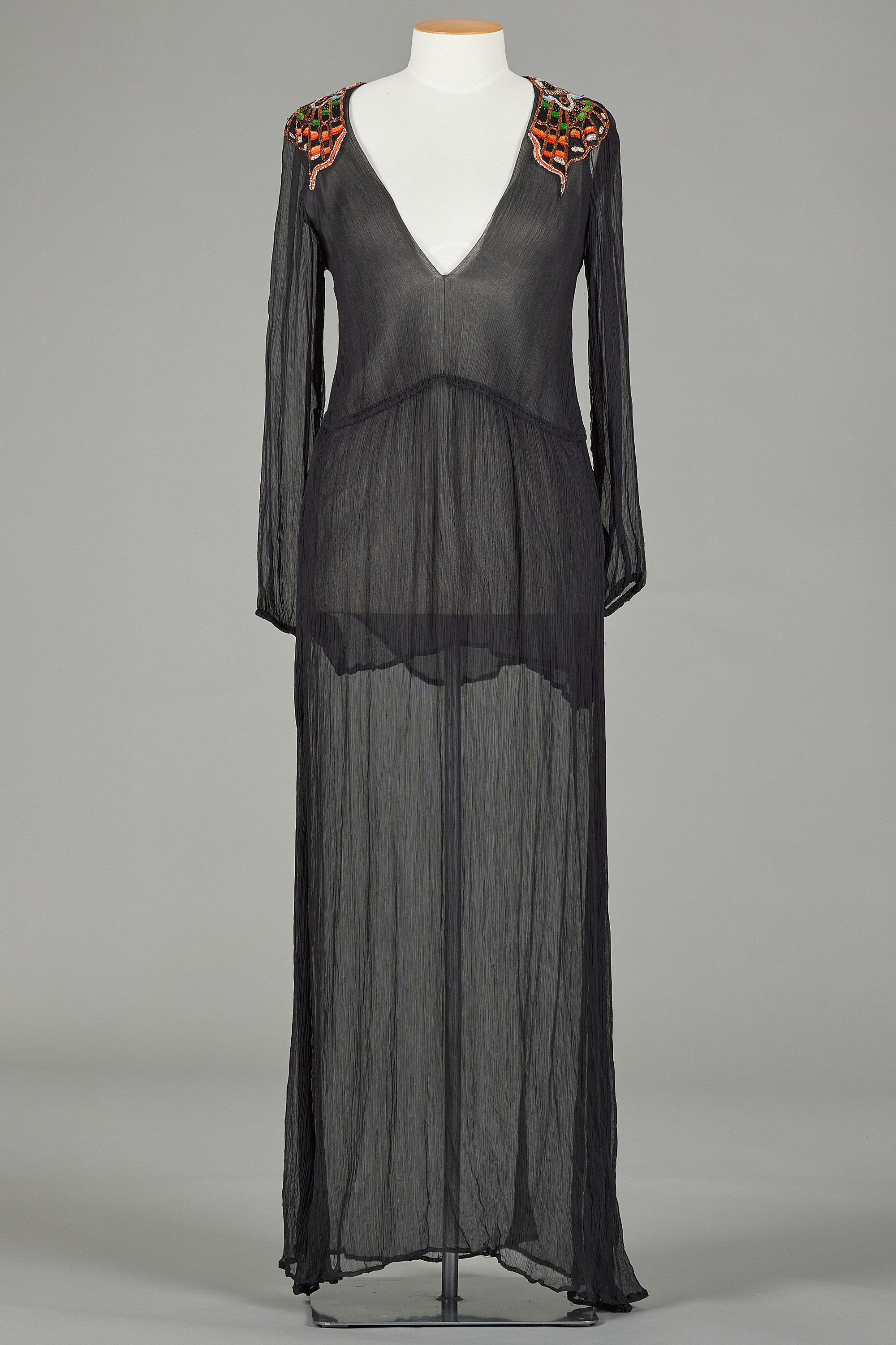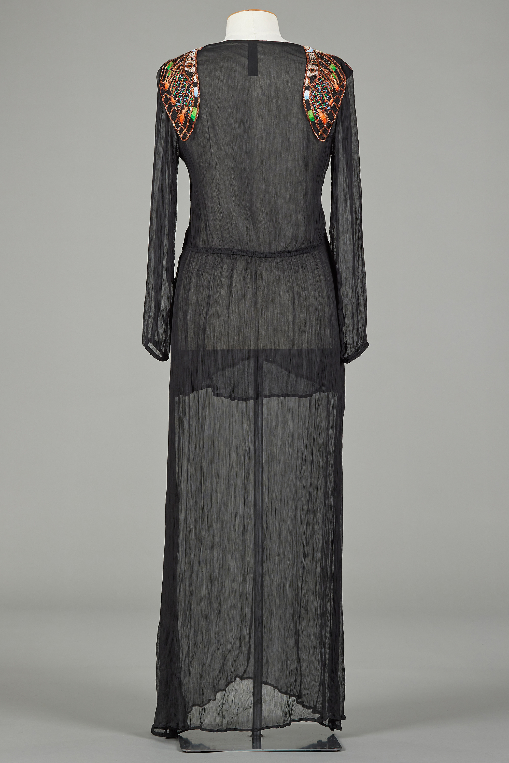 This Wendy Nelson dress signifies a return to Wendy designing under her own name, like she used to in the 1980s. This full length sheer, long sleeved dress with V neckline and beaded butterfly appliqués at the shoulders is made from 100% silk georgette with a crinkle texture. It features an empire line, and as a loose tunic style can be worn over a similar length slip or alternatively as a layering piece over separates.