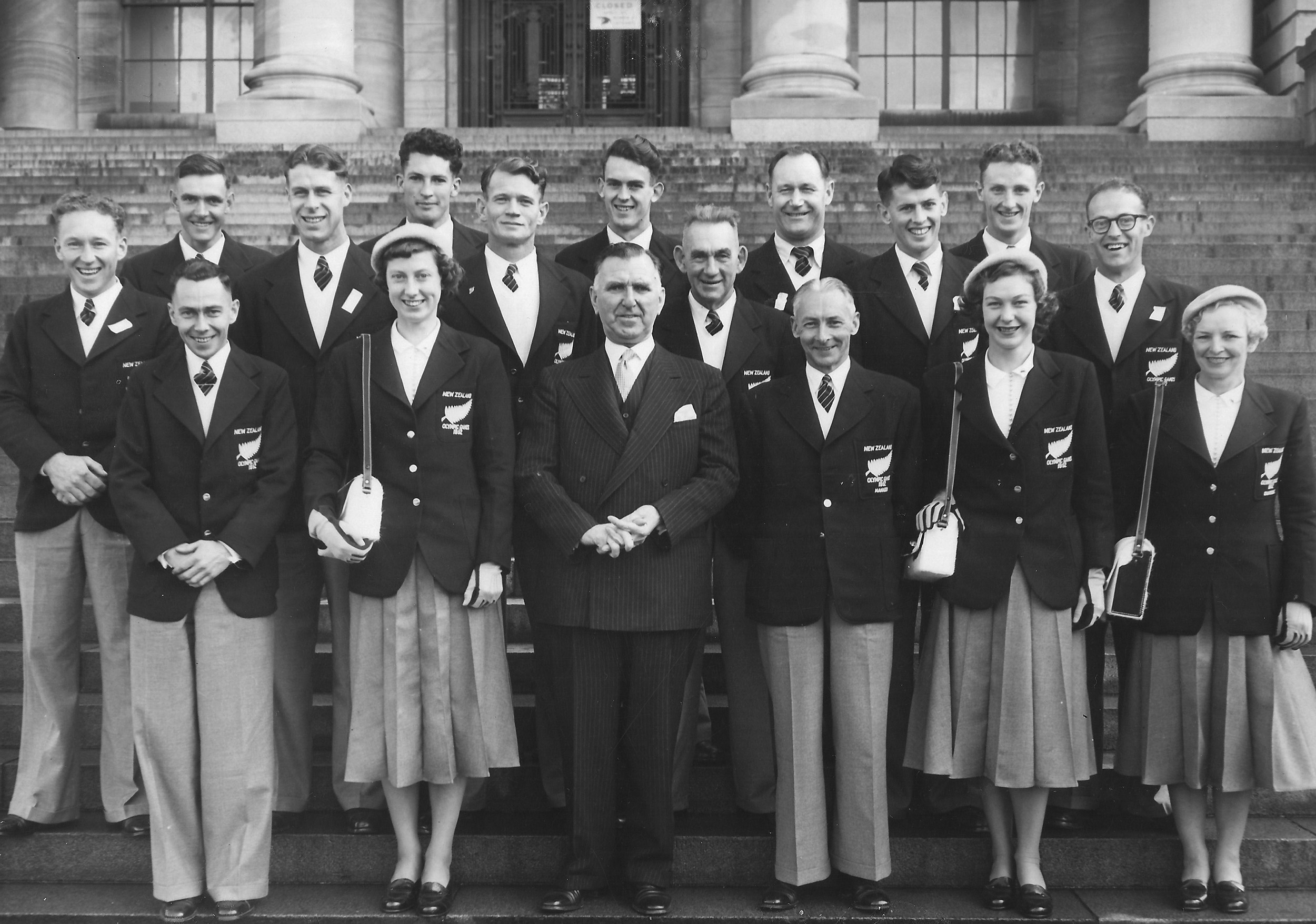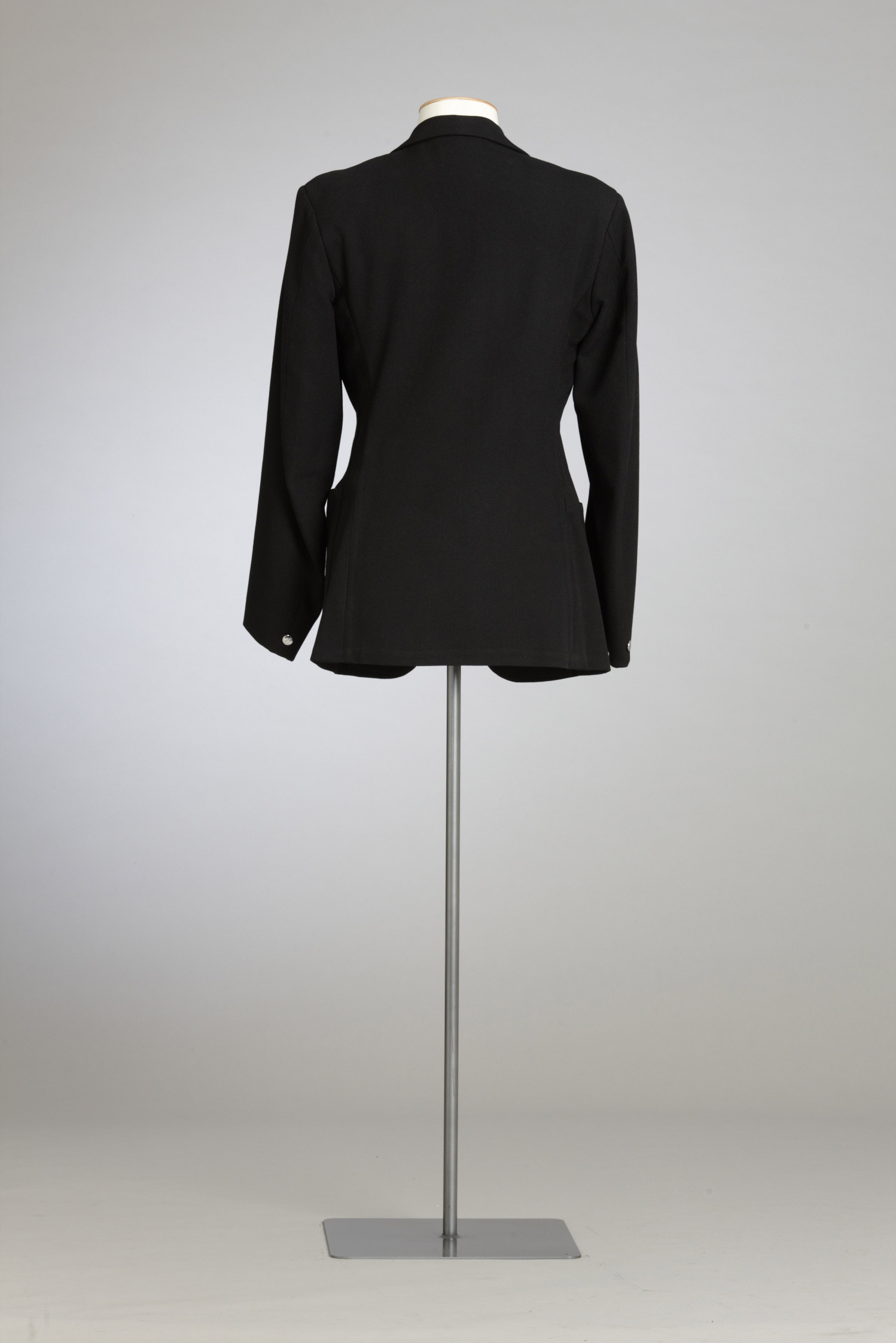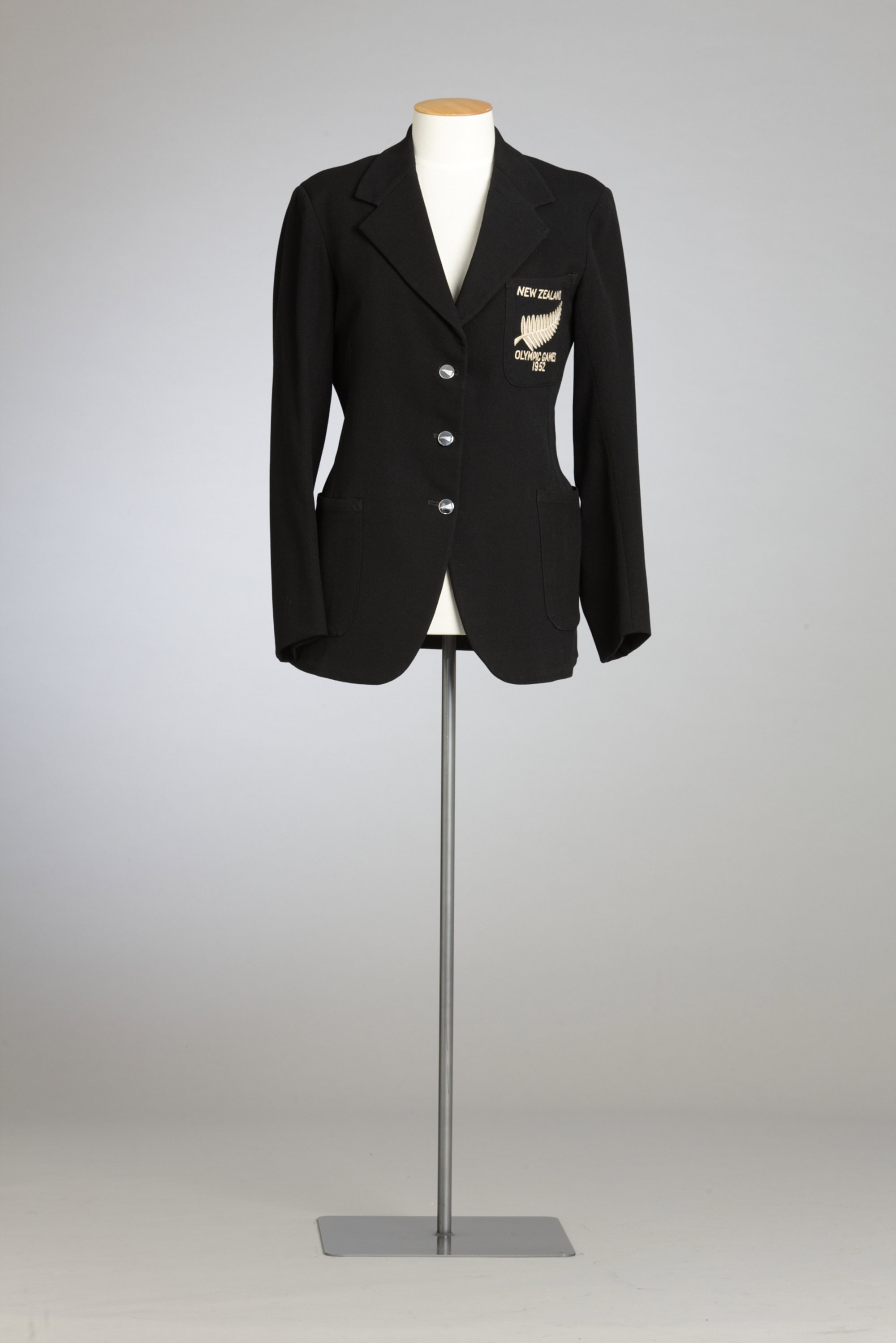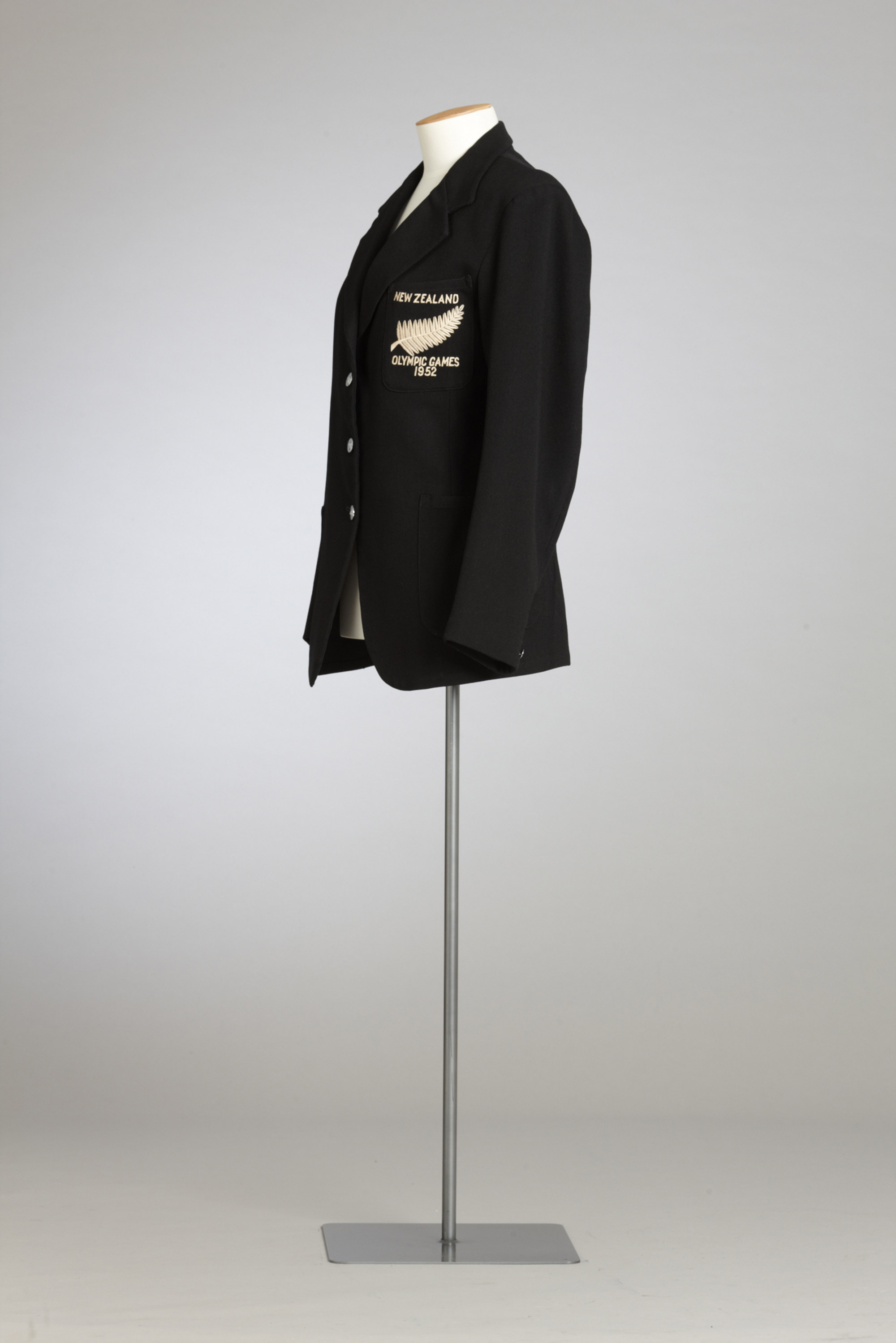 This blazer was worn by Yvette Williams (now Yvette Corlett), New Zealand’s first female Olympic gold medallist, at the 1952 Olympics in Helsinki. Yvette was the only New Zealander to win gold at the Games, and was the third individual New Zealander to ever become a gold medallist. She was 23 when she won the long jump event, wearing a singlet supplied by the New Zealand Olympic Committee and shorts she had to make herself. She also placed sixth in the shot put and tenth in the discus. This blazer is very simple. It is unlined and the only embellishments are the embroidery on the breast pocket and the New Zealand fern embossed on the silver buttons. Read more about wearing the colour black in the New Zealand Fashion Museum publication Black: The history of black in fashion, society and culture in New Zealand.