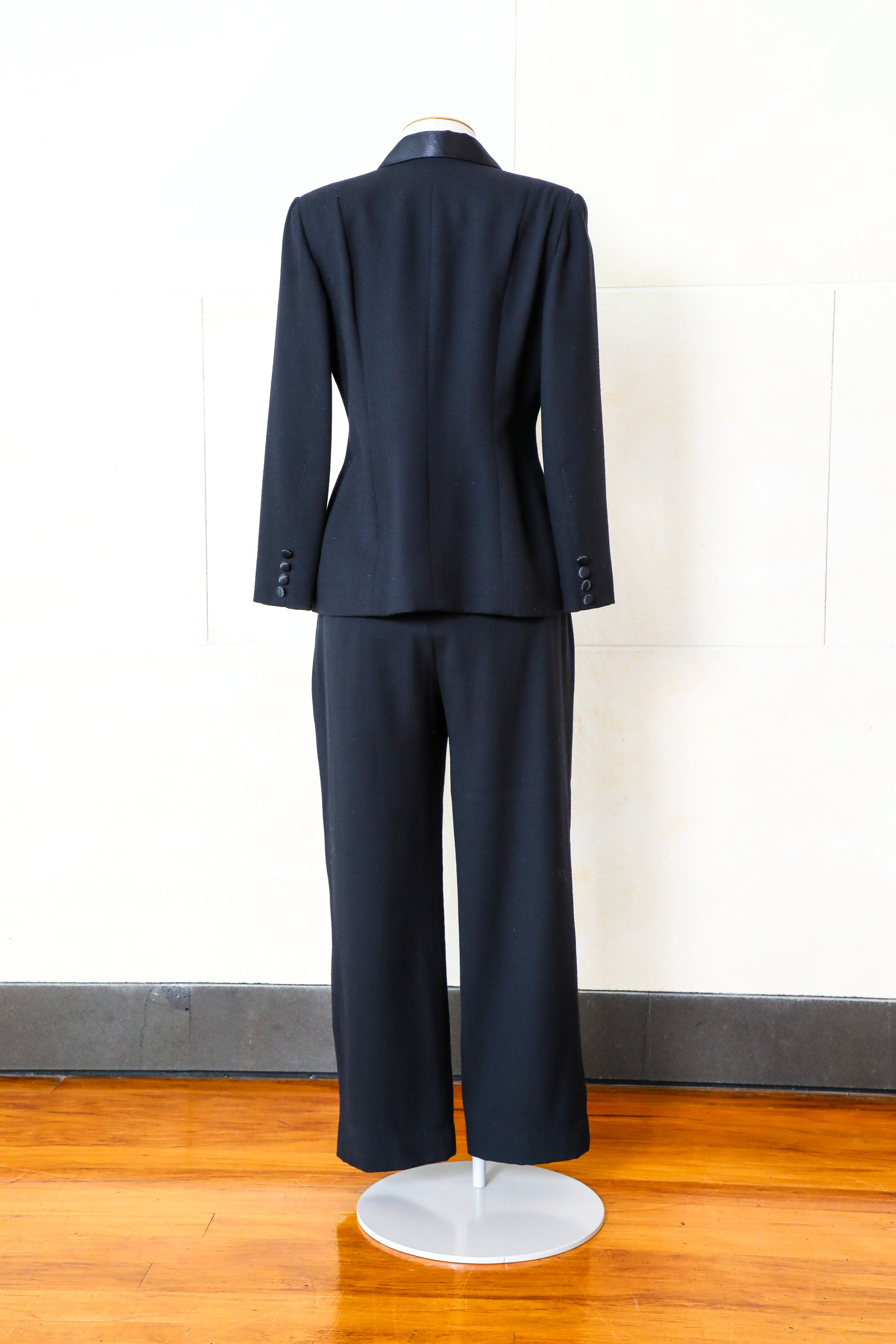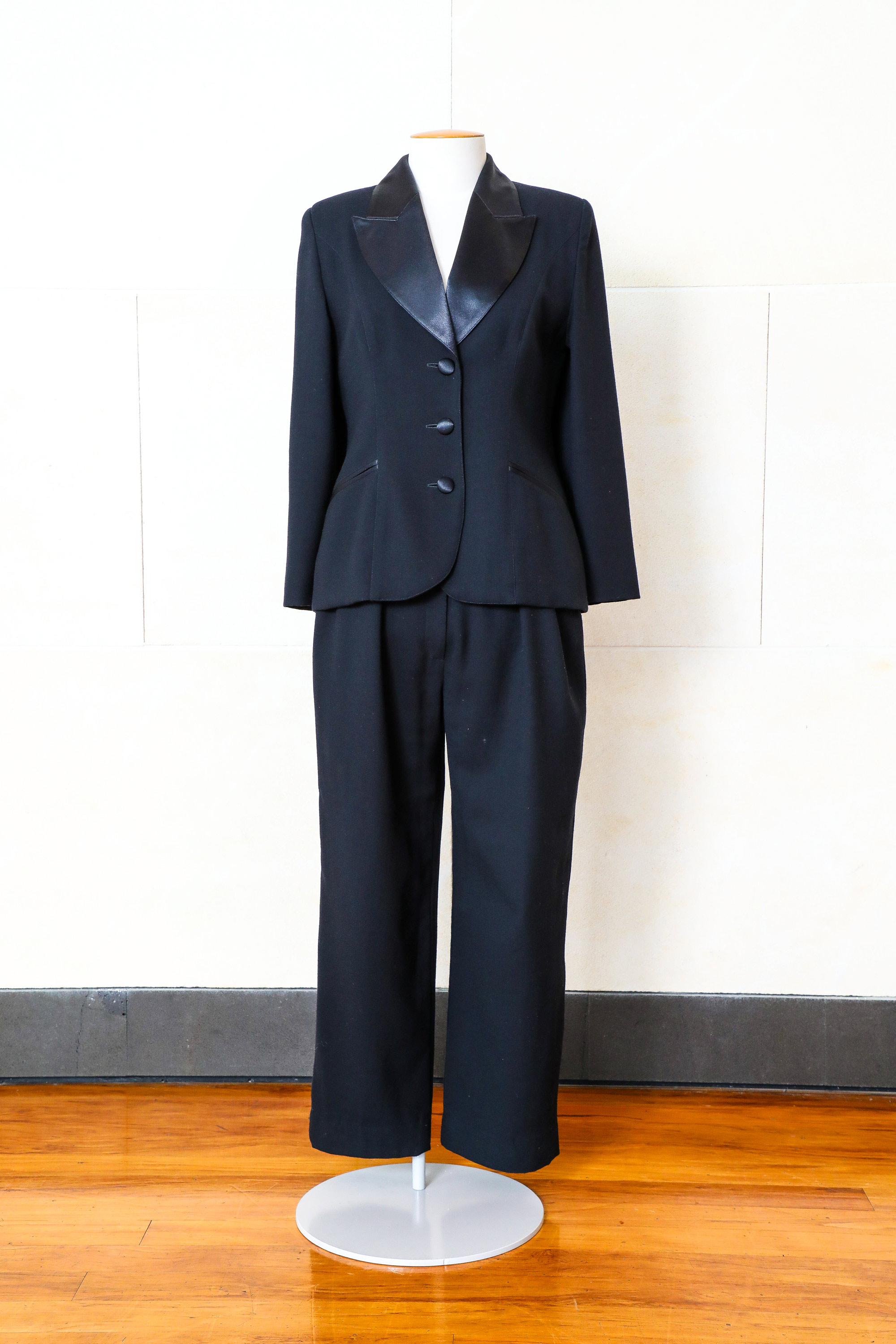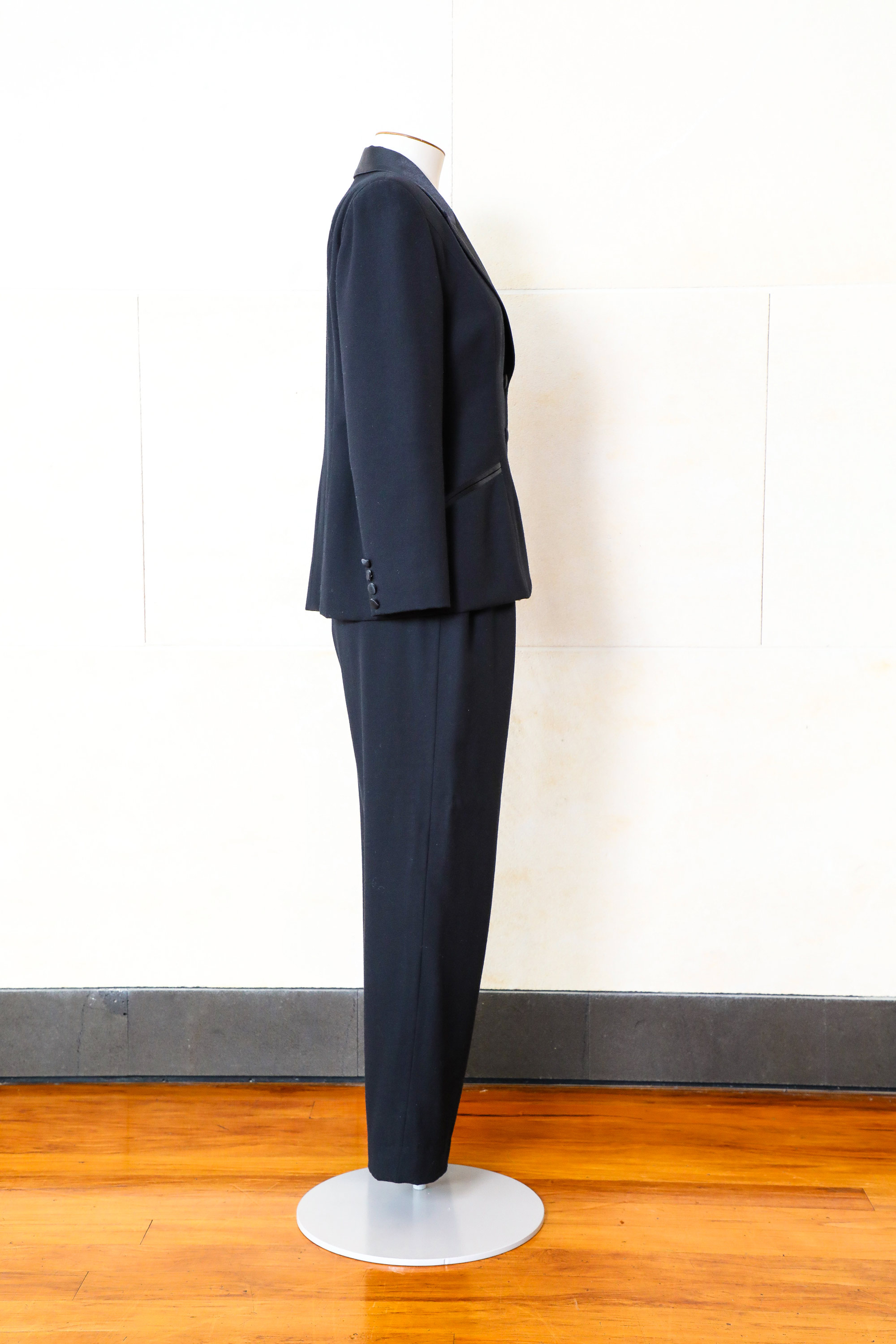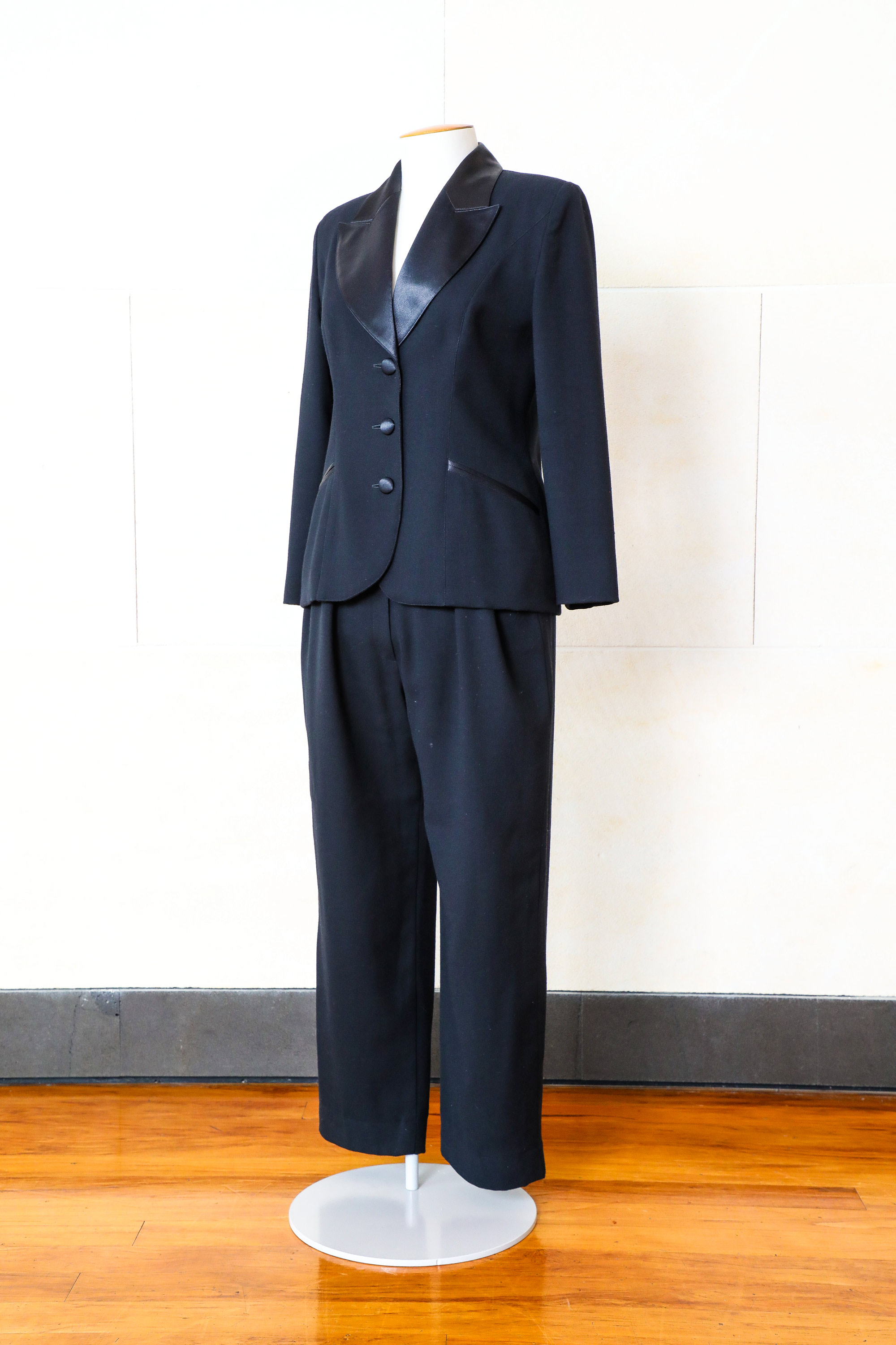 The suit has a semi-fitted jacket and straight-leg pants (both fully lined), a satin notched collar, satin-covered buttons, satin-bound pockets.