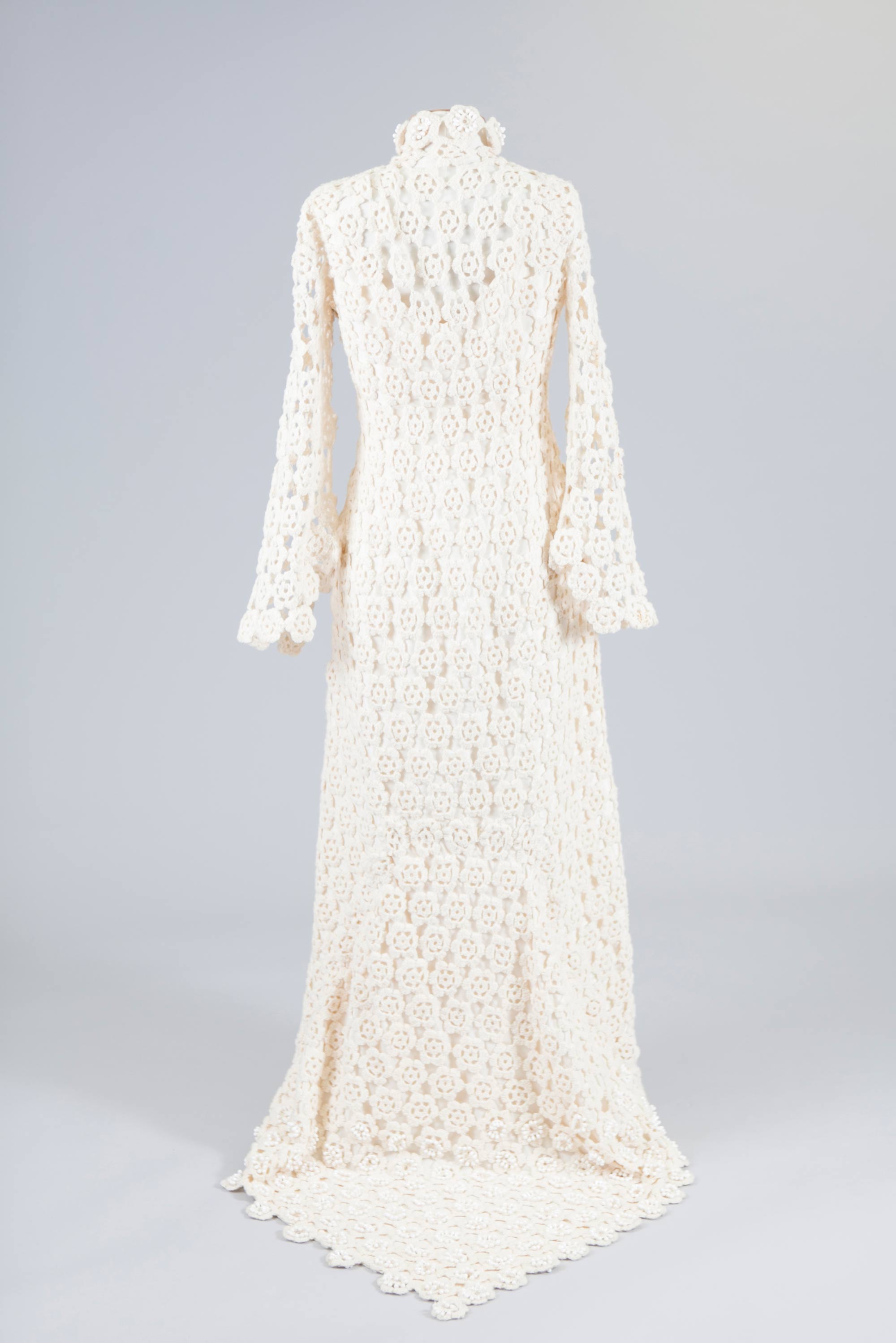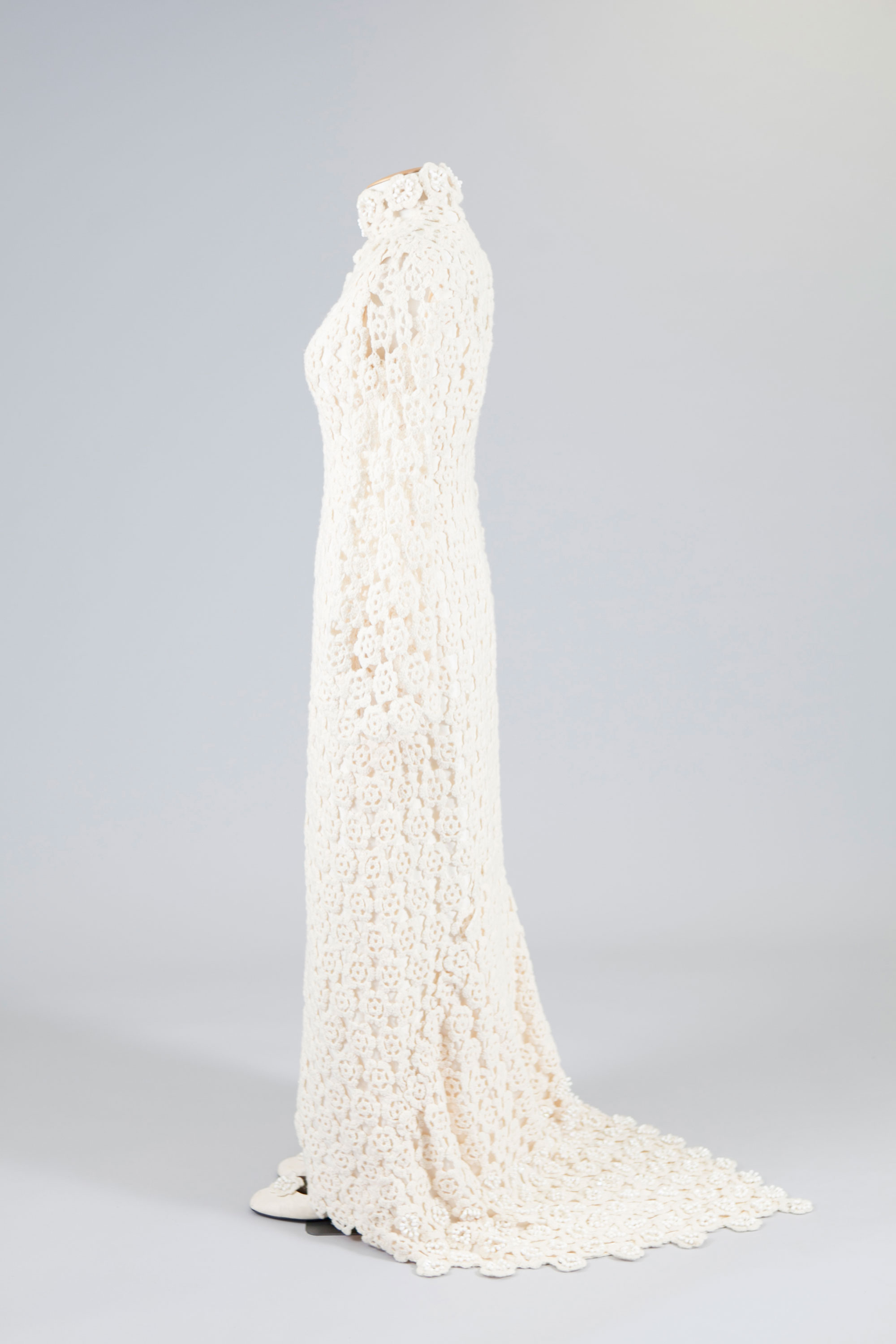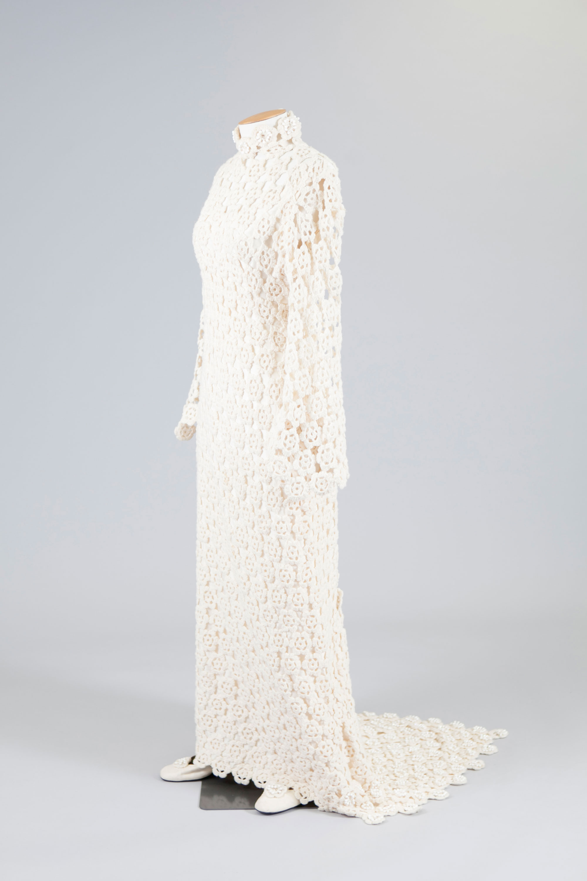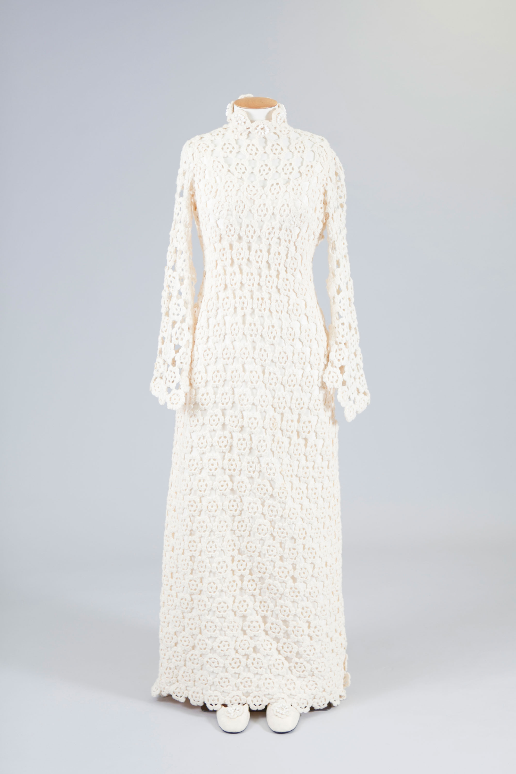 Peggie Wilson made this wedding dress for Gay Williams (née Phelps) in 1968. The crochet flowers were made by Peggie's mother Blanche Corlett. Peggie sewed them together, added beads and made the petticoat, bodice and the silk net veil. Gay wore it with a mantilla.