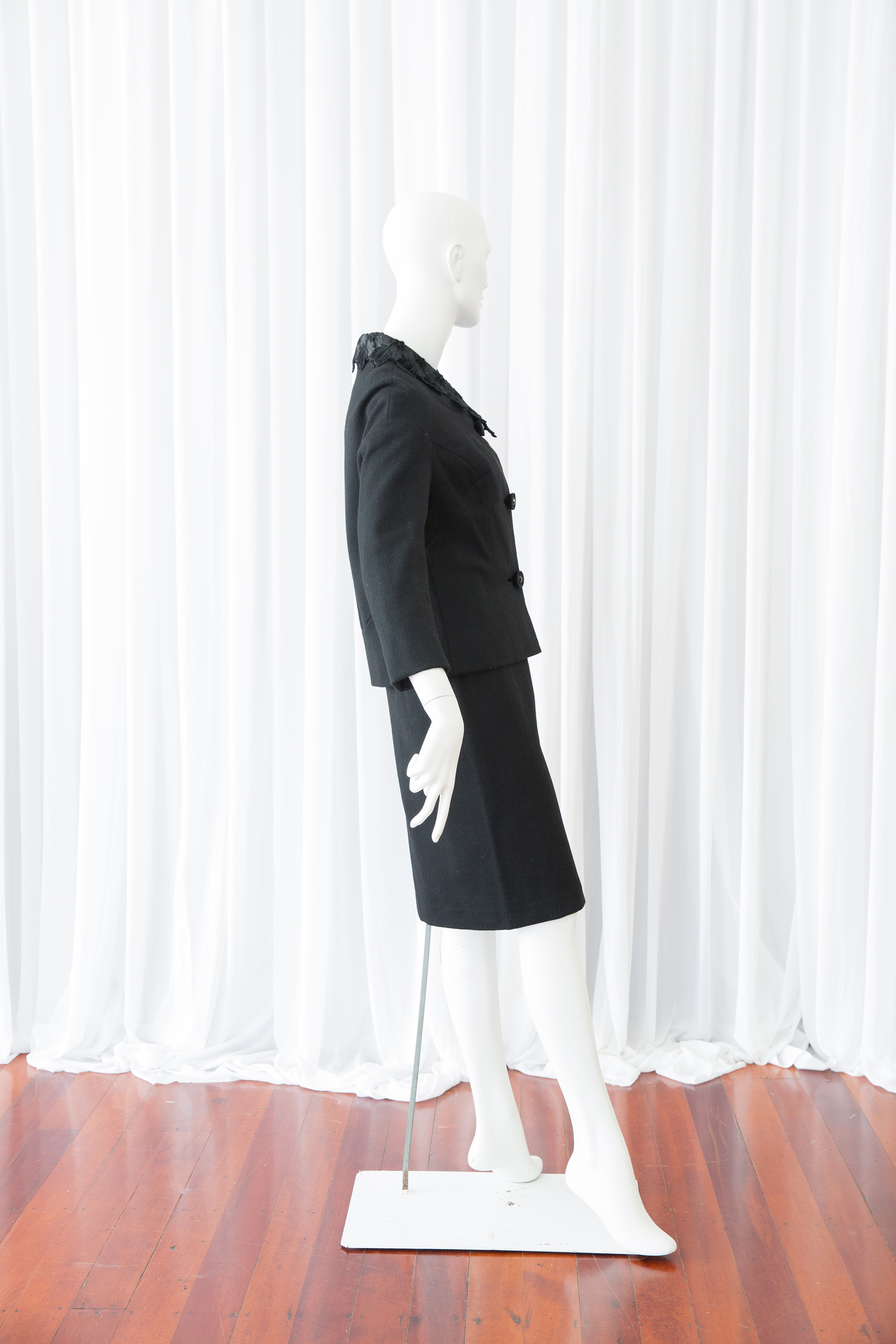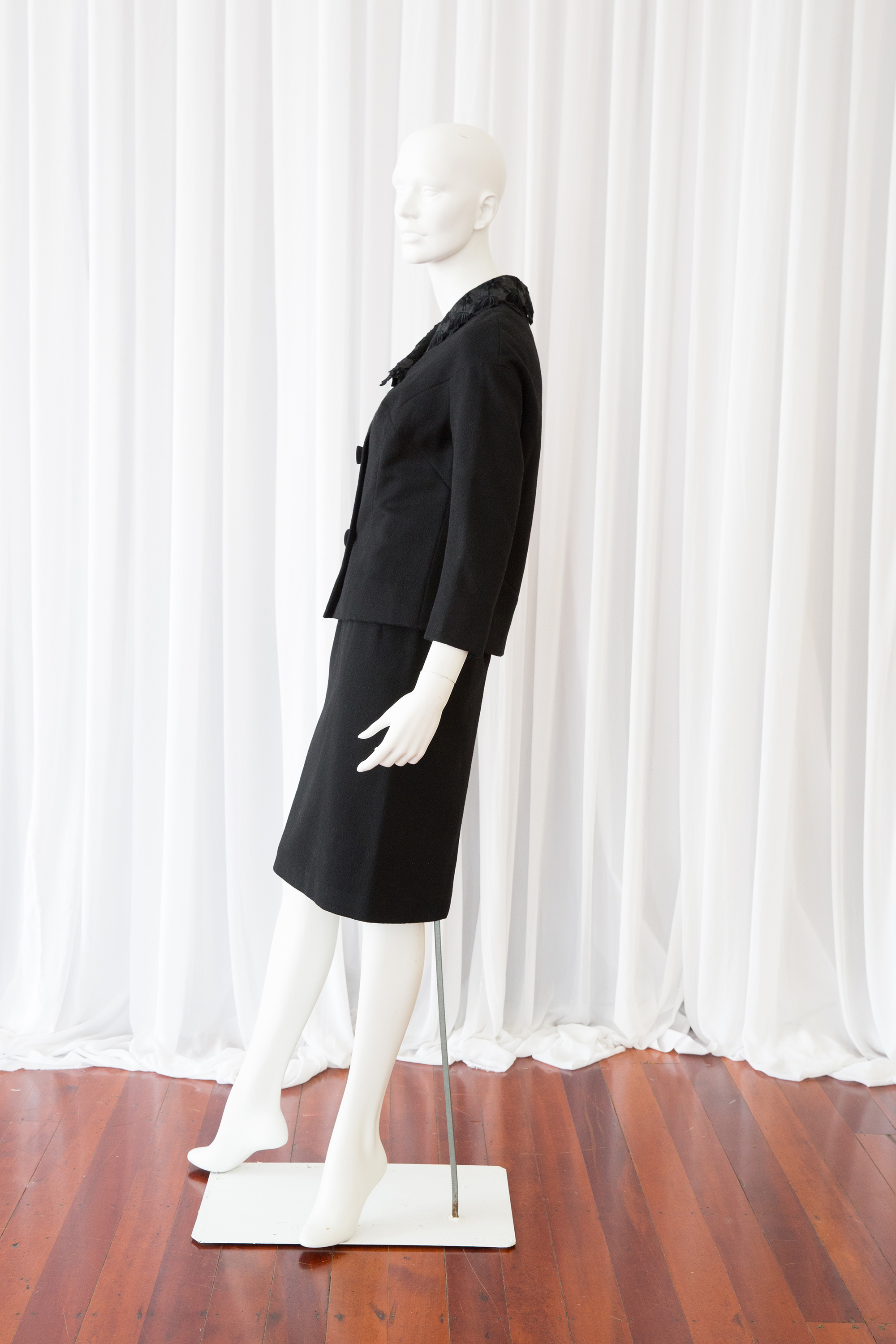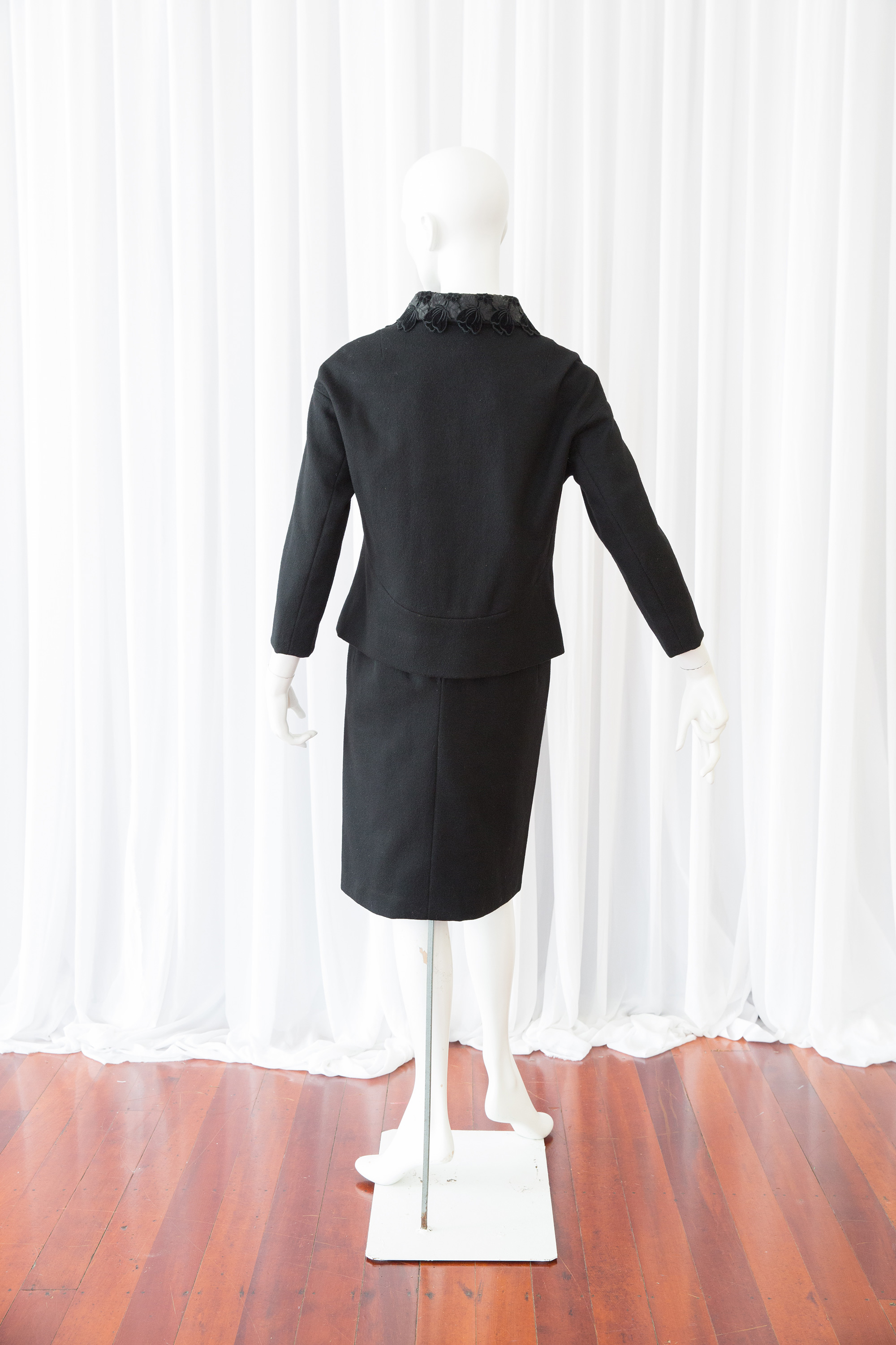 Bruce Papas designed under two labels when he had a salon at 246 Shopping Centre - Bruce Papas Model and Staevros Boutique. The cutwork appliqué on the collar of this ensemble echoes his work, 20 years earlier, with Ninette Gowns. Read more about Bruce Papas in the New Zealand Fashion Museum publication, A Certain Style.