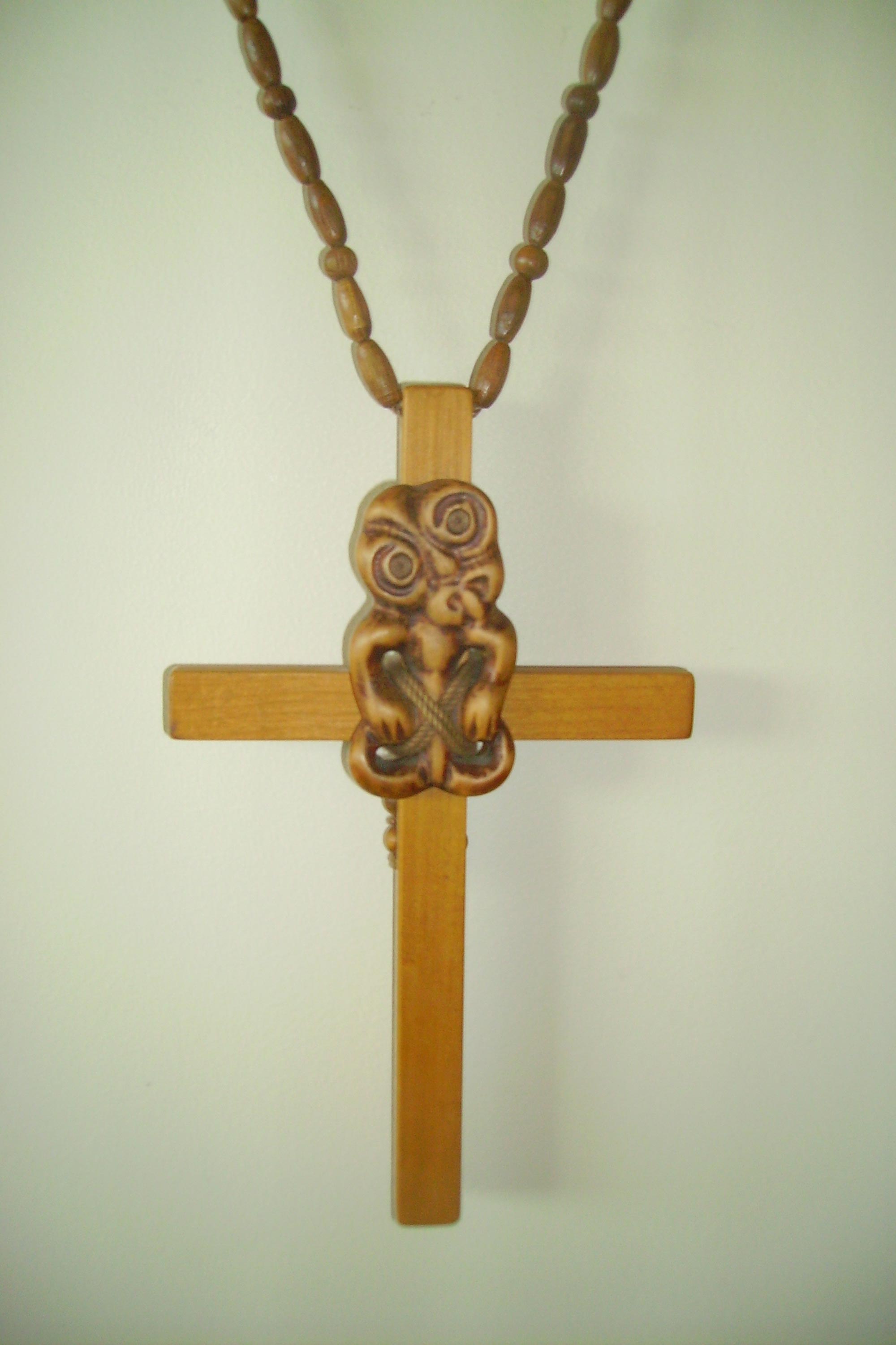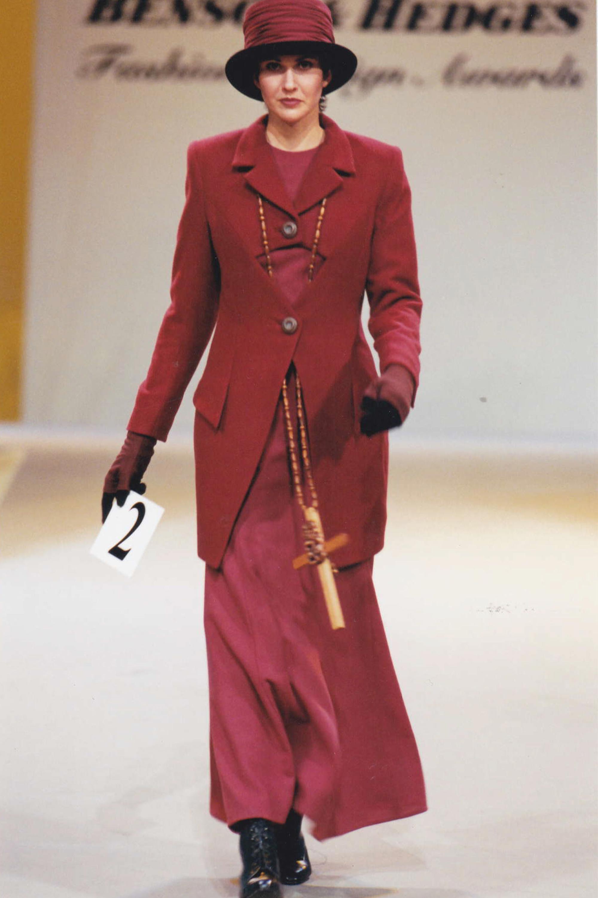 Paul Chaplin received two nominations in the 1994 Woolmark category of the Benson & Hedges Awards. He won the award with a hand-dyed wool ensemble. This outfit comprises a long dress and a coat. Paul was influenced by the Edwardian frock-coat and used his tailoring skills to sharpen the silhouette, seamlessly incorporating the pocket flap into the front side panel to give a cleaner line. Paul drew inspiration from Māori leader Dame Whina Cooper when he designed the pendant accessory for this outift. He assembled the item by hand using beads from a vintage macramé belt, a handmade cross from a local carpenter and a wooden hei tiki. Although made with good intentions, the pendant has received mixed feedback.