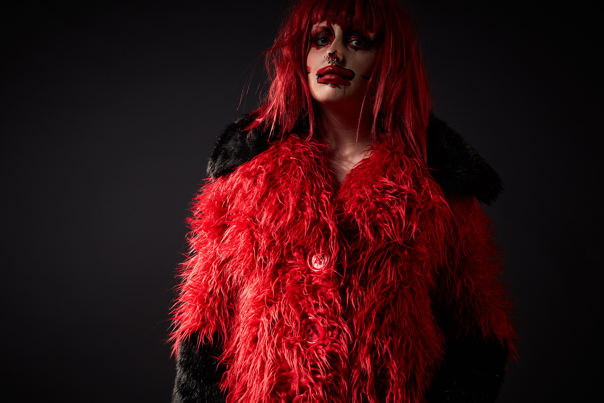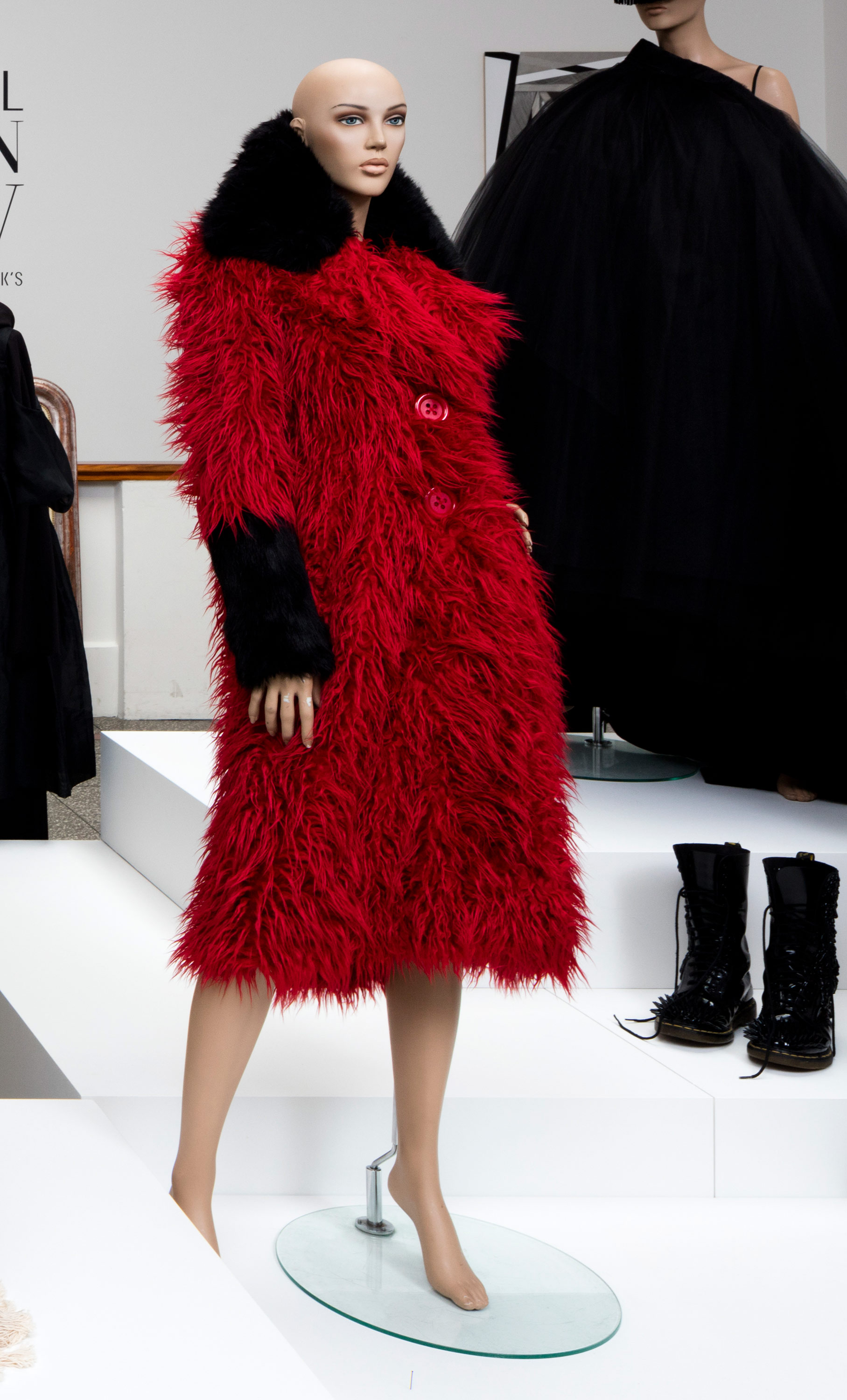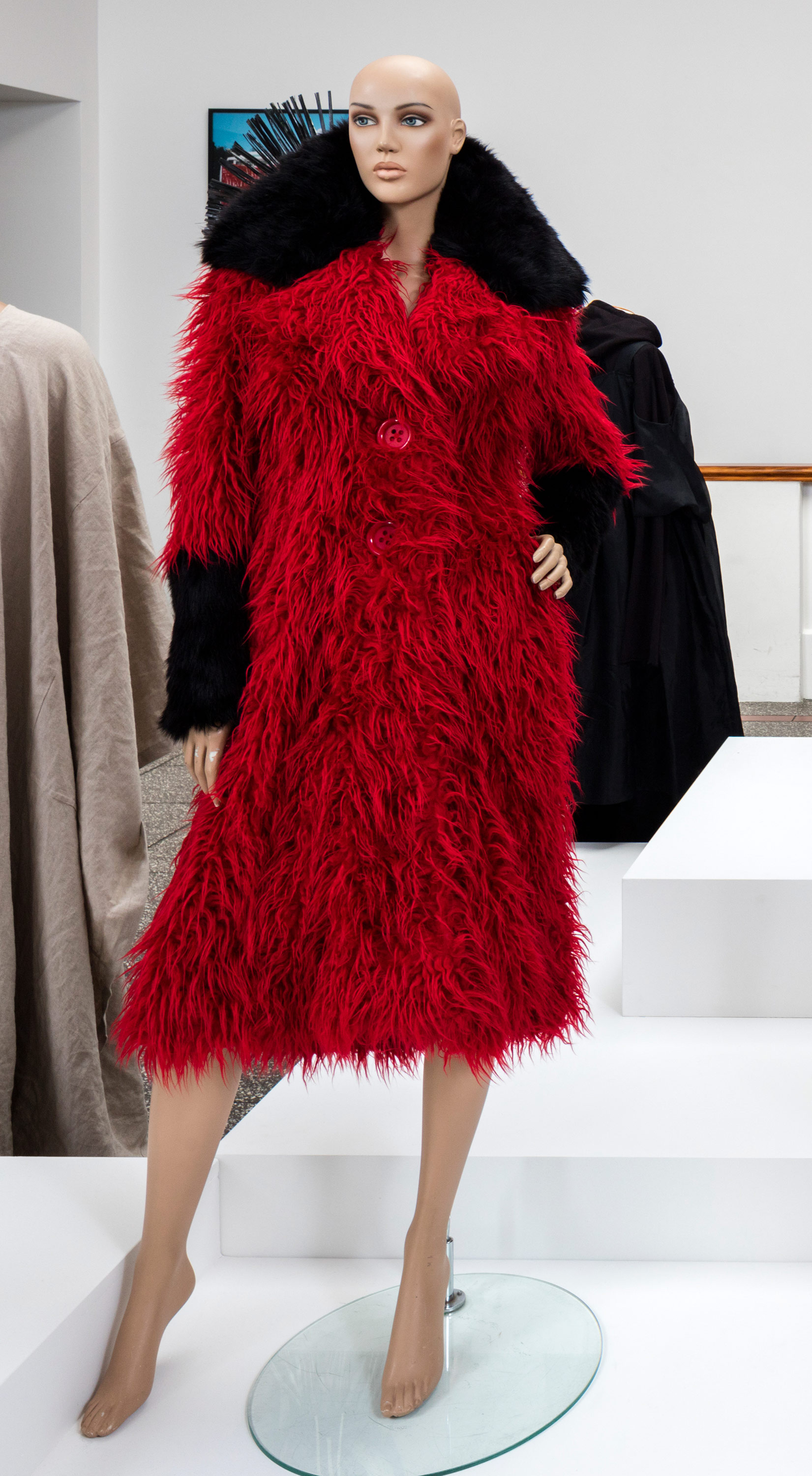 This full-length coat by WORLD was their 'Costume to face the ultimate discomfit of the guillotine, the gallows or the dentist' in the New Zealand Fashion Museum exhibition, Intellectual Fashion Show 2016. The coat, called 'Cruella DeVille' is made from red faux fur with a black faux fur collar and cuffs.