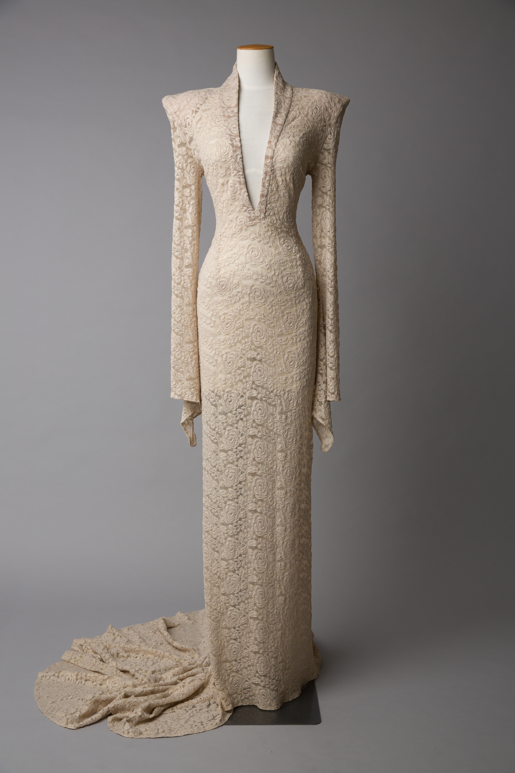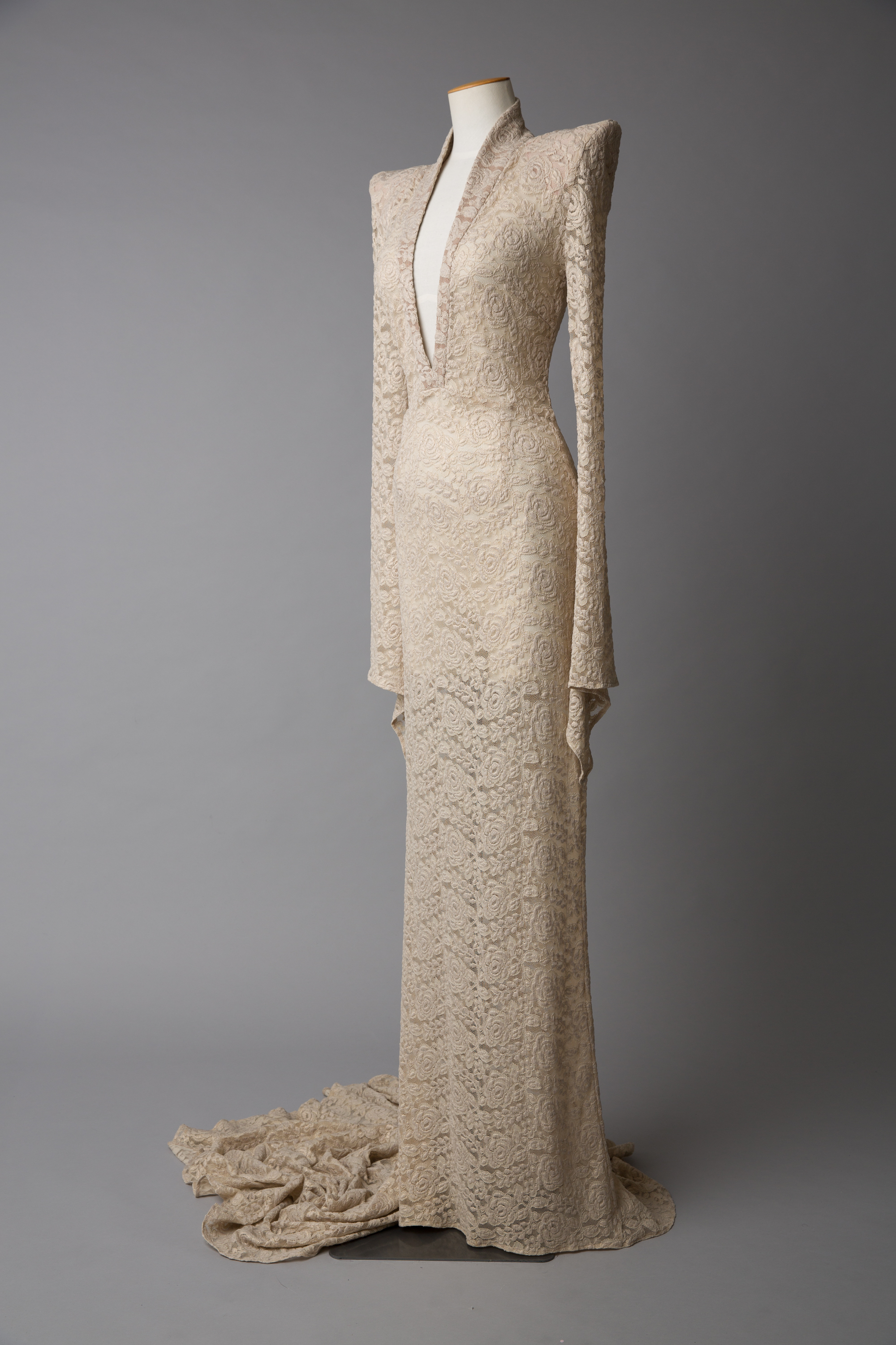 This stunning evening dress is an example of WORLD's theatrical style and features dramatic pointed shoulders, a deep v-neckline and a train at the back.