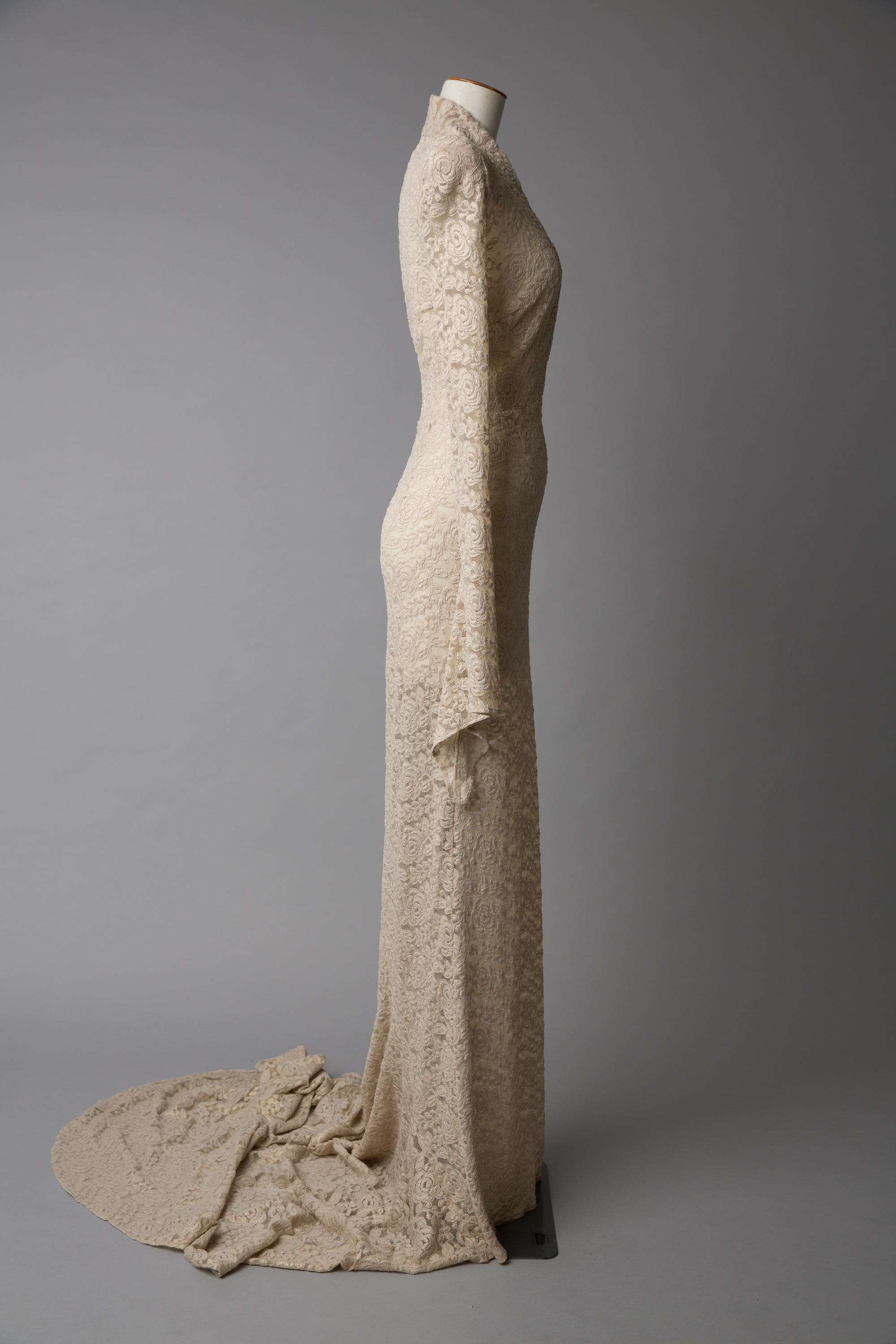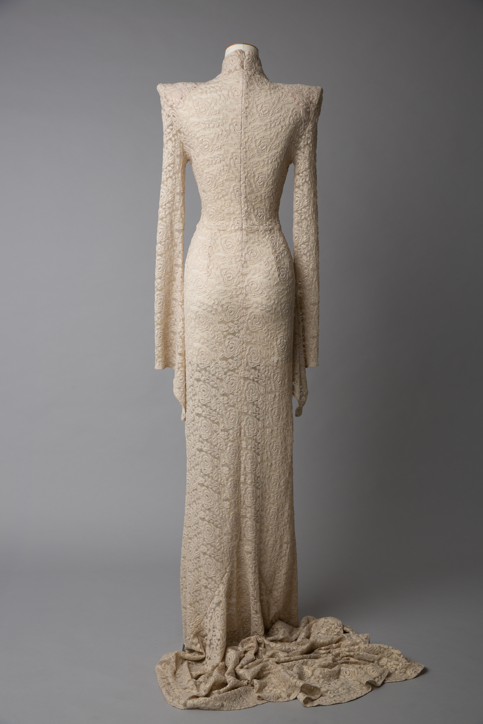 Sculptured shoulders, train hem