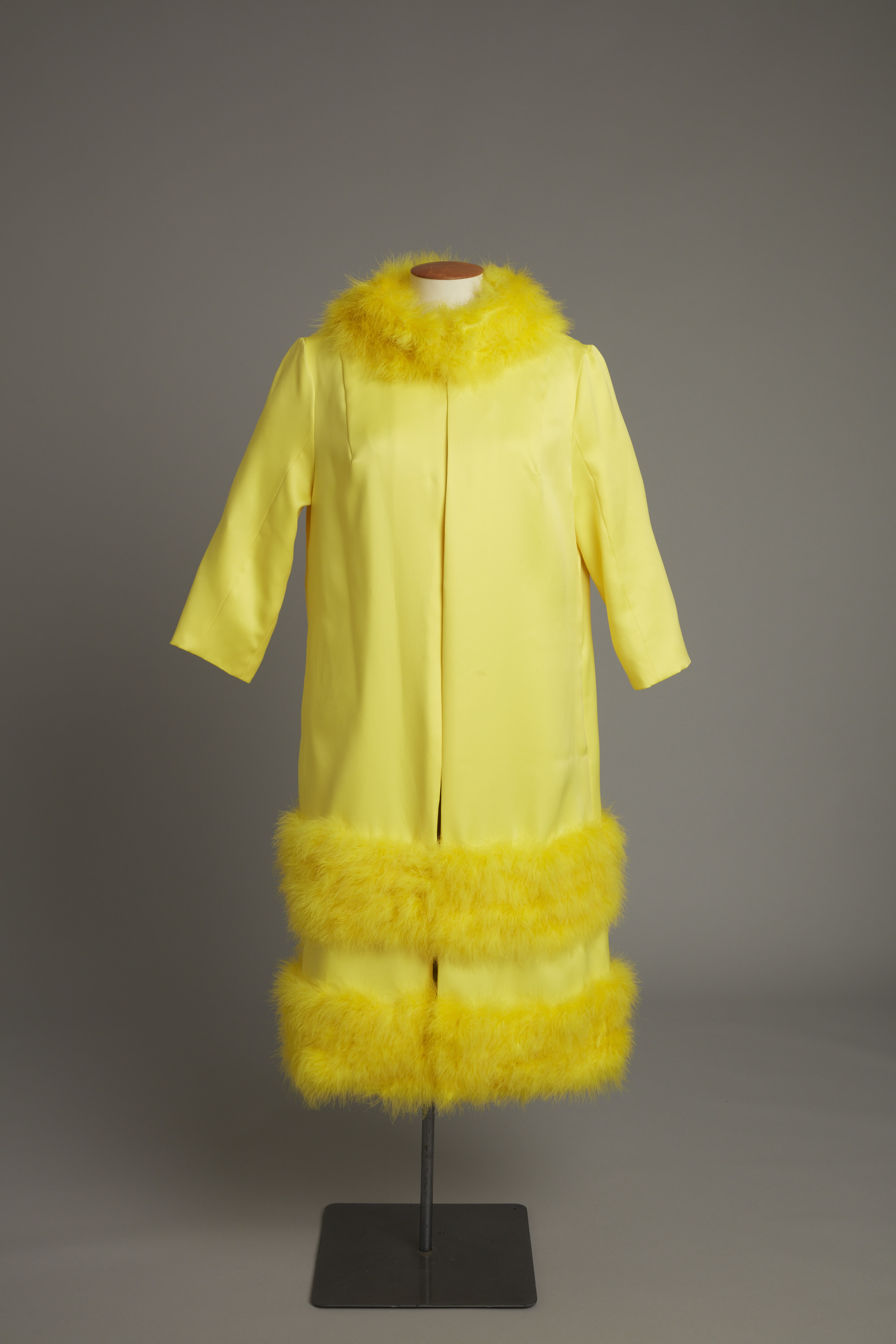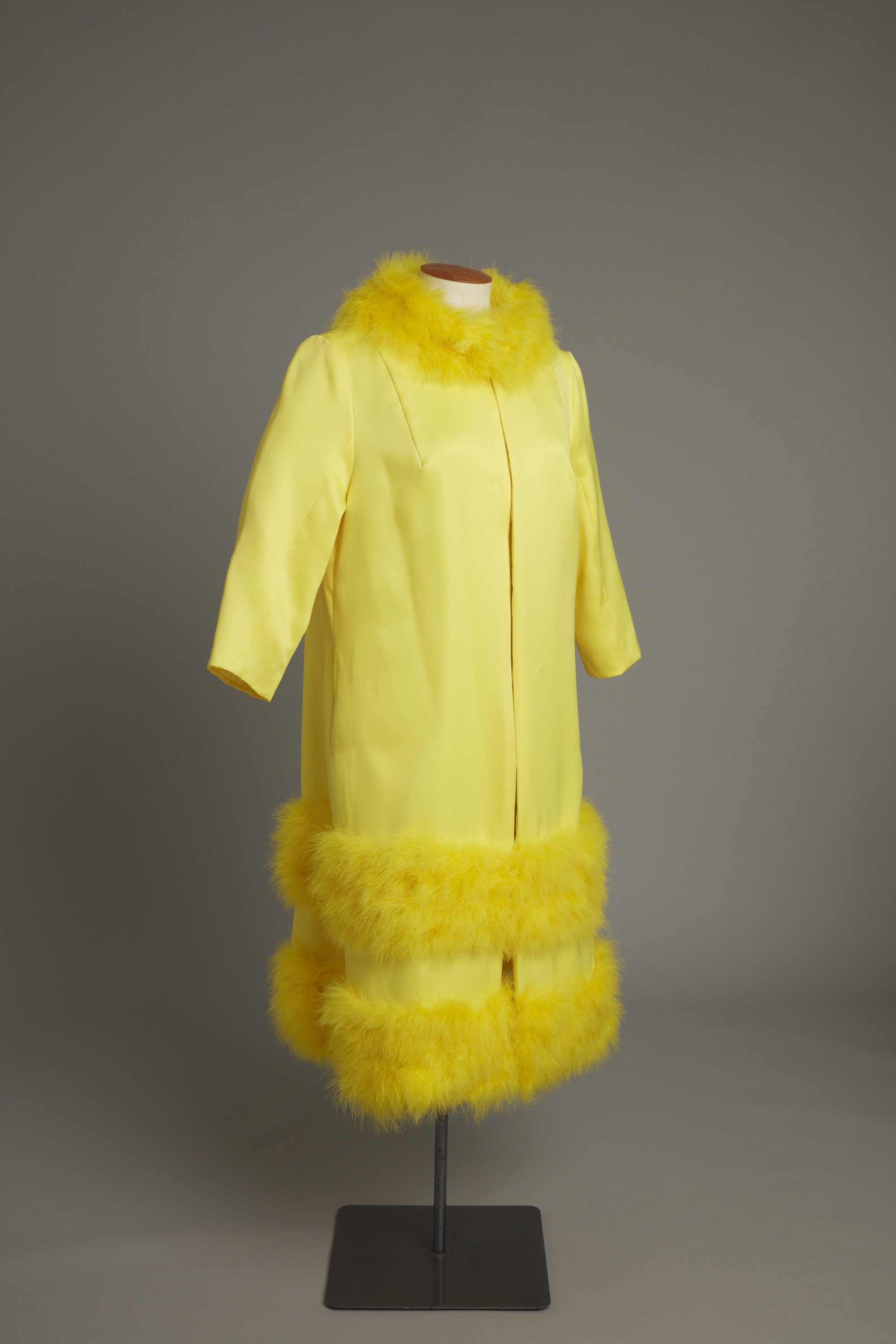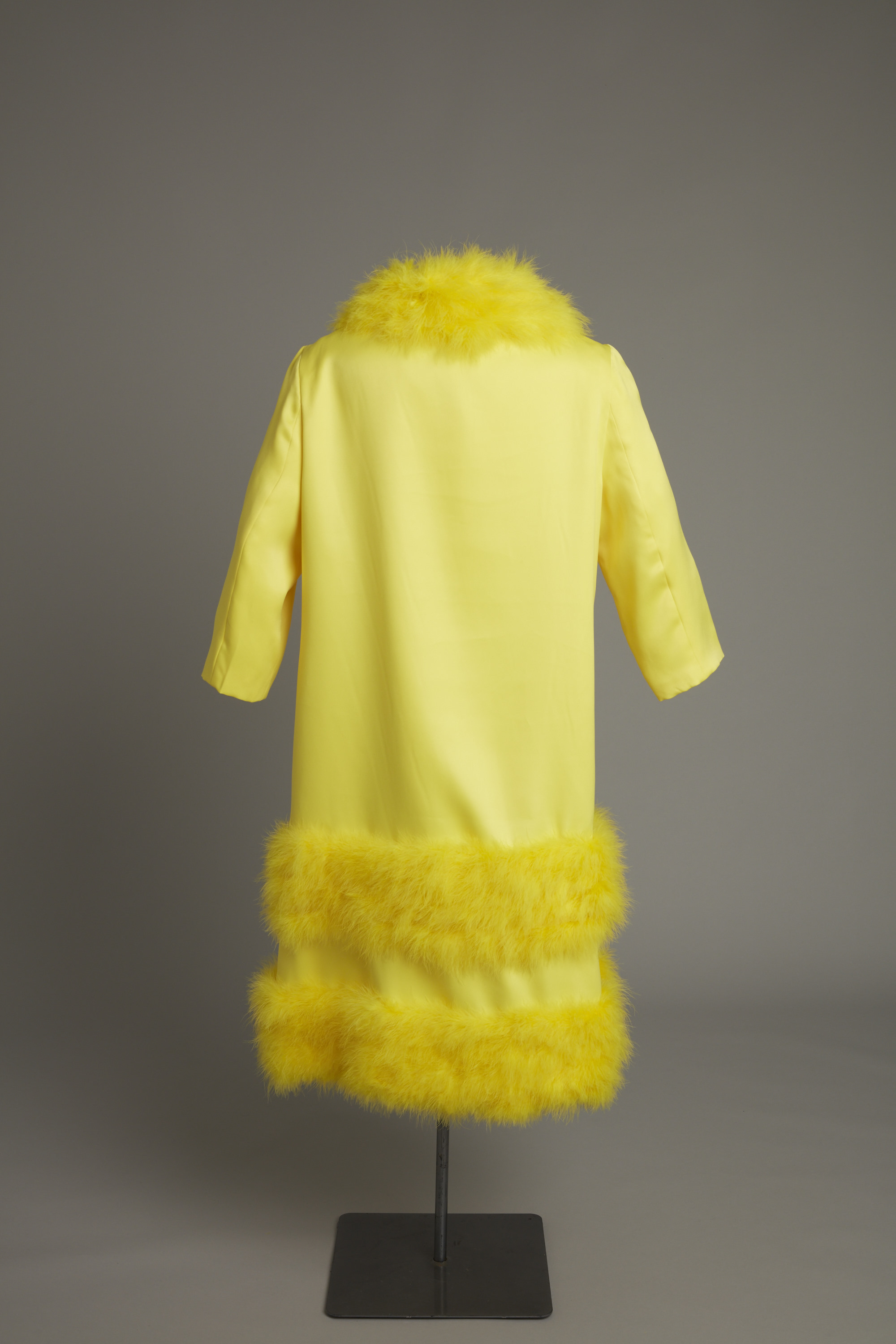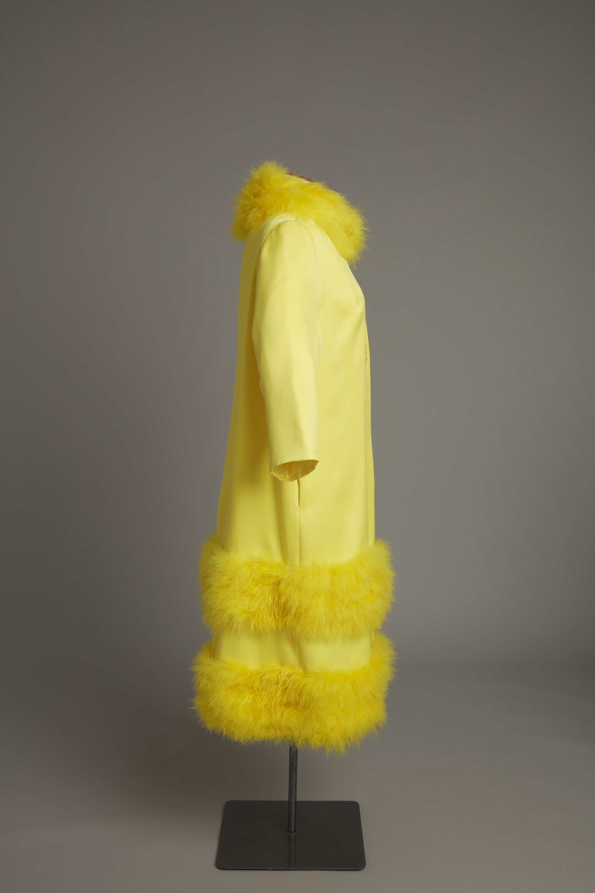 Yellow coat with feather trim