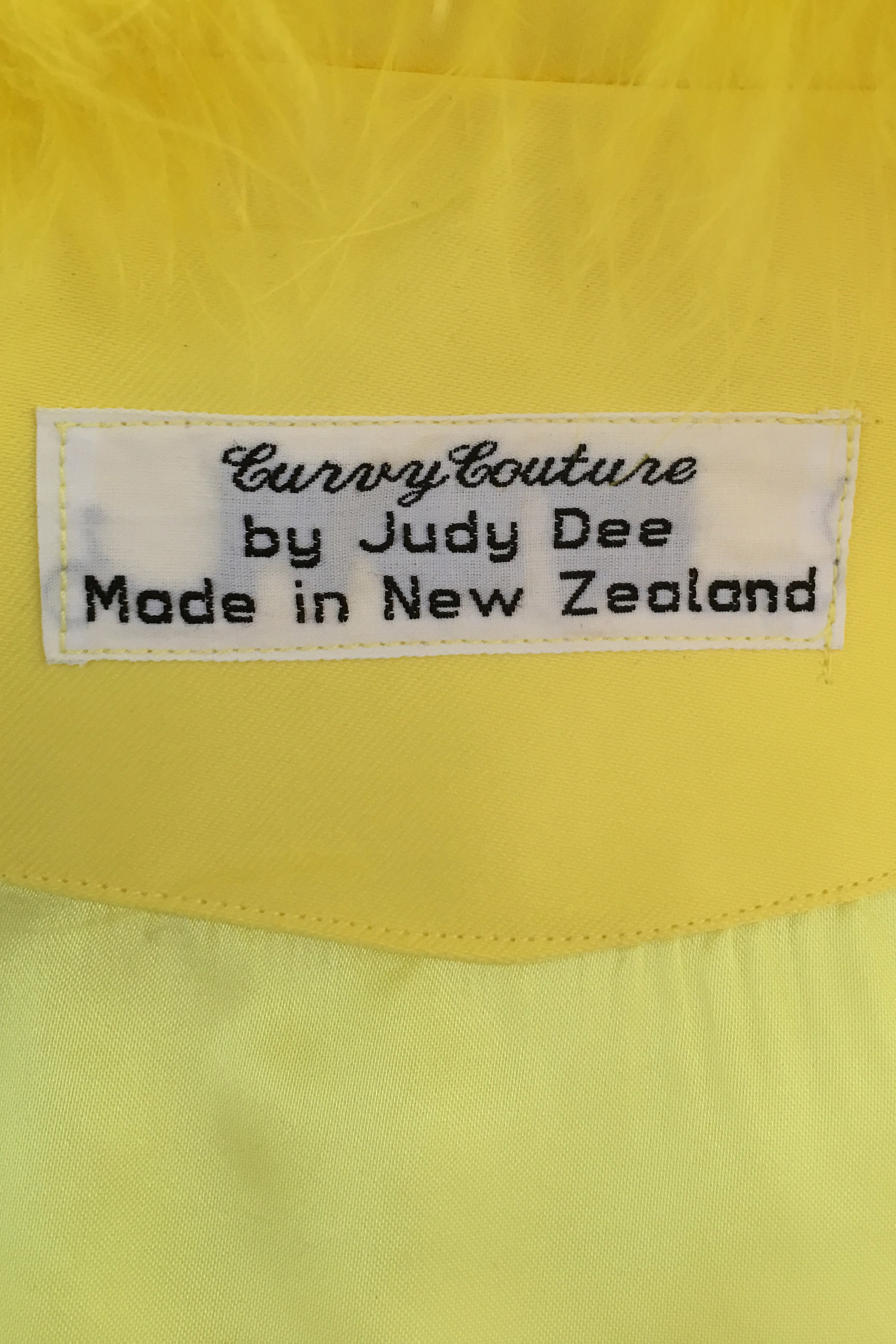 Designed by Judy Moughton of Curvy Couture, Tami's yellow coat is loosely copied from a photo that Tami sent her of a 1960s model. "It's made from double sided sateen - as used for evening gowns and coats in the 30s, 40s and 50s - and lined with satin. Because of the time frame for getting the dress and coat completed, I didn't have time to source the appropriate feather trim, so used costume feathers tacked on to a backing, then attached to the coat."