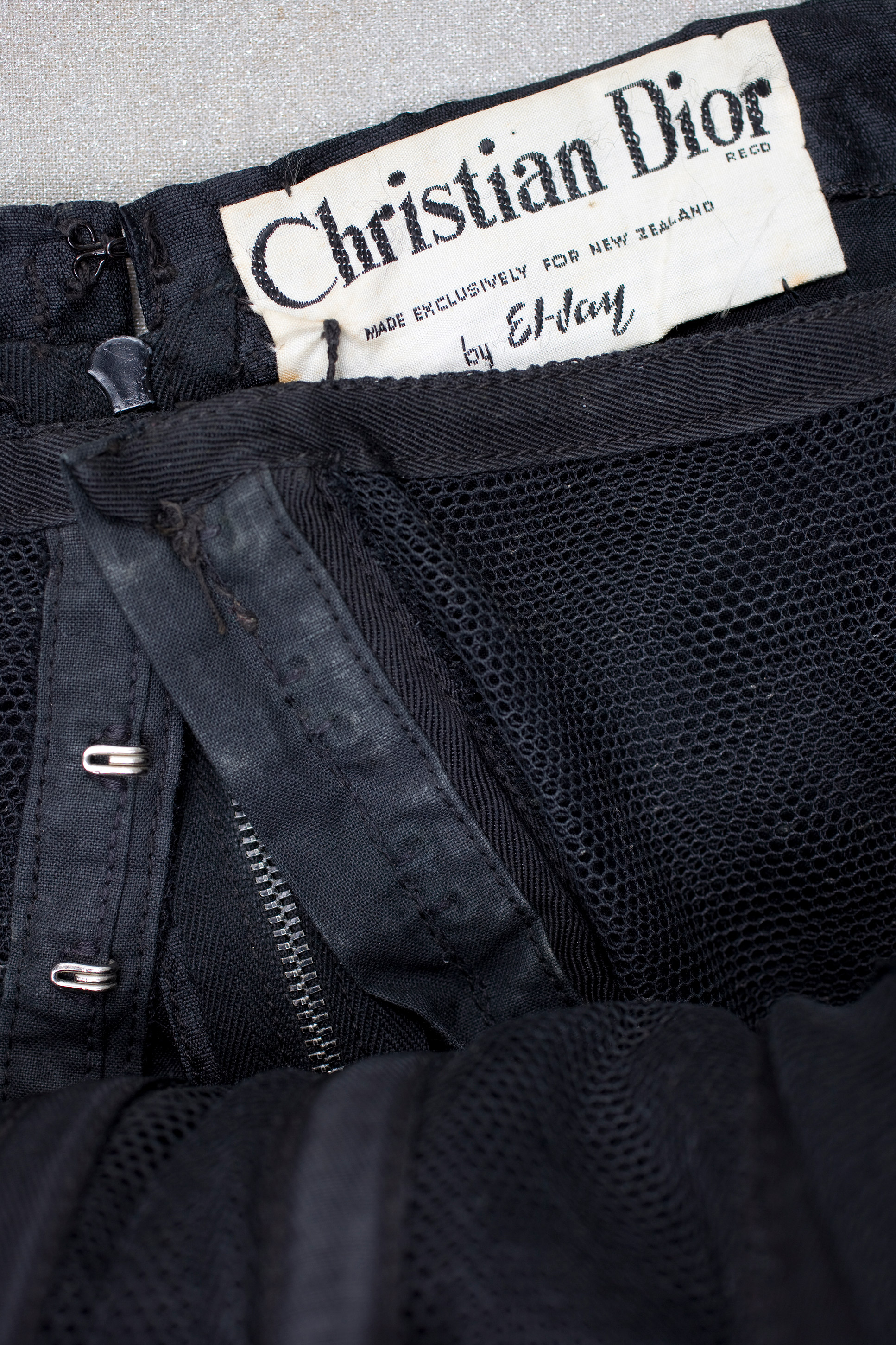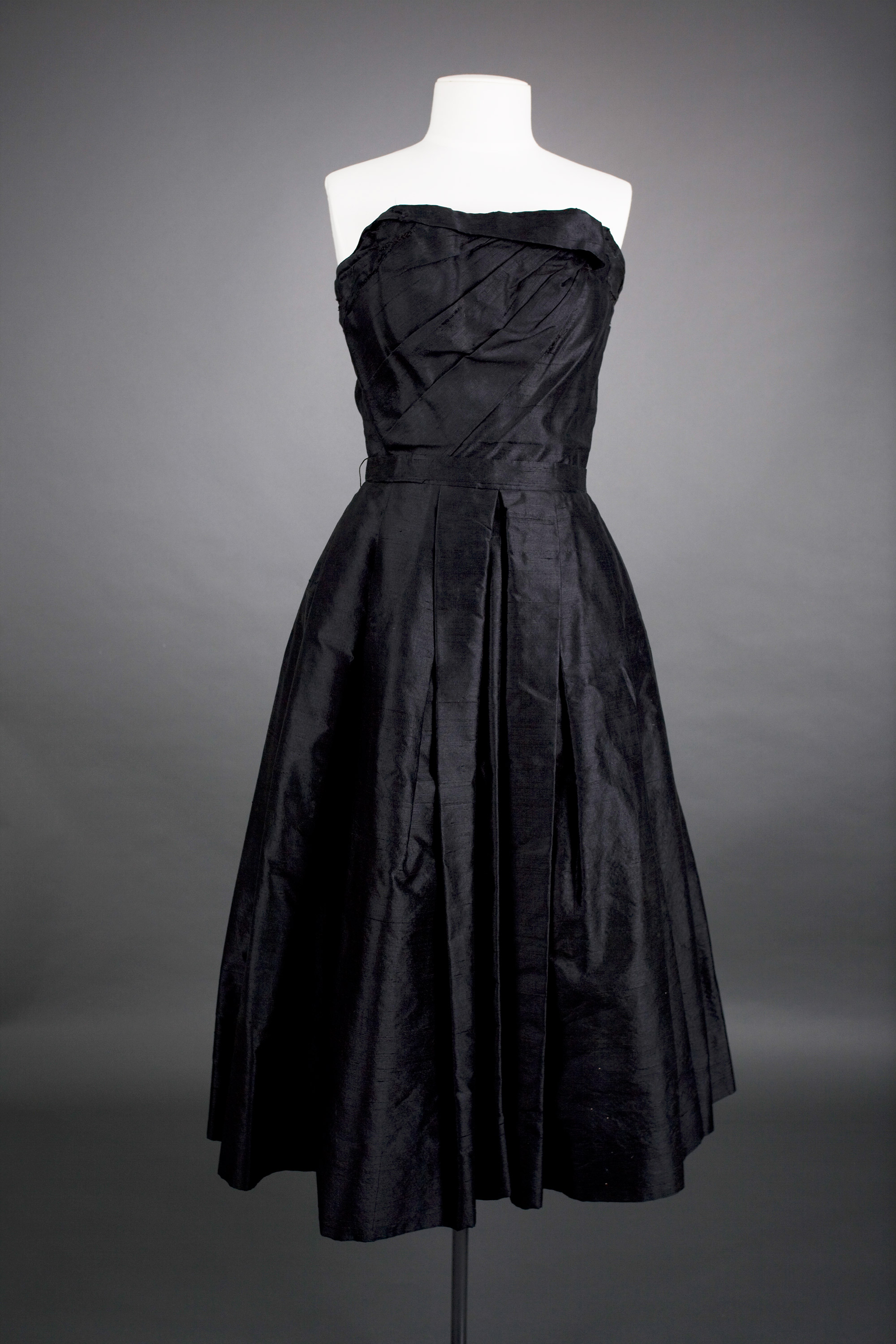 "My mother Pamela Blundell was the great granddaughter of Henry Blundell who started the Evening Post in Wellington. I believe the dress was purchased at Kirkcaldie & Stains. She wore it to cocktail parties and I have worn it to balls." The pleating and construction details are identical to the Kathleen Rae steel blue version held in the Auckland Museum collection. The original large decorative self fabric bow threaded through the front of the bodice has been probably been removed from this dress at some stage in order to update it and extend its fashionable life. Read more about Gus Fisher and the El Jay label in the New Zealand Fashion Museum publication Looking Terrific: The story of El Jay.