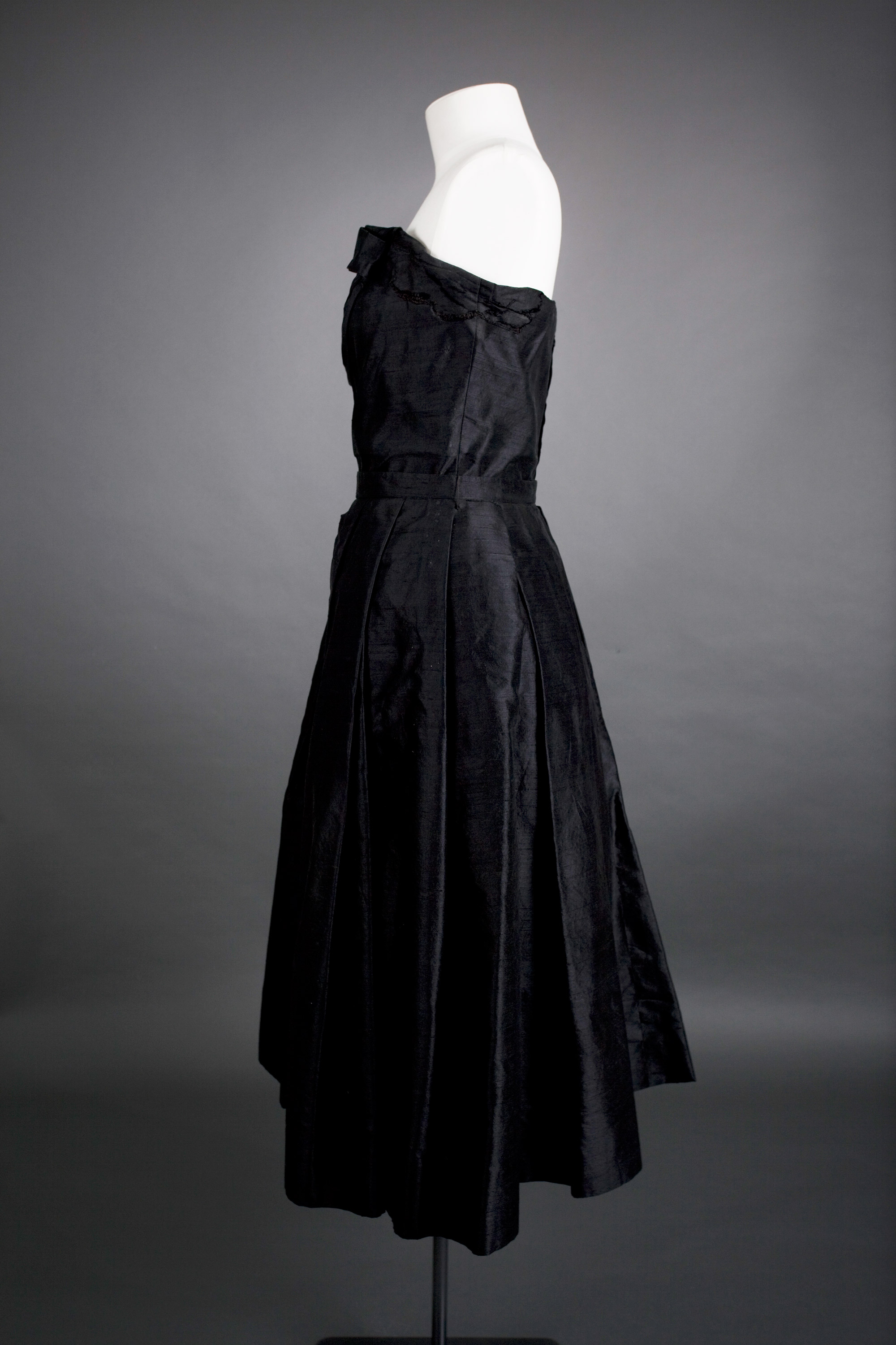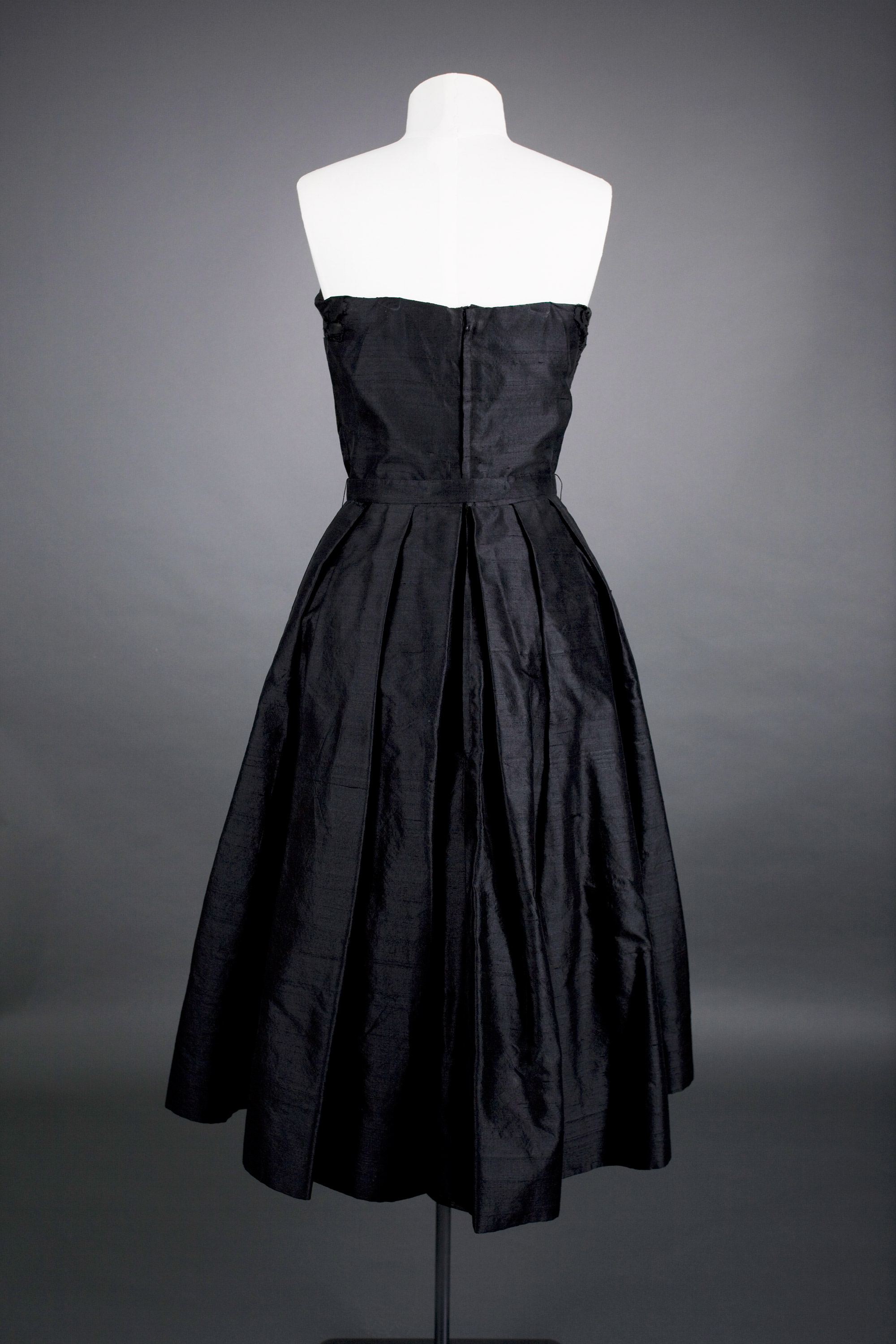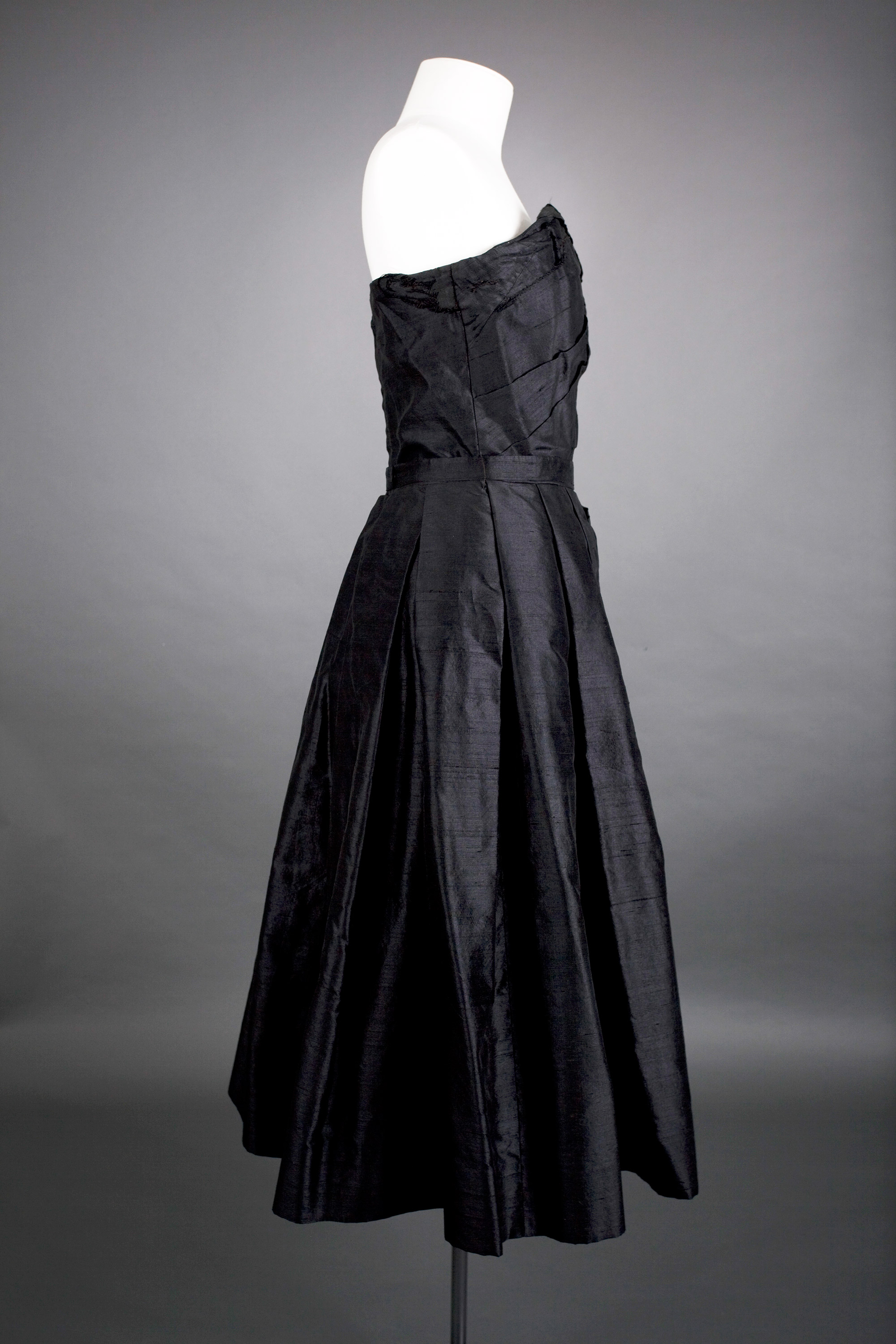 The strapless bodice has a separate boned net corset which is attached to the lining and net underskirt. The slub silk fabric is entirely backed with organza. The skirt is very full with deep double pleats into the waistline. The fullness at the hem is pushed out by a stiffened edge on the heavy tulle of the built-in underskirt