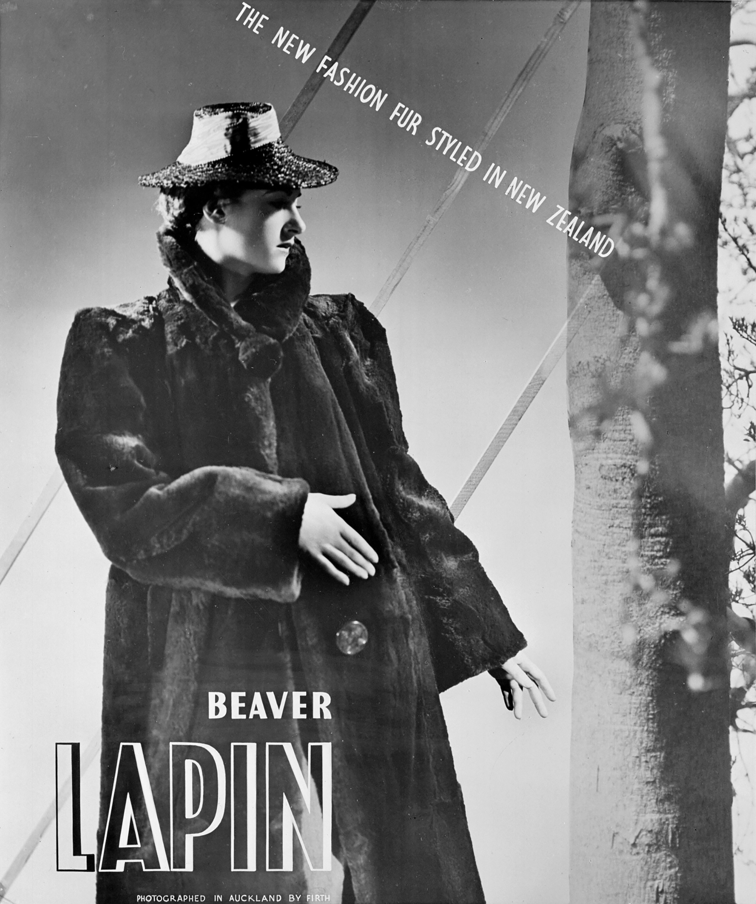In about 1940, Auckland photographer Clifton Firth took a series of advertising photos for the furrier, Mooneys Furs. The wholesale business was founded by George Stewart and James Kennedy Mooney in Dunedin in 1912. The advertisement features Clifton Firth's Hollywood-inspired photograph, overlaid with the text 'Beaver Lapin: The new fashion fur styled in New Zealand'. It's likely 'Beaver Lapin' refers to inexpensive rabbit fur being sheared or dyed to imitate the pricier beaver.