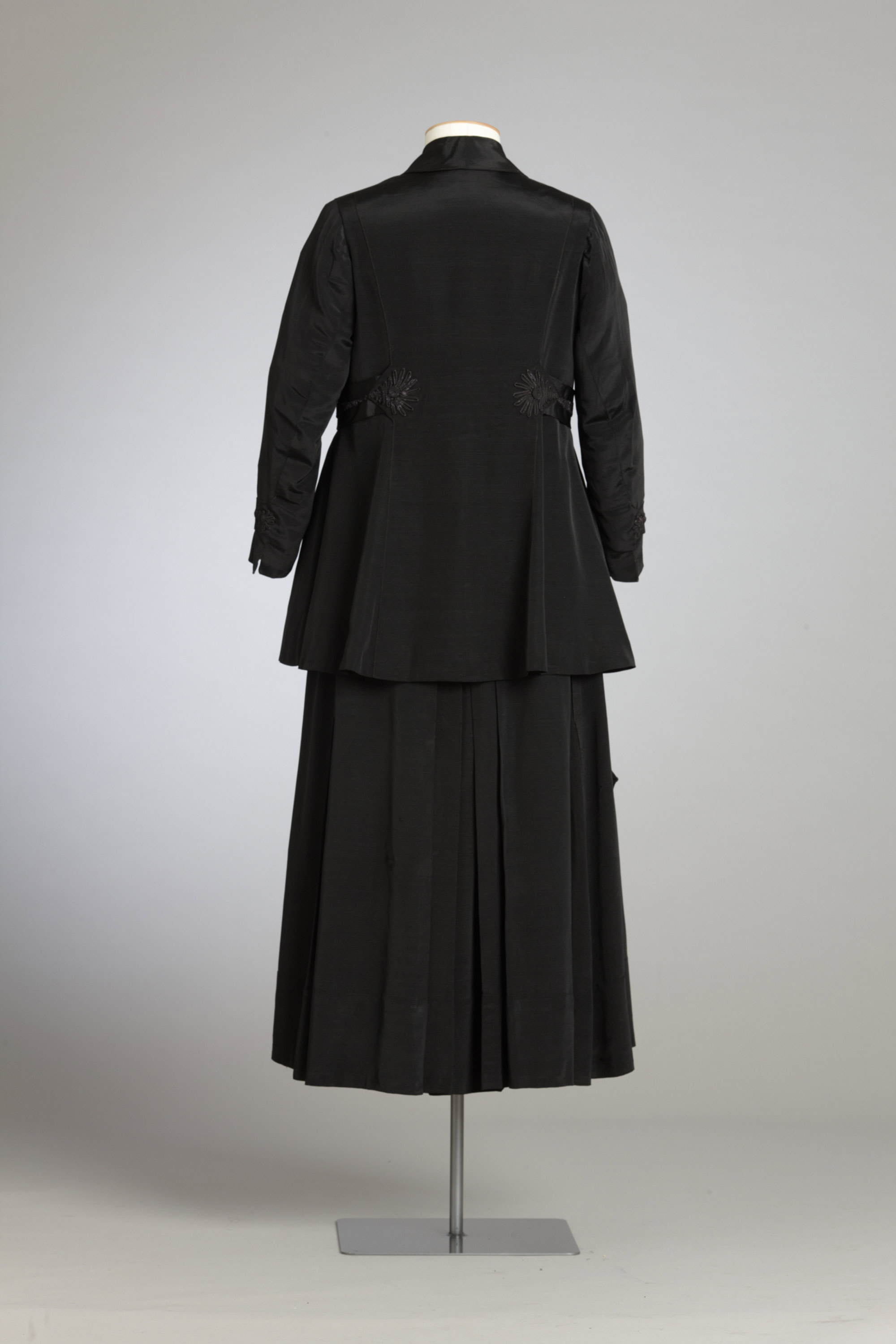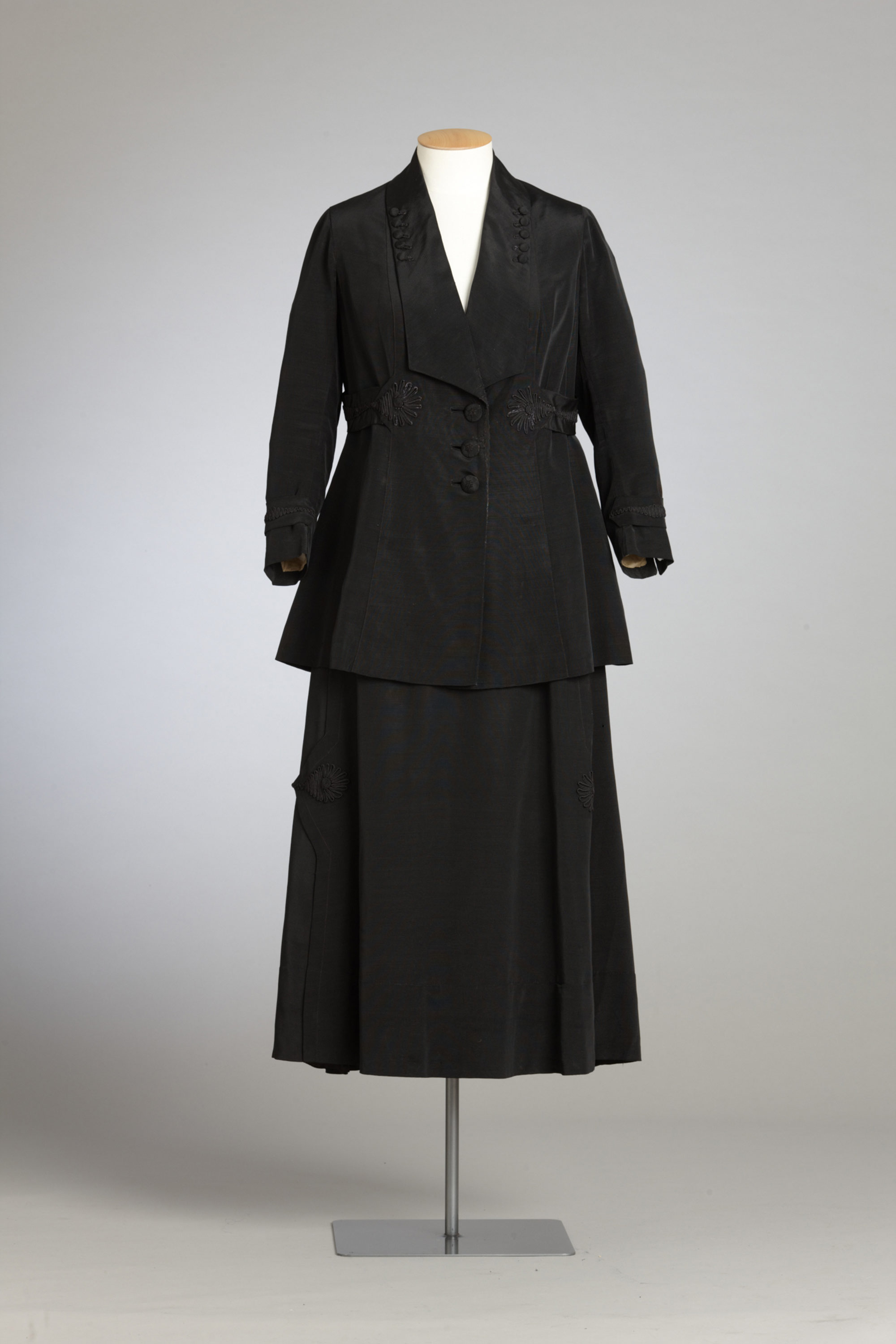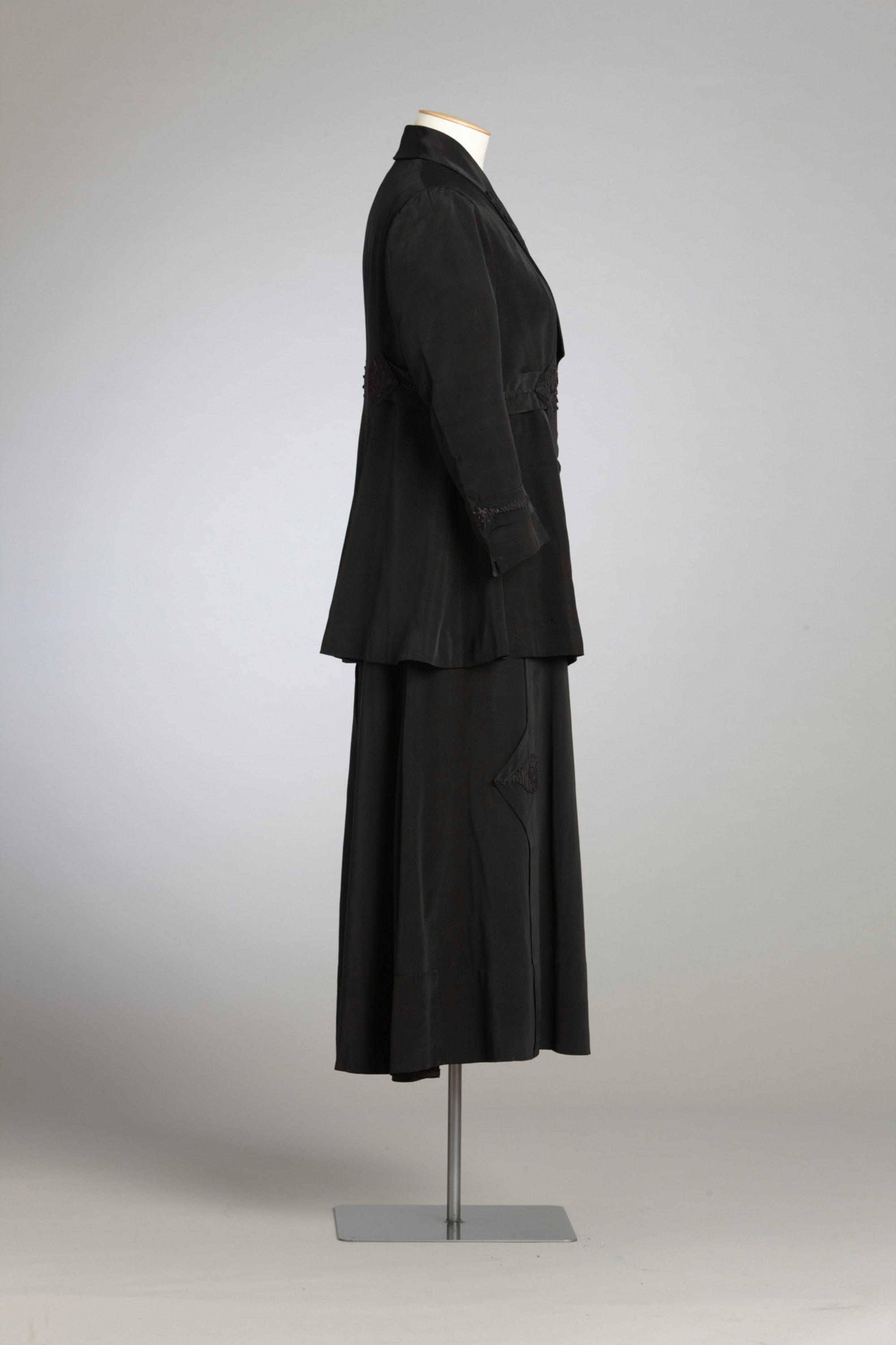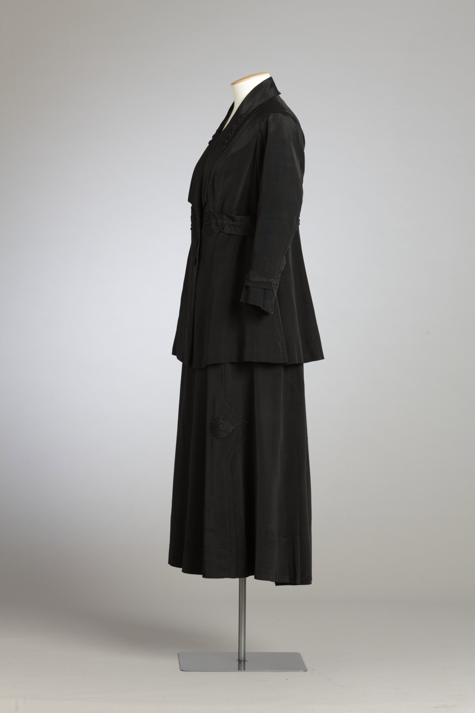The owner of this garment is unknown and we do not know how it came to be in New Zealand. Perhaps it was brought by an Australian who came here or the owner travelled to Sydney and purchased it there. We can see from the quality of the fabric, the lavish decoration with cornelli work and the embellishment with decorative buttons that it would have been an expensive suit. We imagine that the owner was interested in being fashionable. Despite the war, ‘fashion’ was still strong and people who had the means and the interest would have kept up to date. Read more about wearing the colour black in the New Zealand Fashion Museum publication Black: The history of black in fashion, society and culture in New Zealand.