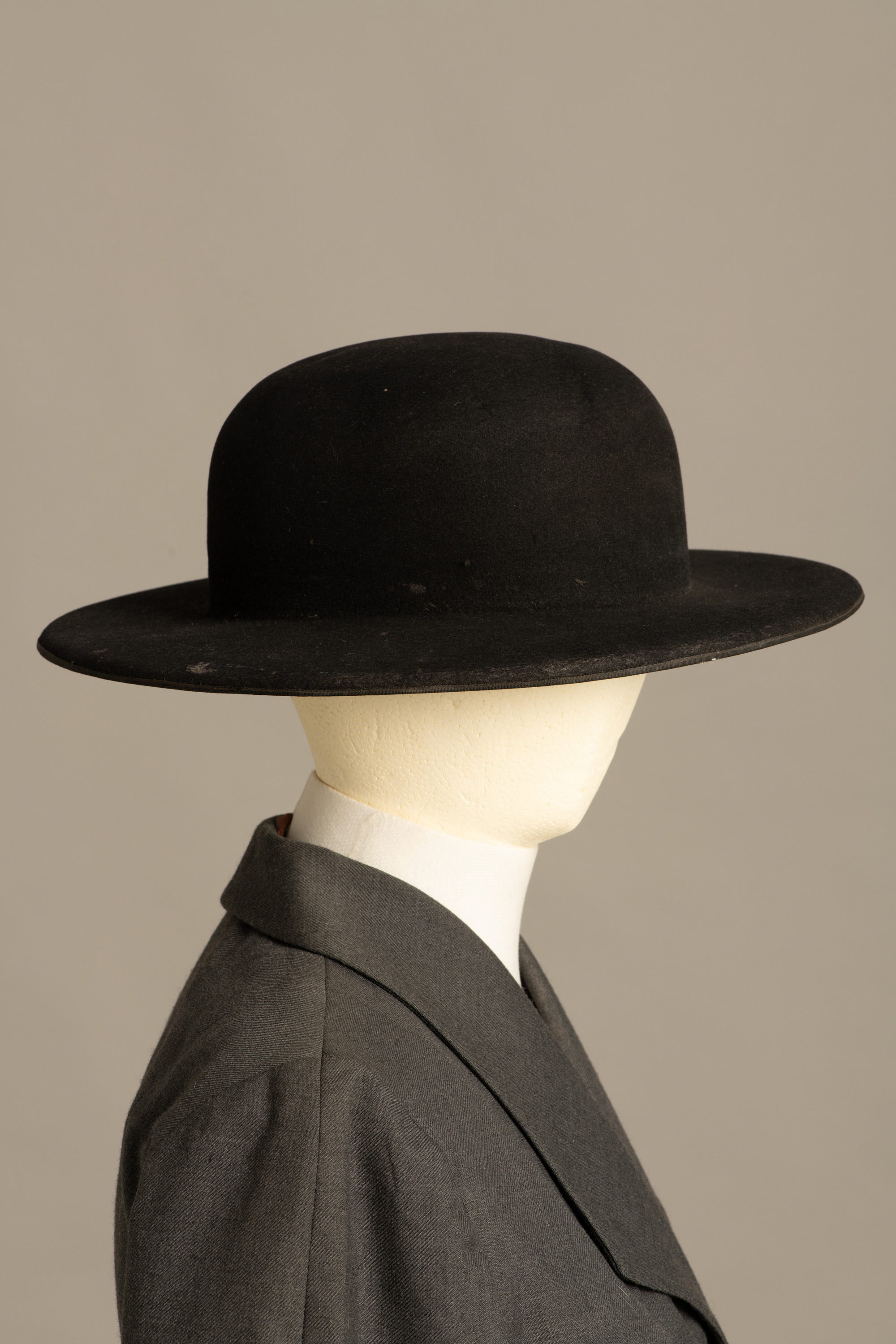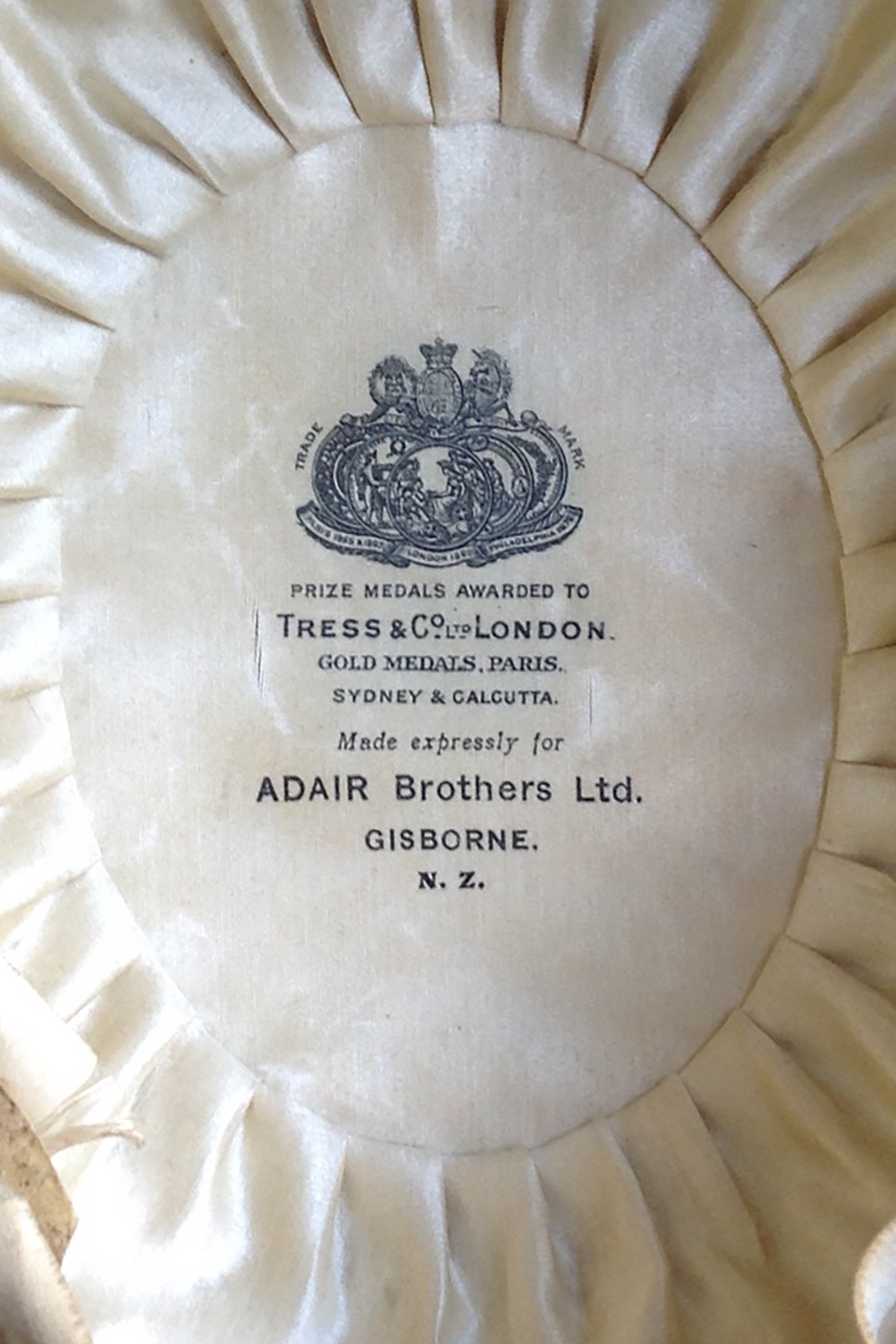 This riding hat was owned by Anna Susan (Susanna) Taylor who was born in 1872. Anna lived at Tangitere, near Nuhaka in the Hawke's Bay, where she and her husband owned a farm. Tress & Co was a London label that was stocked at Adair Bros, a Gisborne retail store. It was typical at this time for retailers to sell a mix of local and imported manufactured goods to supplement the work of tailors and dressmakers.