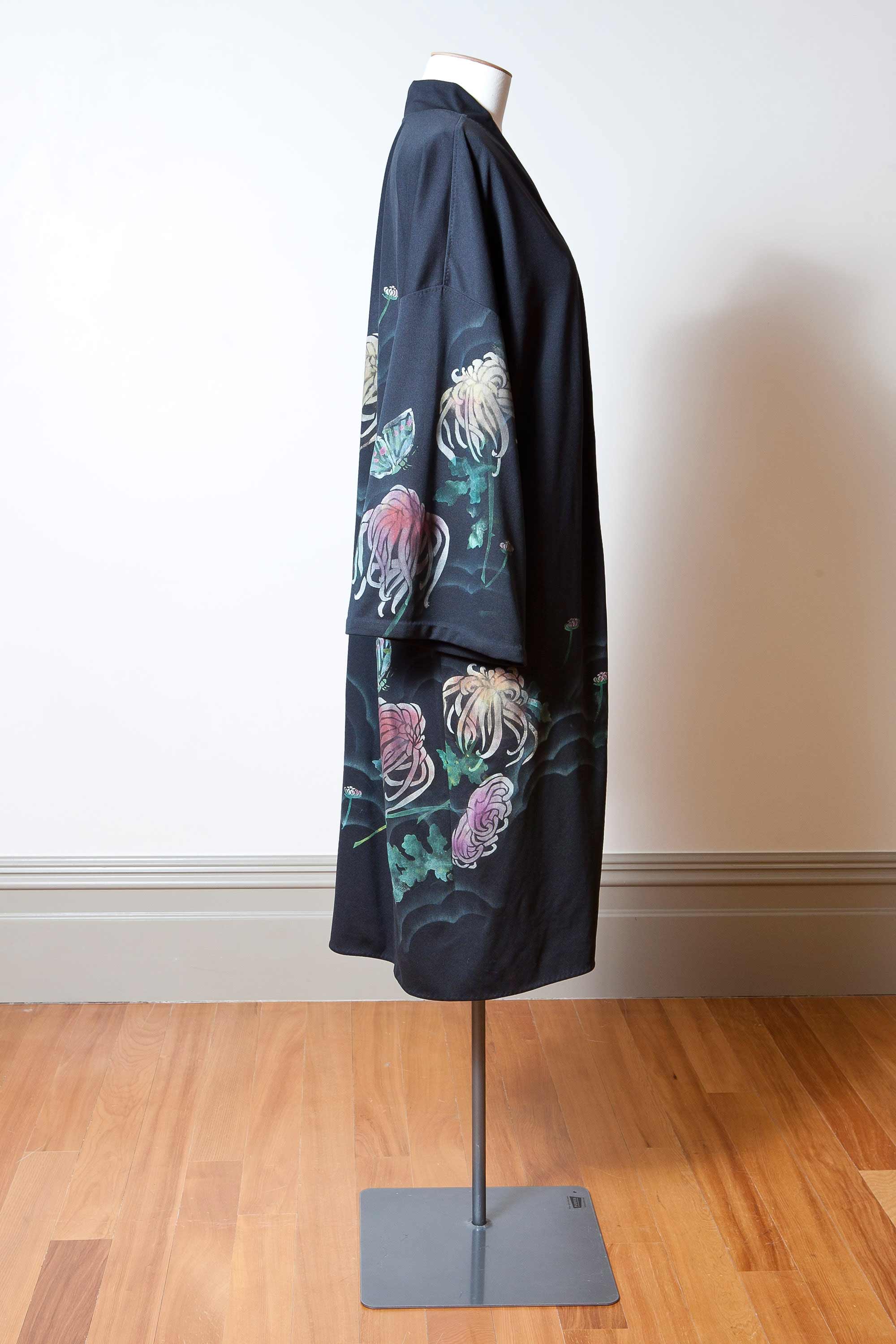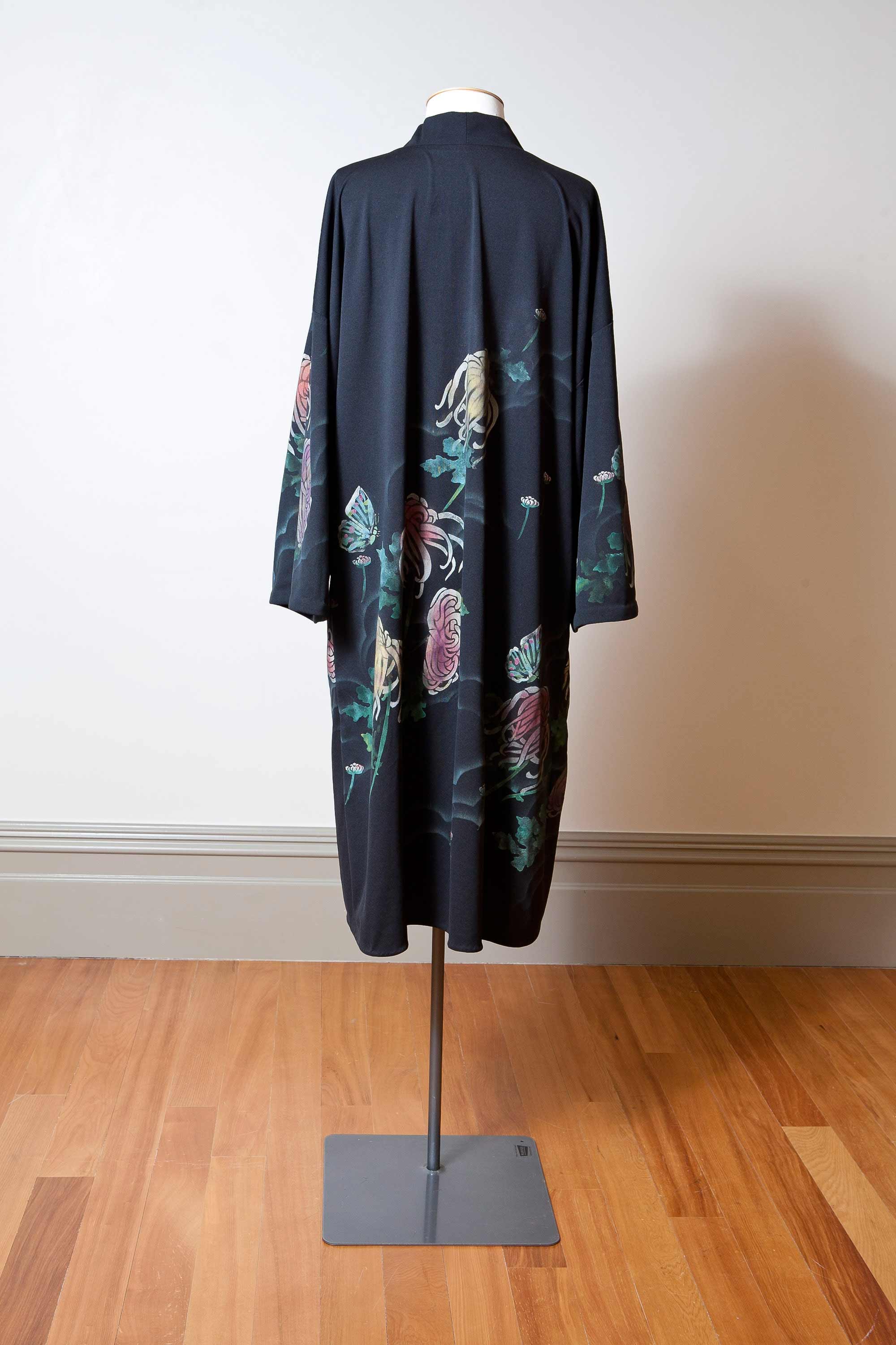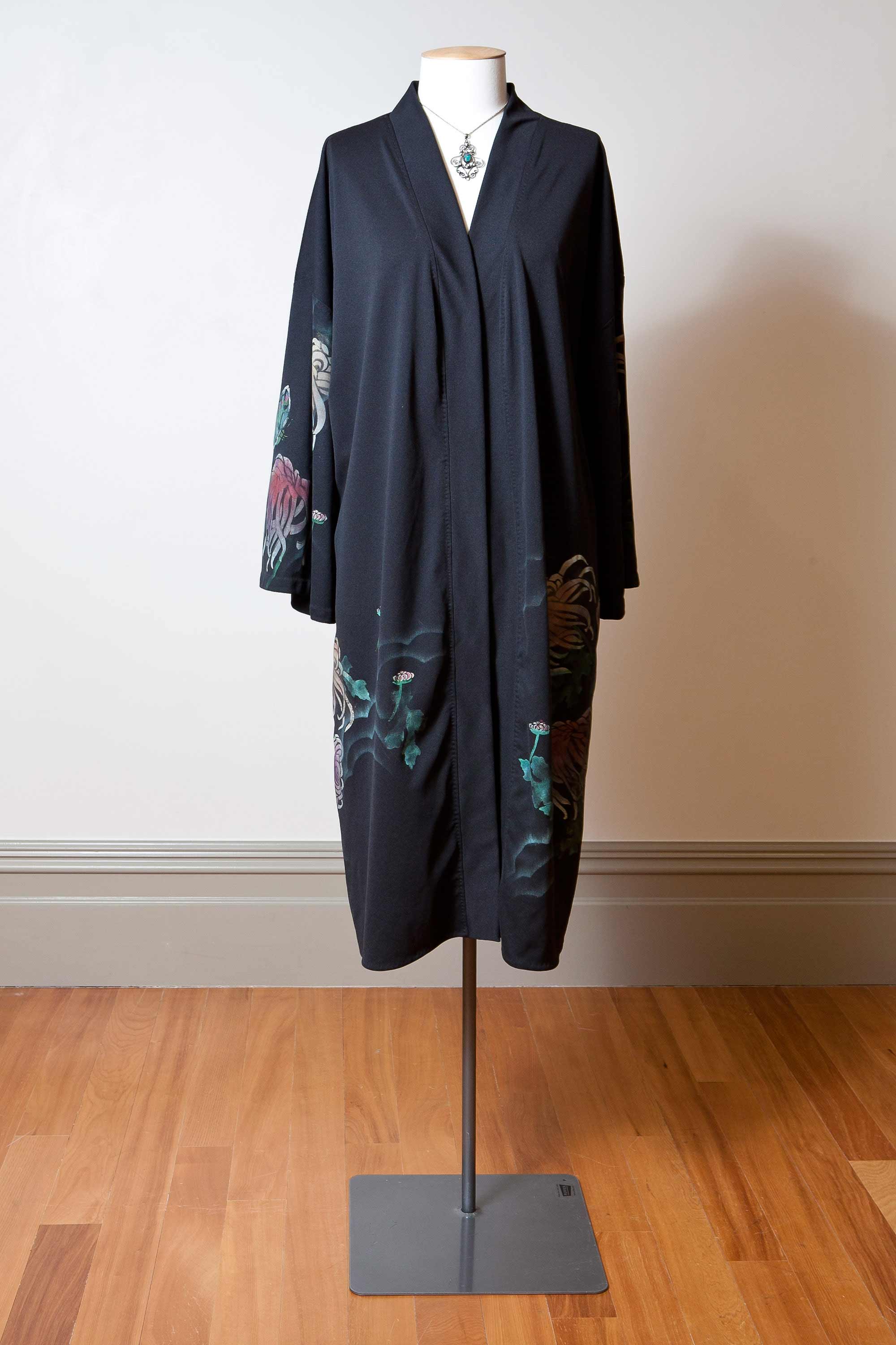 Shari Cole admired the work of designer Susan Holmes who was based at Brown's Mill in Auckland. When Shari received some money as a gift for Mother's Day, she commissioned Susan to stencil the black jersey fabric. Shari used the fabric to make the kimono coat.