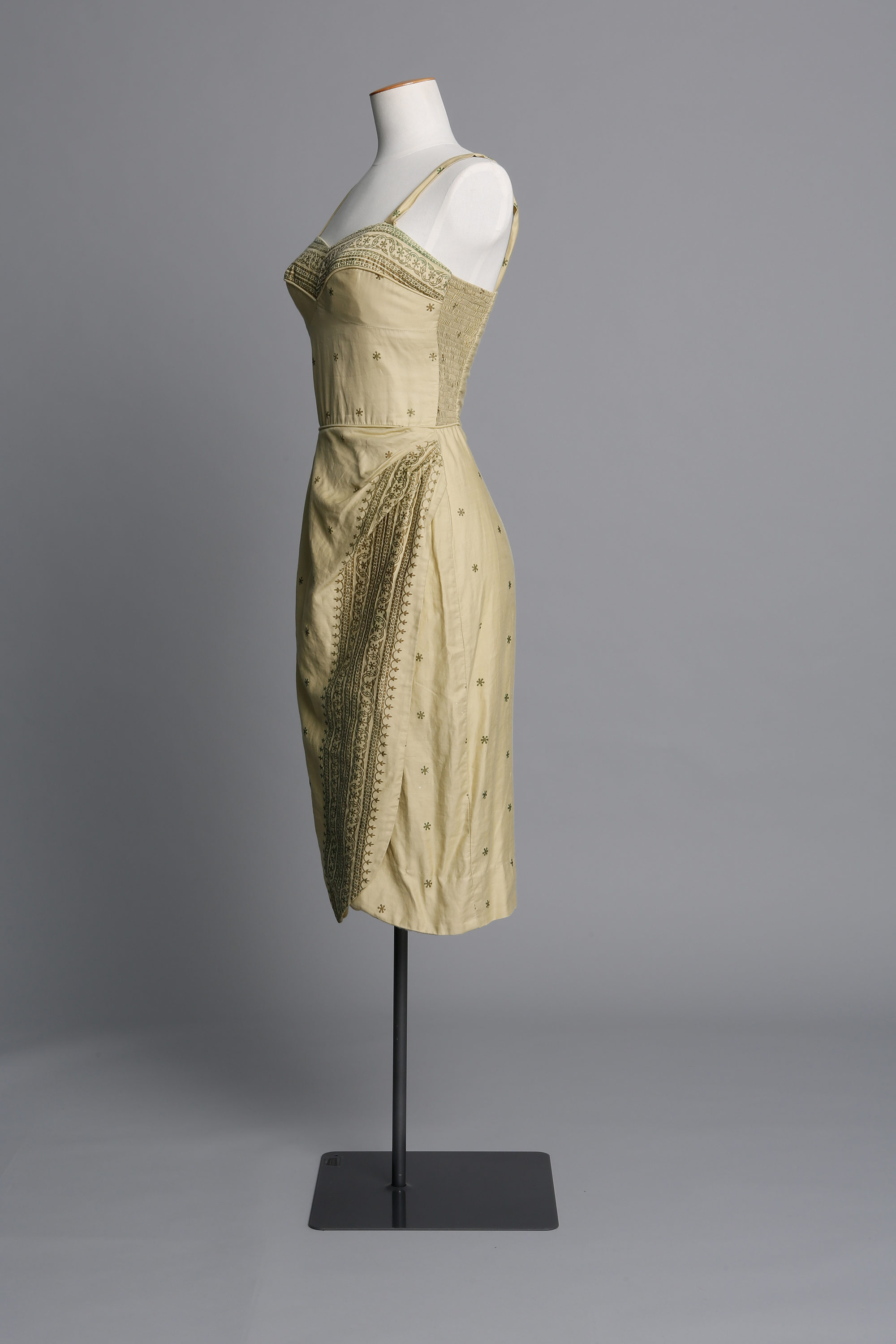 The bodice features shaped bra cups, adjustable straps with buttons to secure, piping around the bust and waist, and shirring elastic panels at the sides