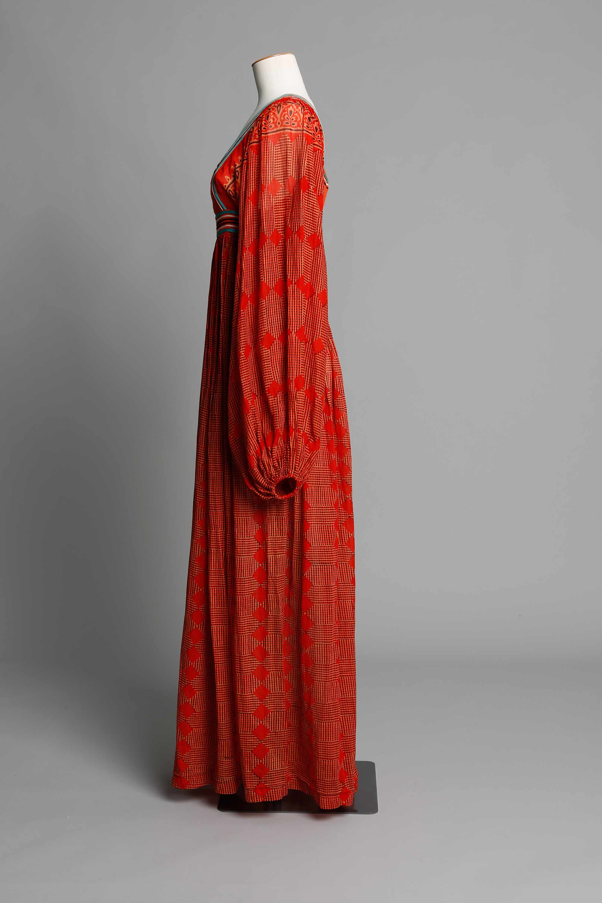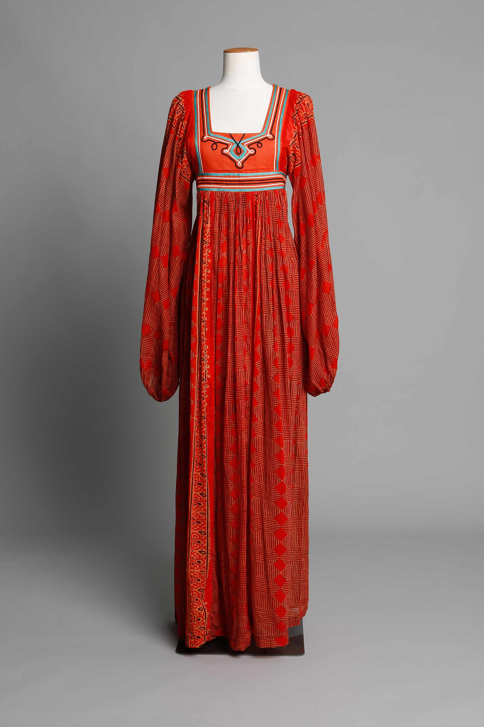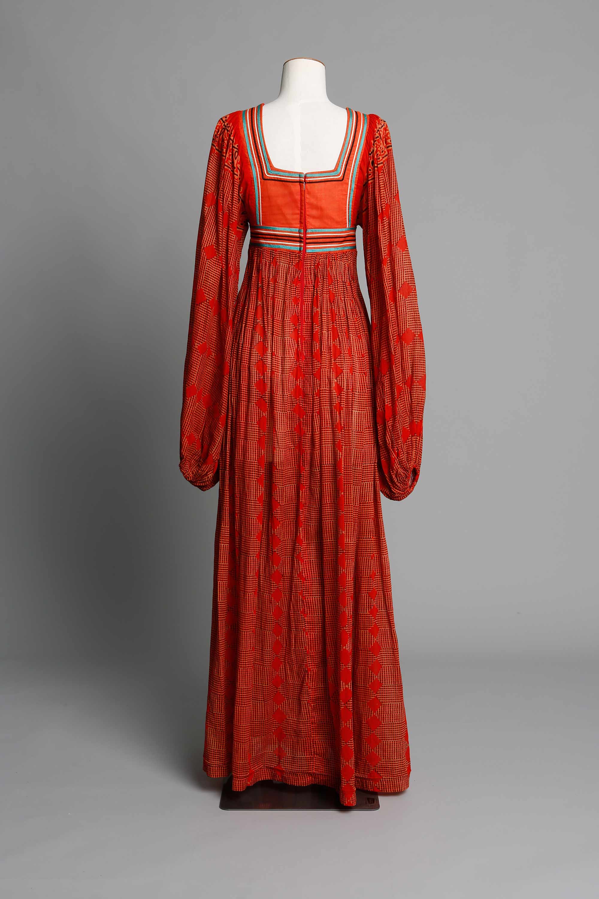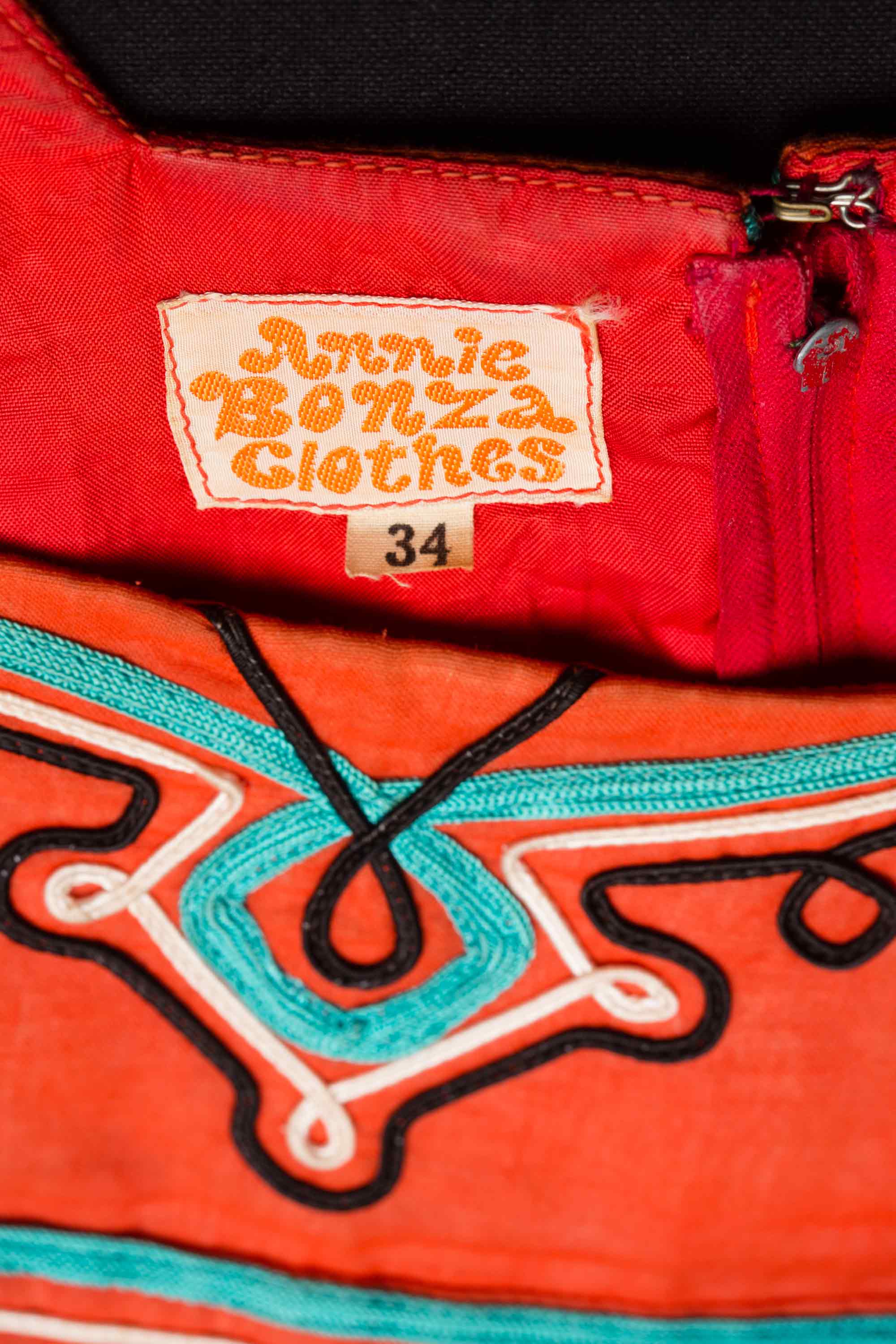 This dress is a typical Annie Bonza design from the 1970s. One of Annie’s first attempts at braiding on clothing was influenced by an Austrian friend. "She was a forceful character and had a huge influence over everyone. She and her sister had been smuggled out of Austria in the early part of the war, and they’d ended up in England in a women’s prison. They never saw their parents again. The only thing she had from Austria was a plum wool curtain with beige cording. It was thick, and the bottom of it was cornellied with a peasant design. I copied that Austrian design using bright colours on a black velvet skirt. It was pretty in-your-face but very effective." Annie’s braiding took on an unintentional Māori feel, something she now attributes to the influence of the famous weaver Dame Rangimārie Hetet, who taught her Māori craft when she was at Te Kuiti High School. Read more about 1970s fashion in the New Zealand Fashion Museum publication The Age of Aquarius: A 70s Revolution in Fashion.
