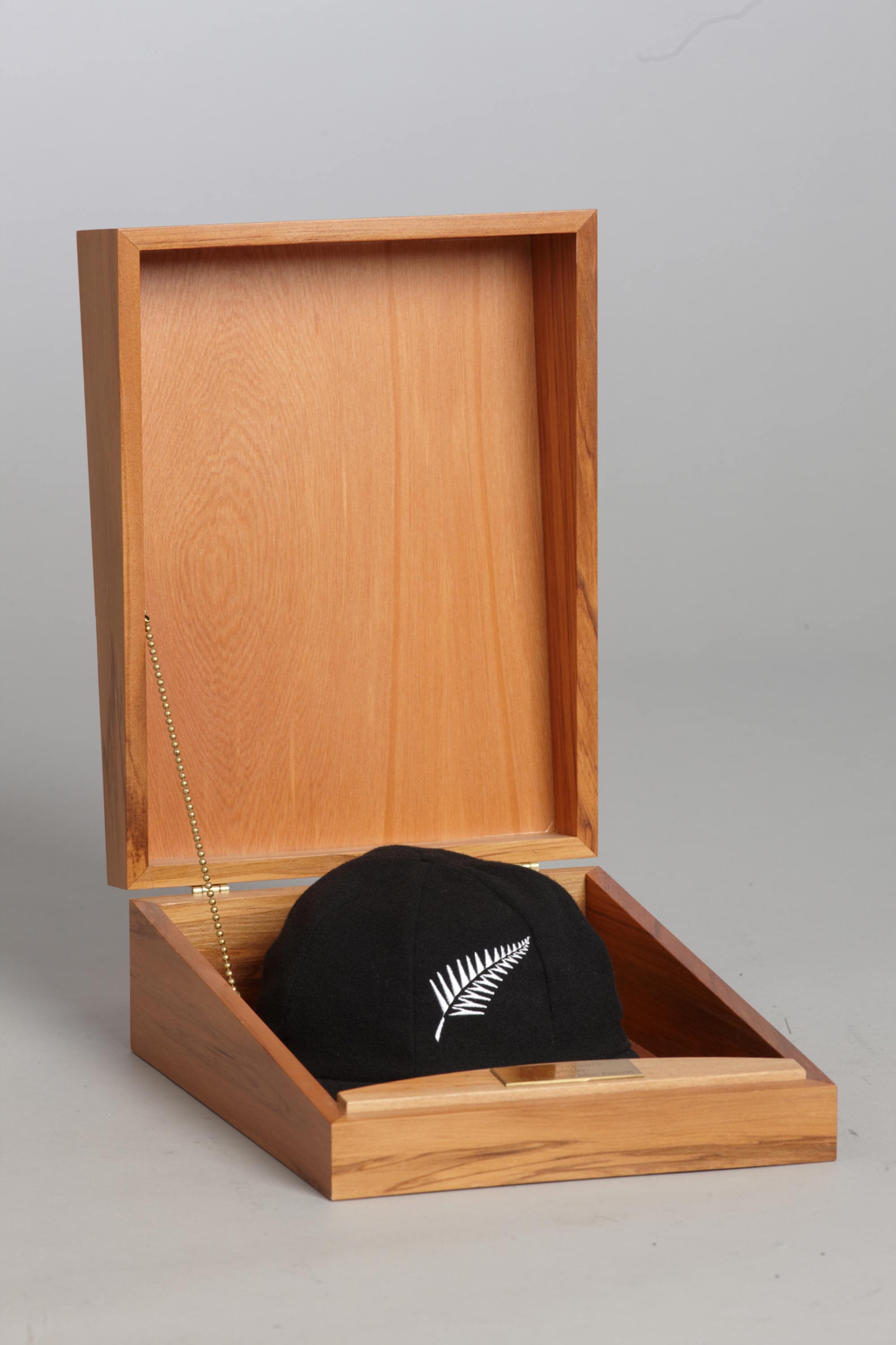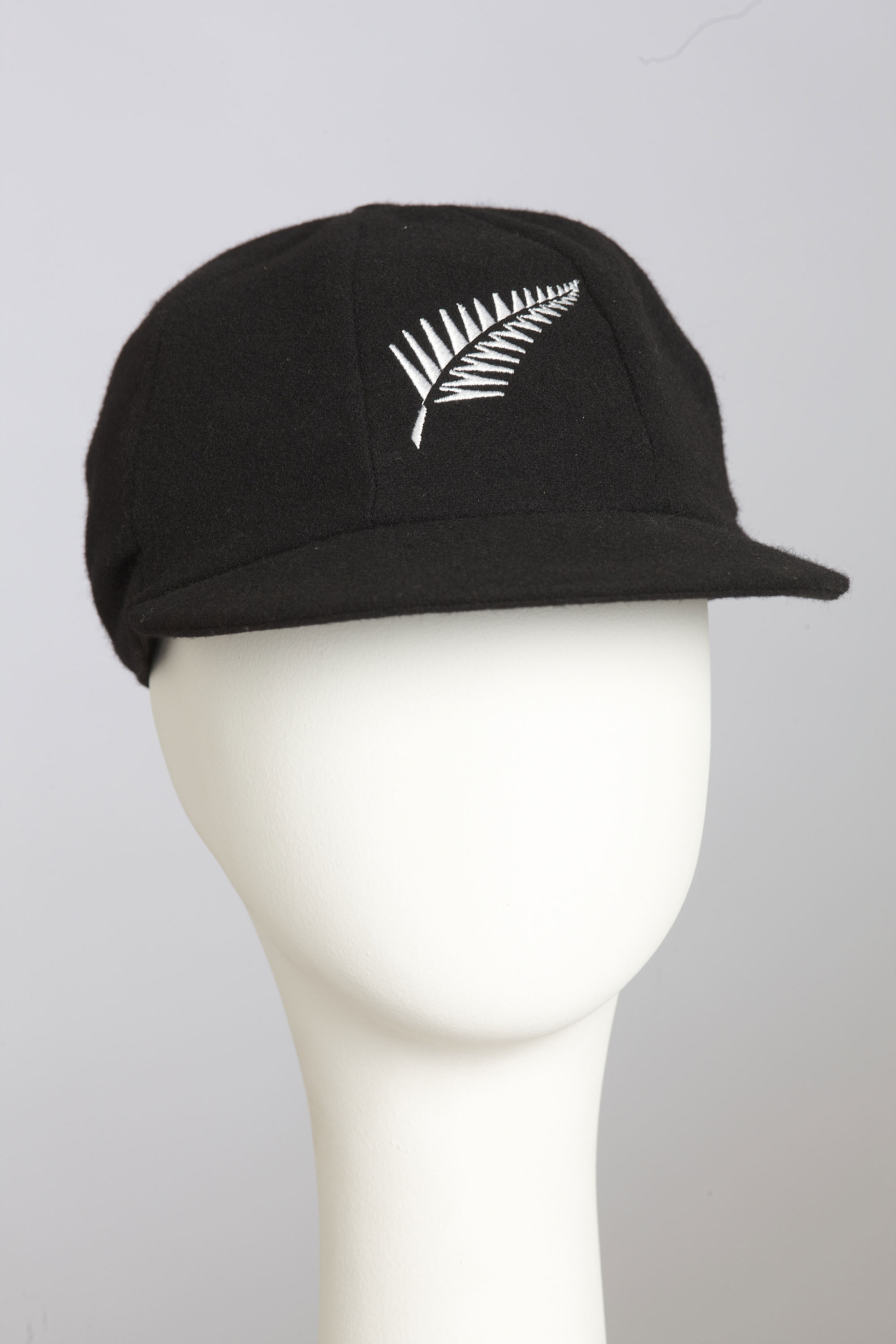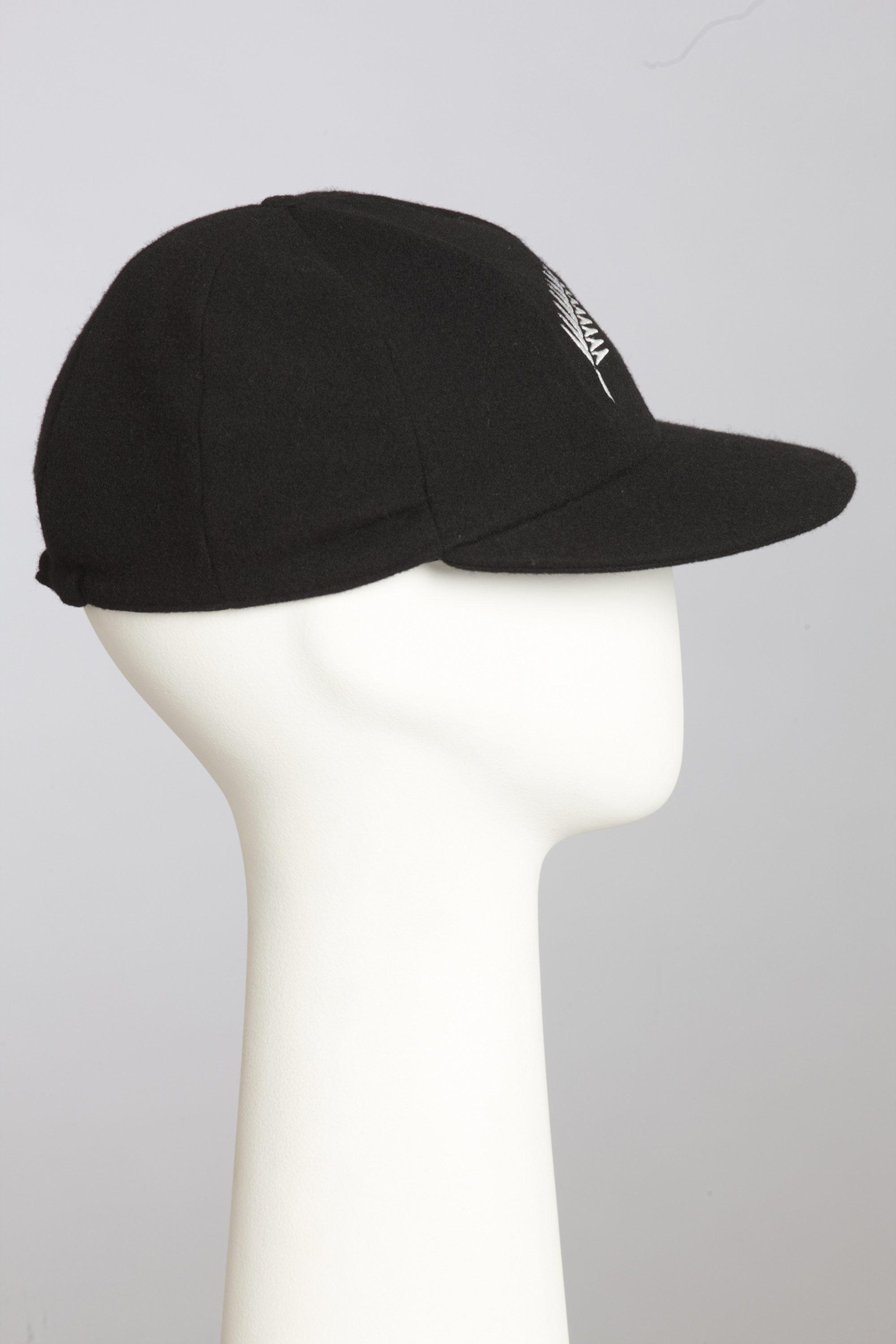 Martin Snedden is the CEO of the Rugby World Cup 2011 but he “earned his cap” in the sport of cricket. First as a player from 1980 until 1990 and then as CEO of New Zealand Cricket from 2001 until 2006. The caps are numbered on the back and Martin’s Test Cap number is 149. The value and honour of being capped is evident, both from the quality of the display box complete with in- built headstand, and also from the fact that the New Zealand team has been named the Black Caps since 1998. Read more about wearing the colour black in the New Zealand Fashion Museum publication Black: The history of black in fashion, society and culture in New Zealand.