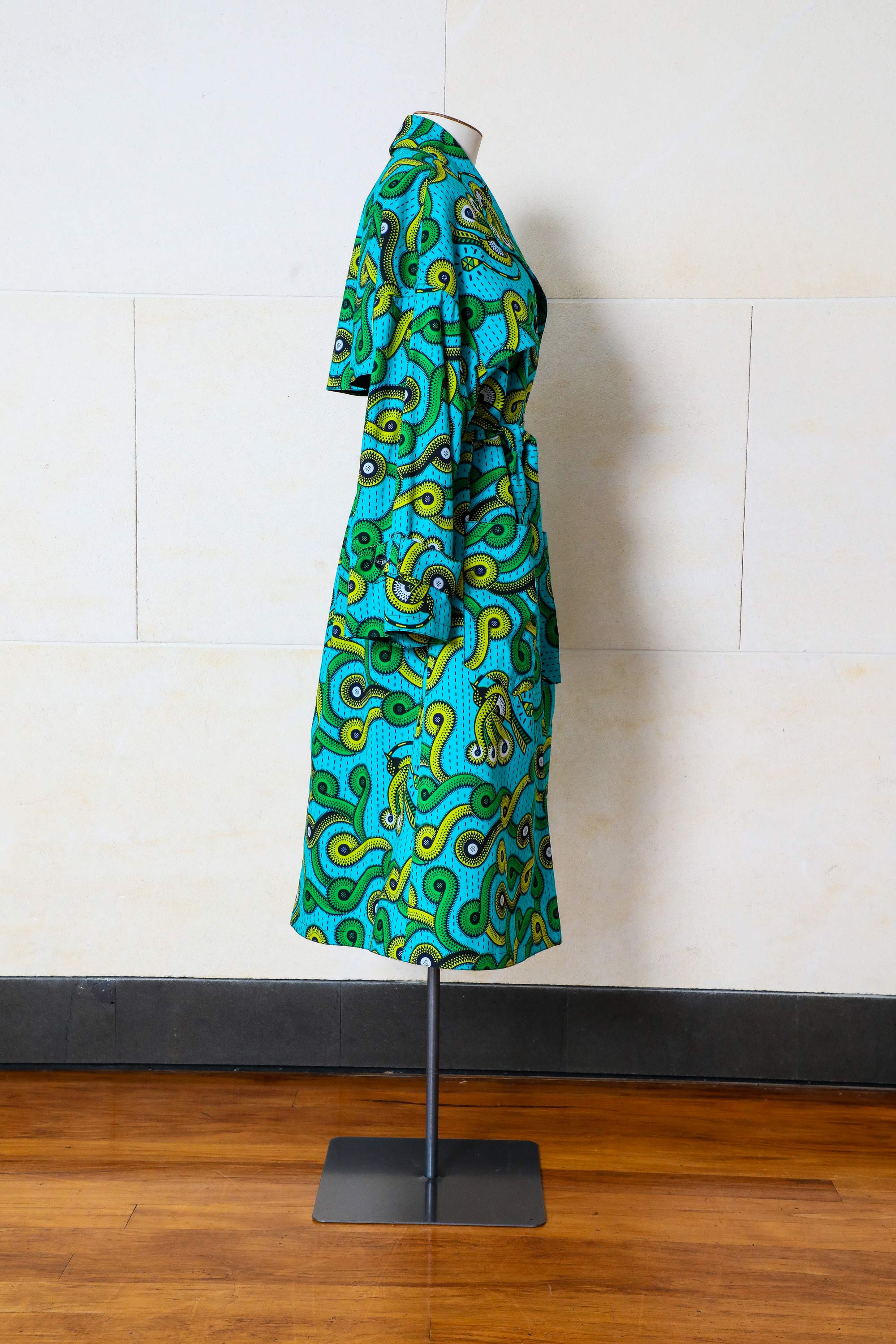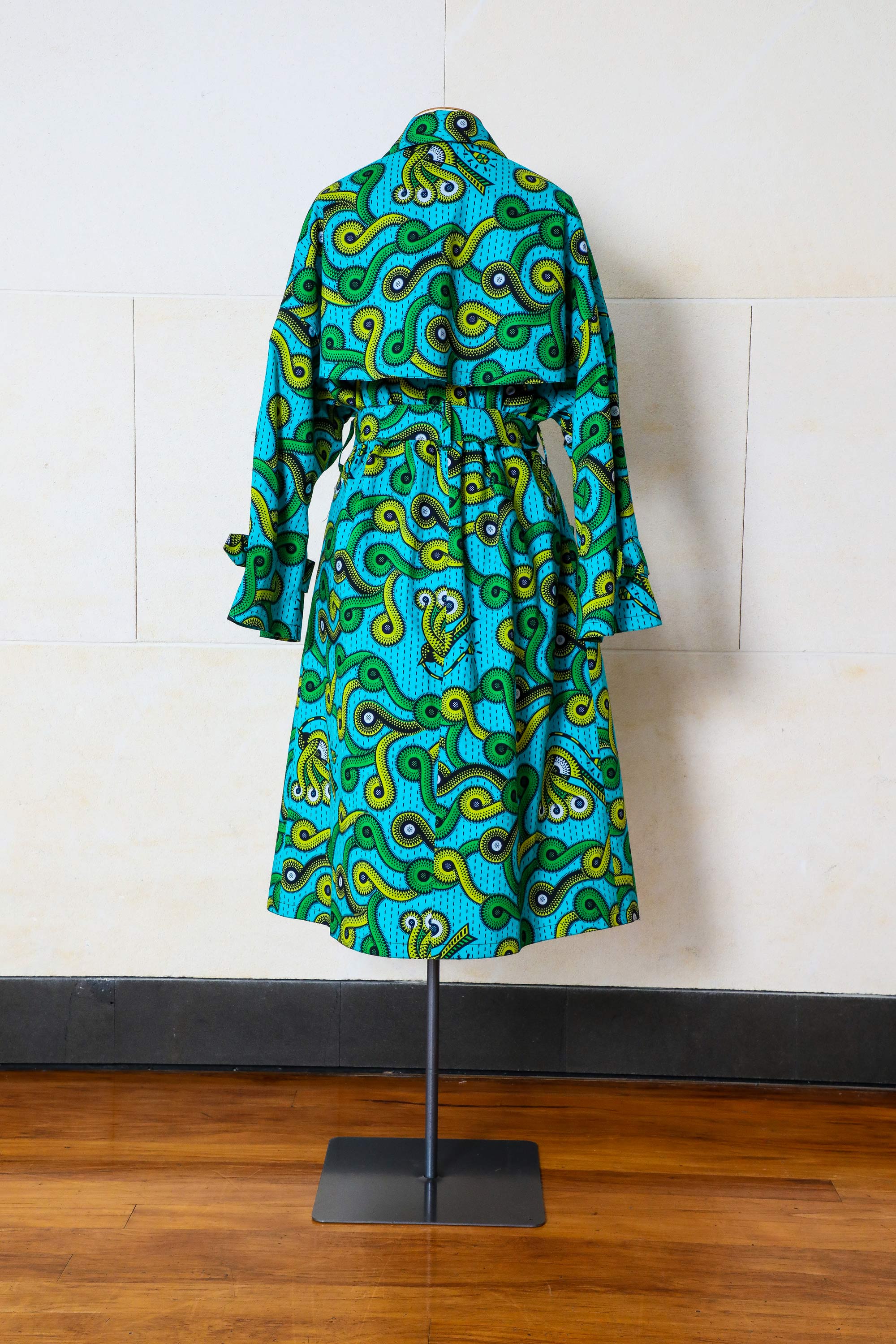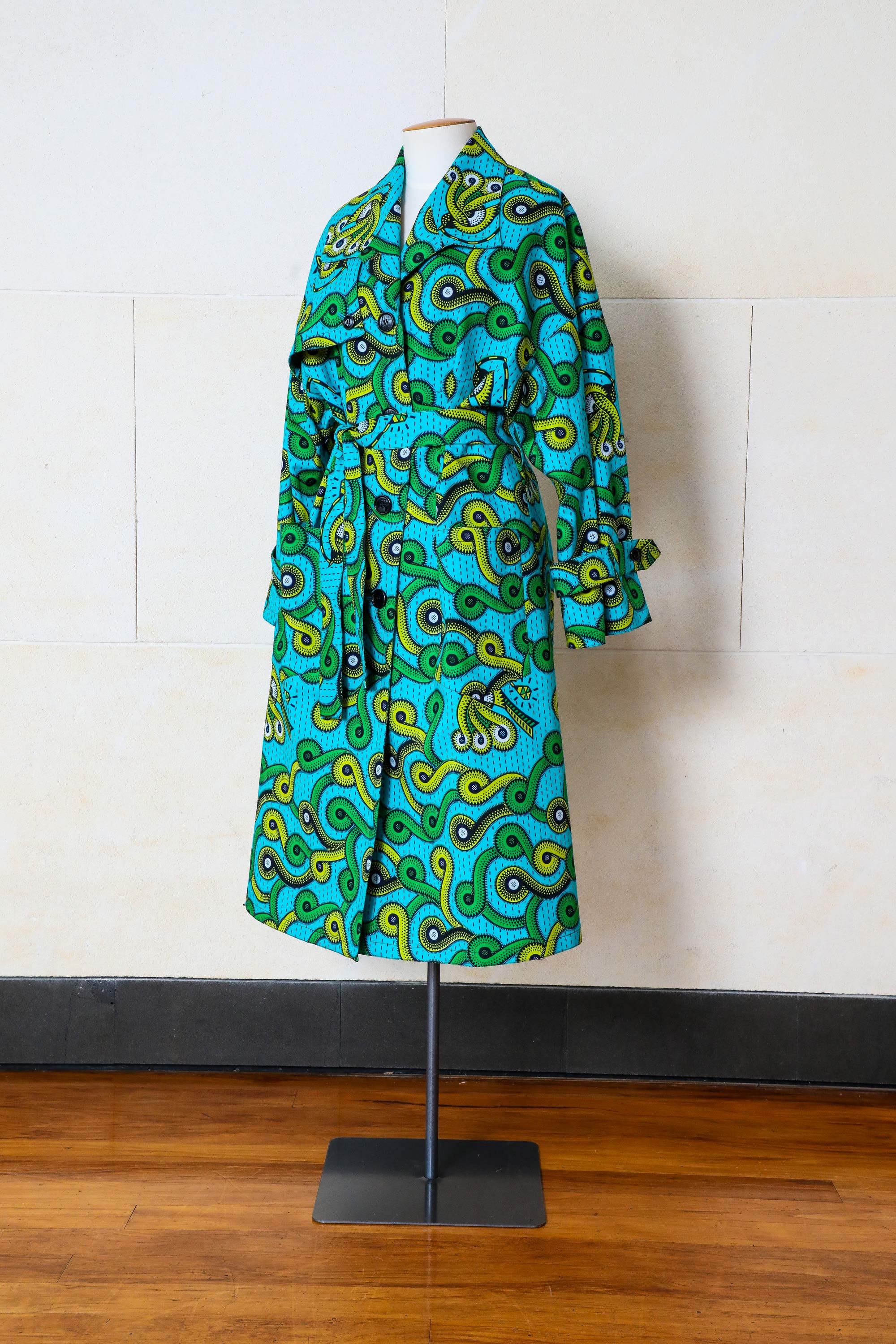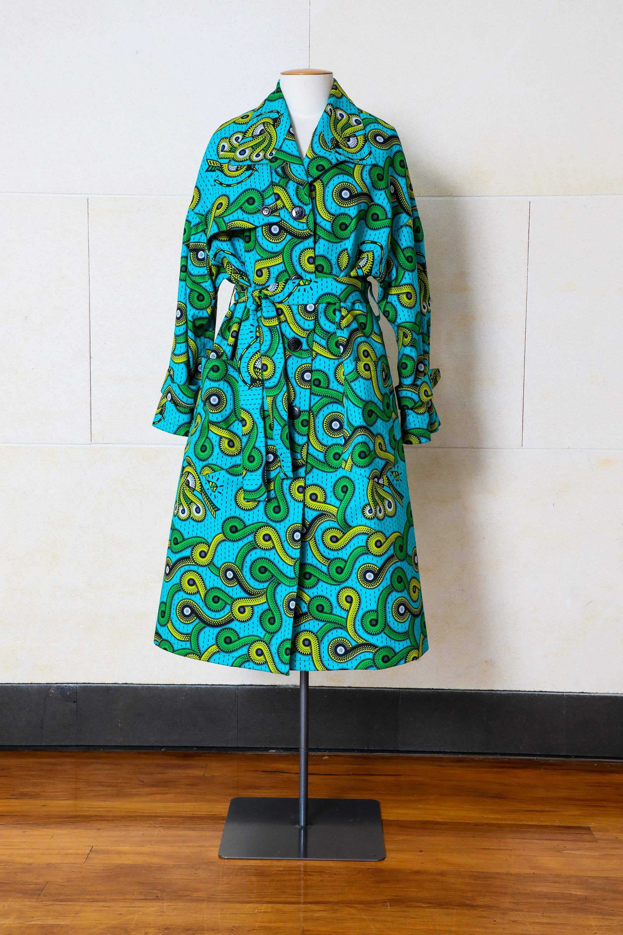 This Dada trench coat recalls the garment made popular by the film stars of the 1930s and 1940s such as Marlene Dietrich and Michelle Morgan who, following on from Coco Chanel, appropriated menswear to signify their status as independent women. Dada designer, Marie Strauss, says her coat retains the boxy shape of the original men’s coat that inspired these stars who wore it clinched at the waist to emphasise their figures. "My version is tailored, without the exaggerated shoulders seen in many iterations, exploring the classic shapes and lines associated with contemporary European design," Marie says. "It is a coat that we have all seen and perhaps even owned. I have updated it by using Dutch wax printed cotton with its bright colours and vivid patterns to give this garment an ironic and playful dimension. The fabric recalls my childhood in South Africa where it was widely worn, but also signals how style is global and international , that we are one world. The use of this fabric, with its historic past, for a traditional garment associated with Europe and the United States, shifts our perception and prompts us to ask why we wear what we do."