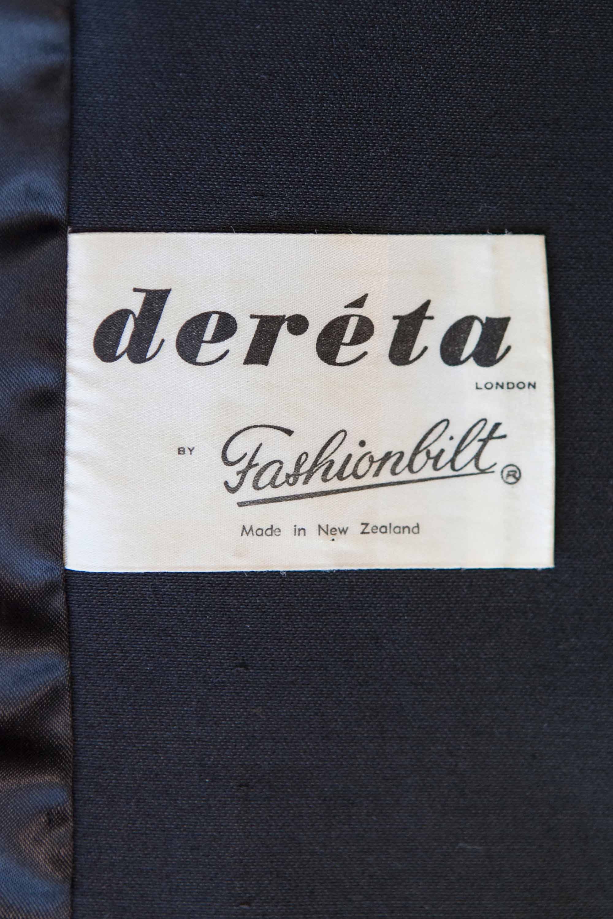 This Deréta London dress coat was made under licence by Wellington business Fashions Ltd. They manufactured many European and American ranges under licence, including Slimline, New Yorker and Lexington. The Fashionbilt label, however, was designed and made in New Zealand by Fashions Ltd designers.