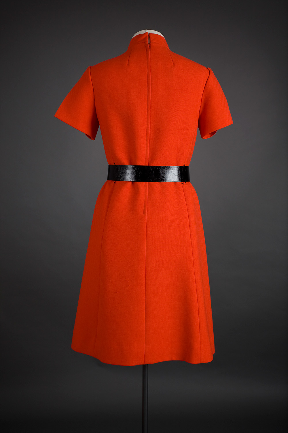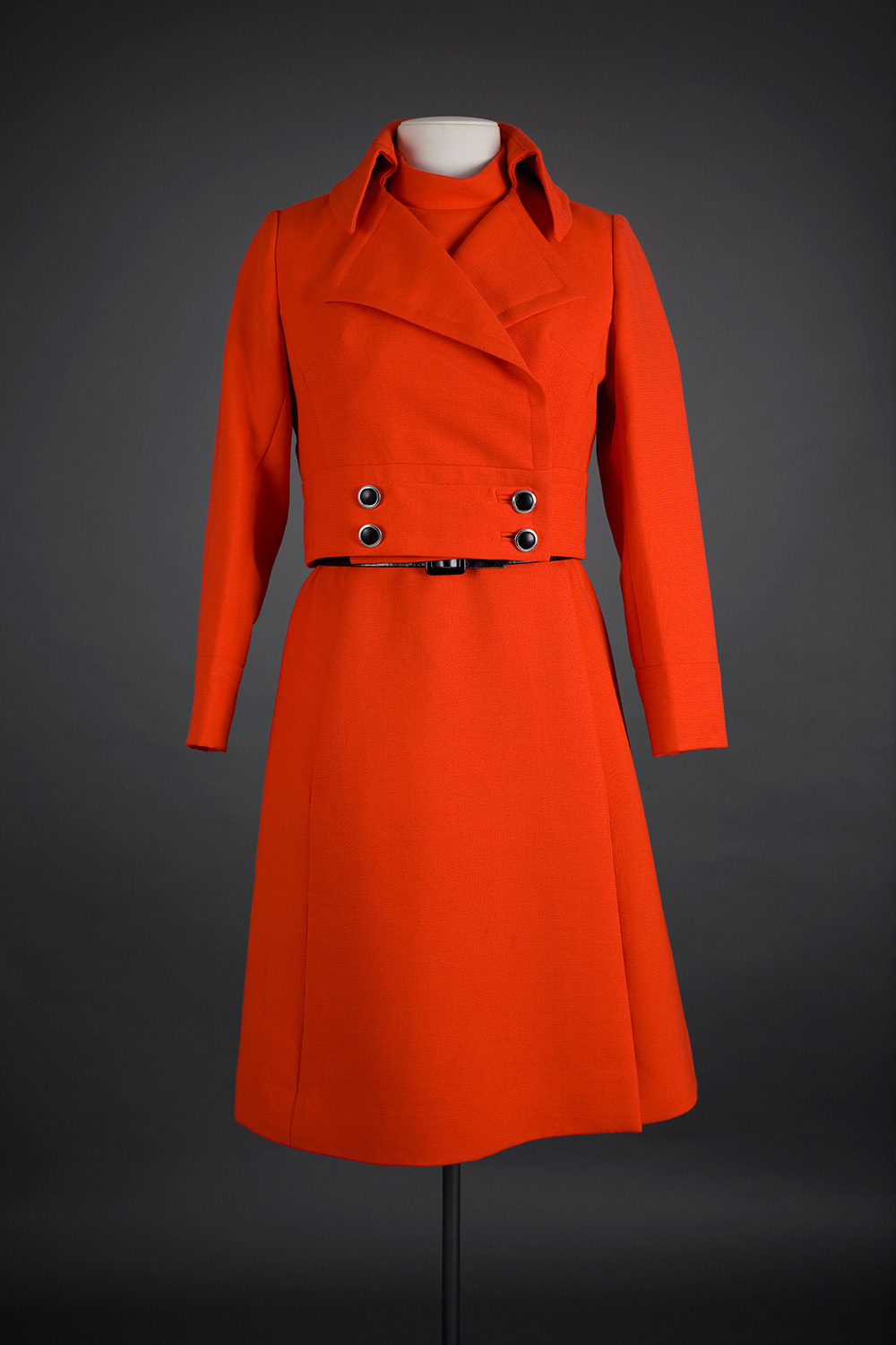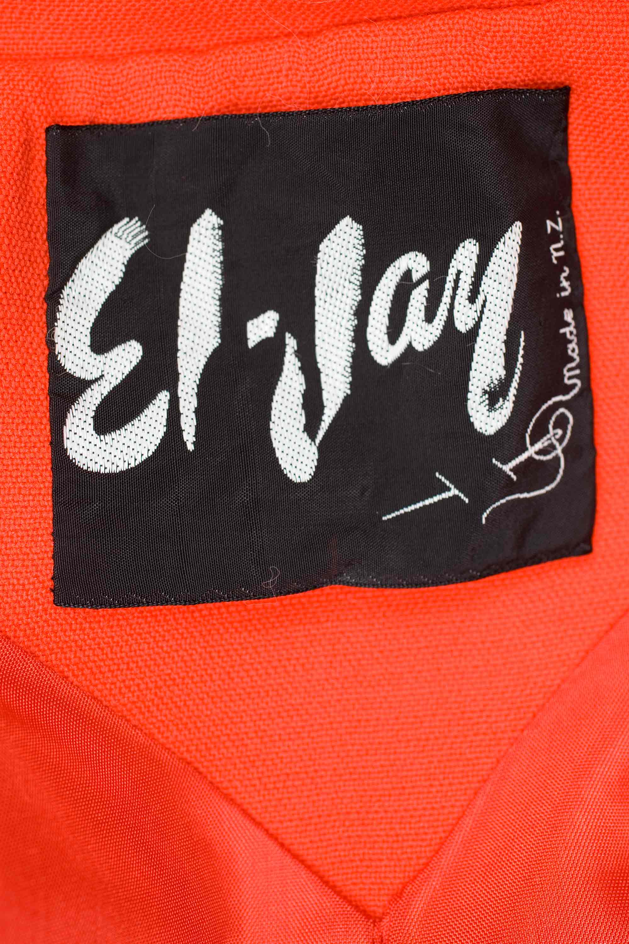 When Mary Burdon married in 1971 she chose this ensemble as her "going away outfit". The dress was originally mid-calf length, the so called midi length – the fashionable alternative to the other two staples the mini dress and the maxi dress. Read more about Gus Fisher and the El Jay label in the New Zealand Fashion Museum publication Looking Terrific: The story of El Jay.