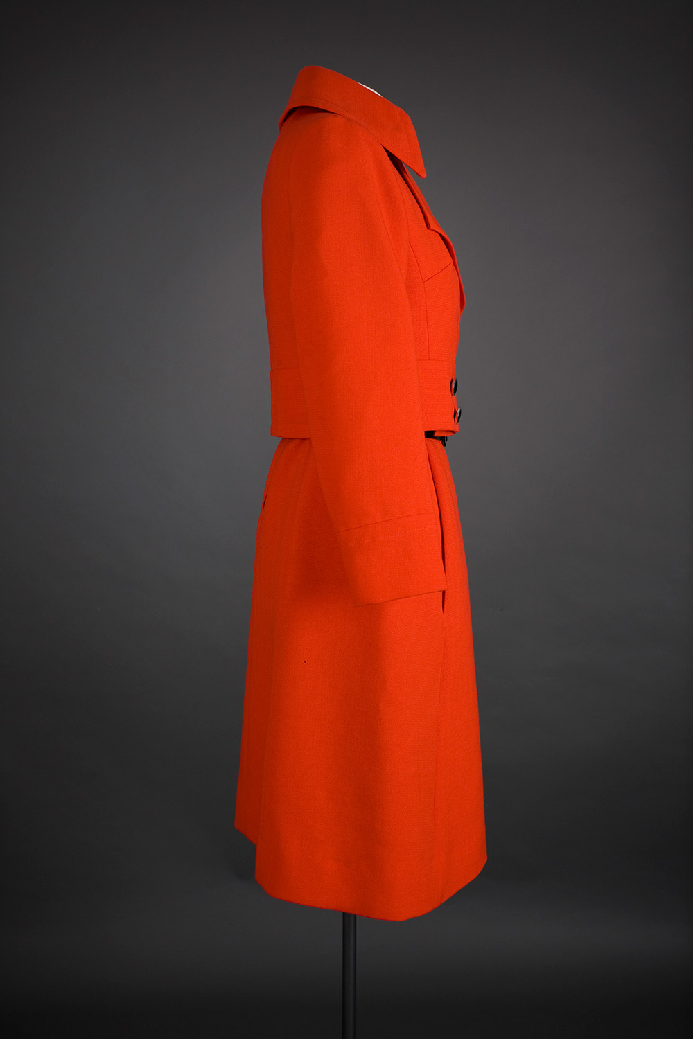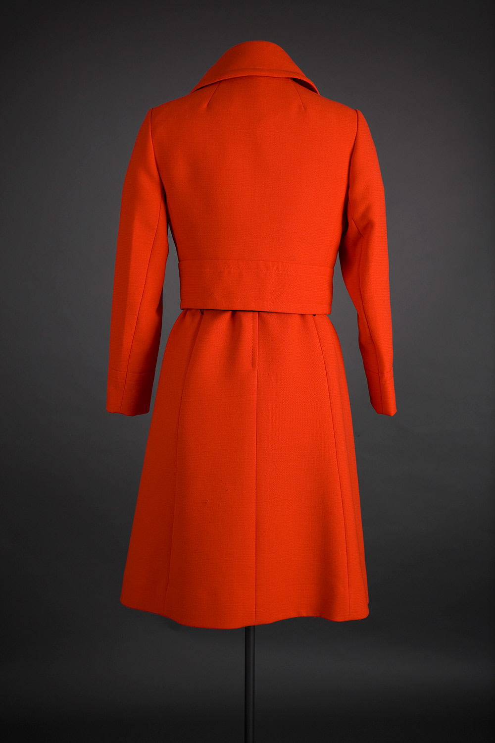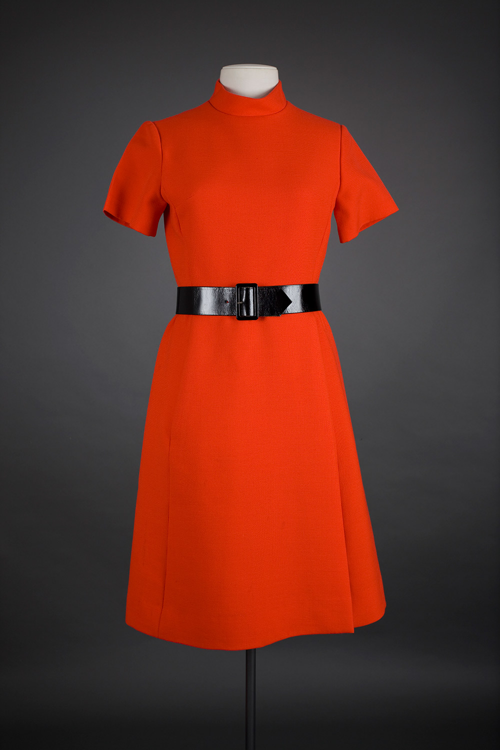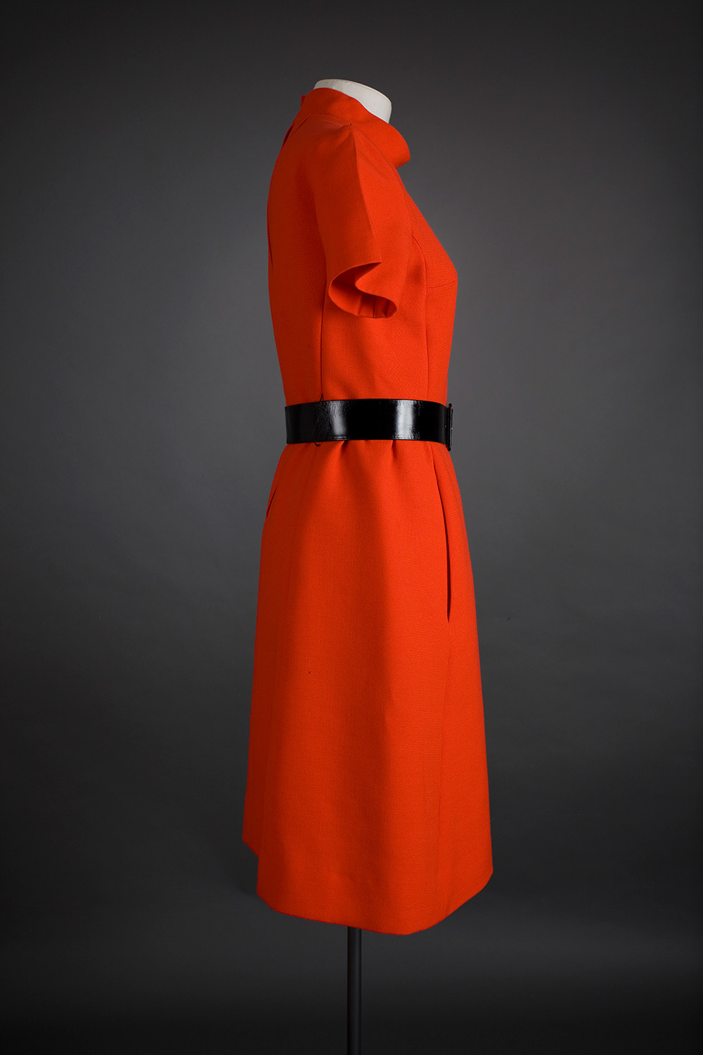 When Mary Burdon married in 1971 she chose this ensemble as her "going away outfit". The dress was originally mid-calf length, the so called midi length – the fashionable alternative to the other two staples the mini dress and the maxi dress. Read more about Gus Fisher and the El Jay label in the New Zealand Fashion Museum publication Looking Terrific: The story of El Jay.
