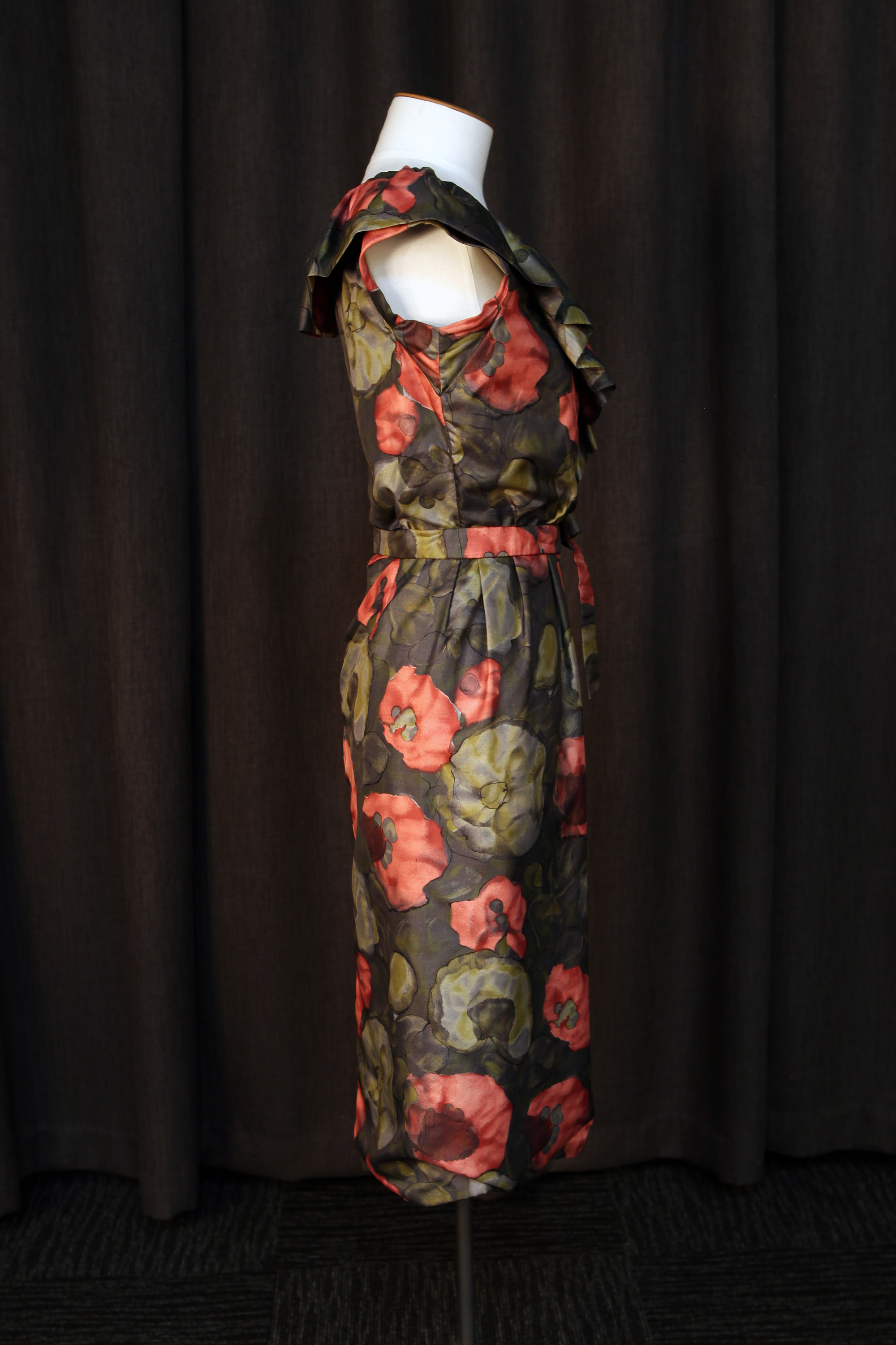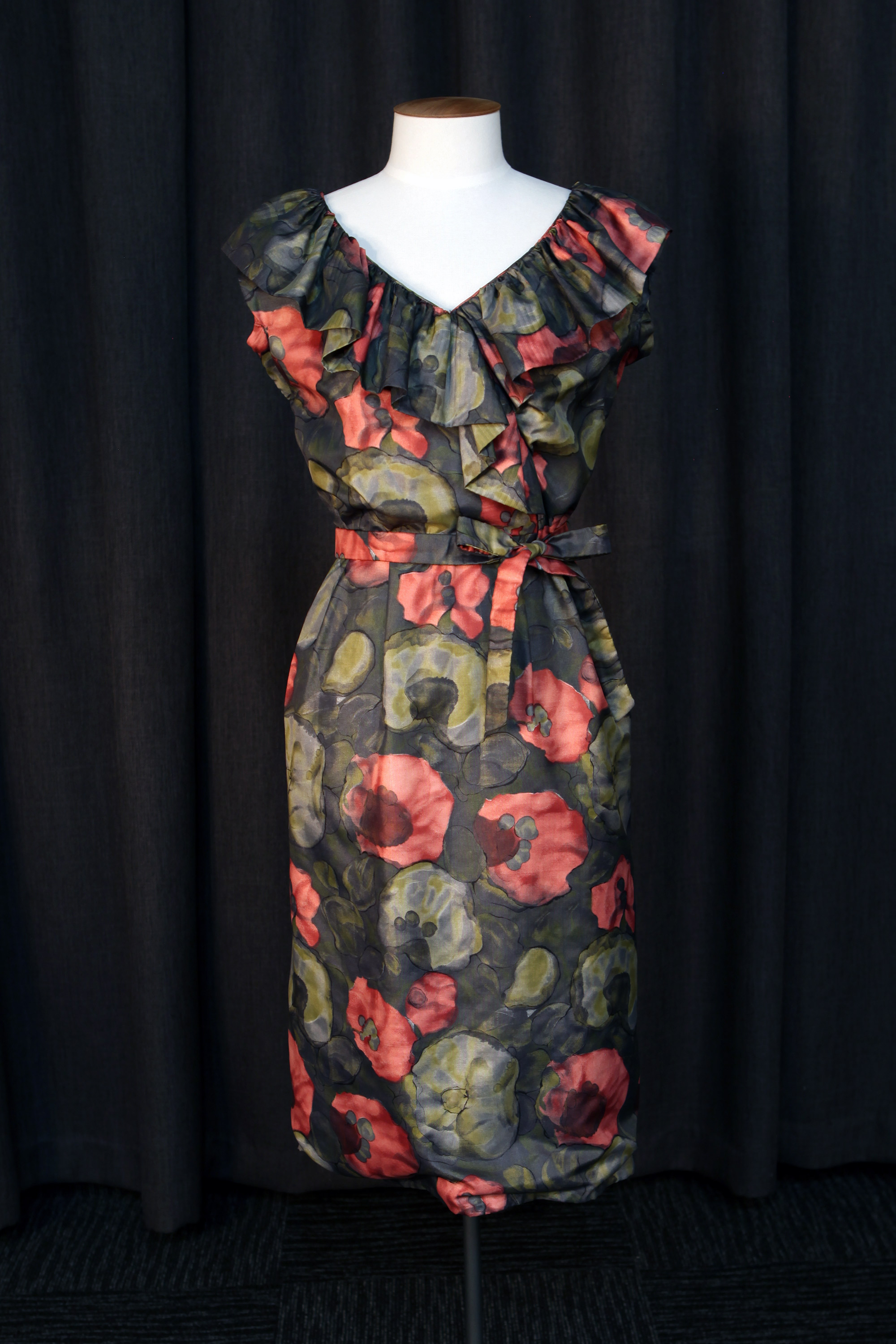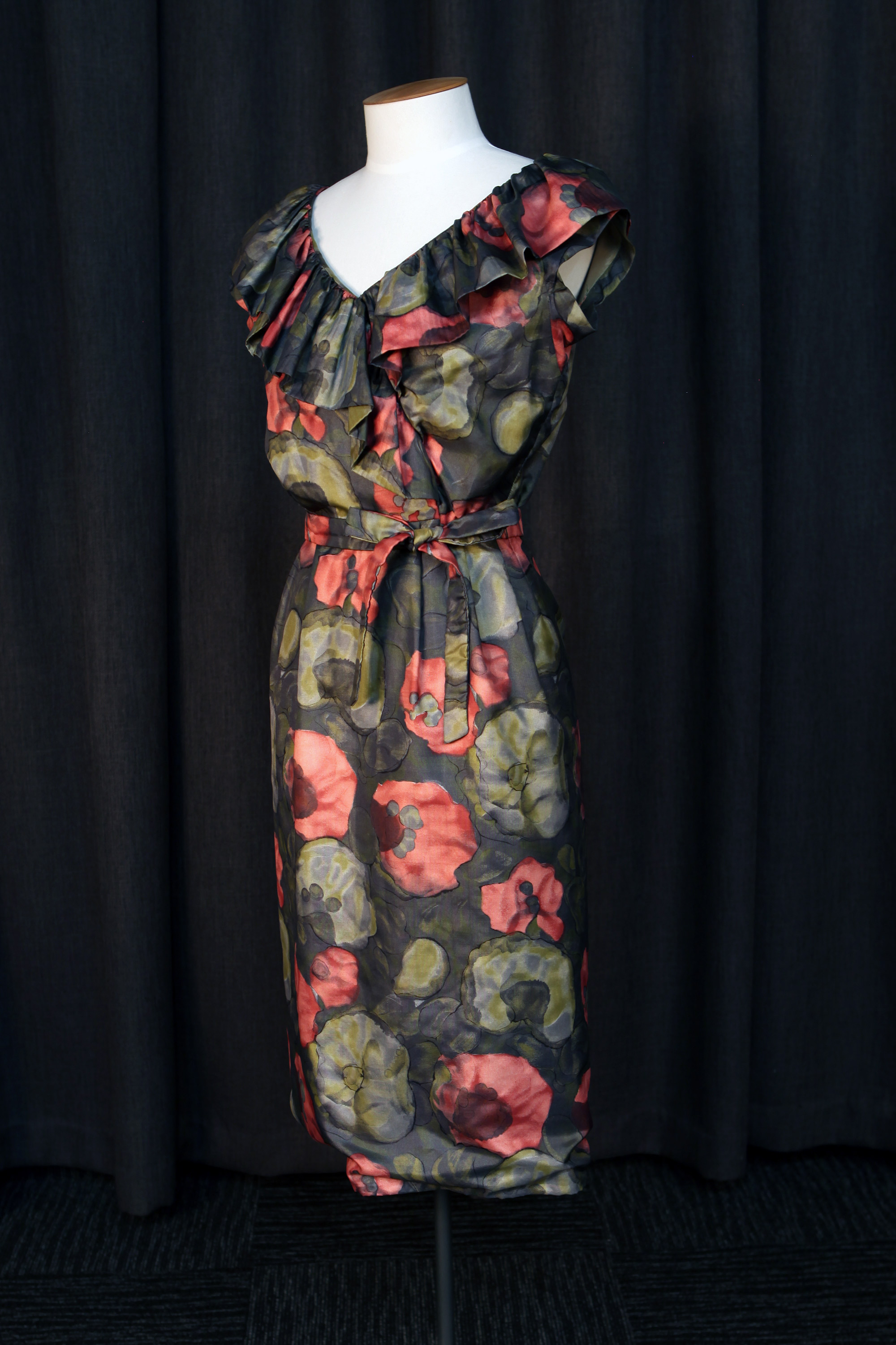 The dress has a ruffled neckline and a self fabric tie belt.
