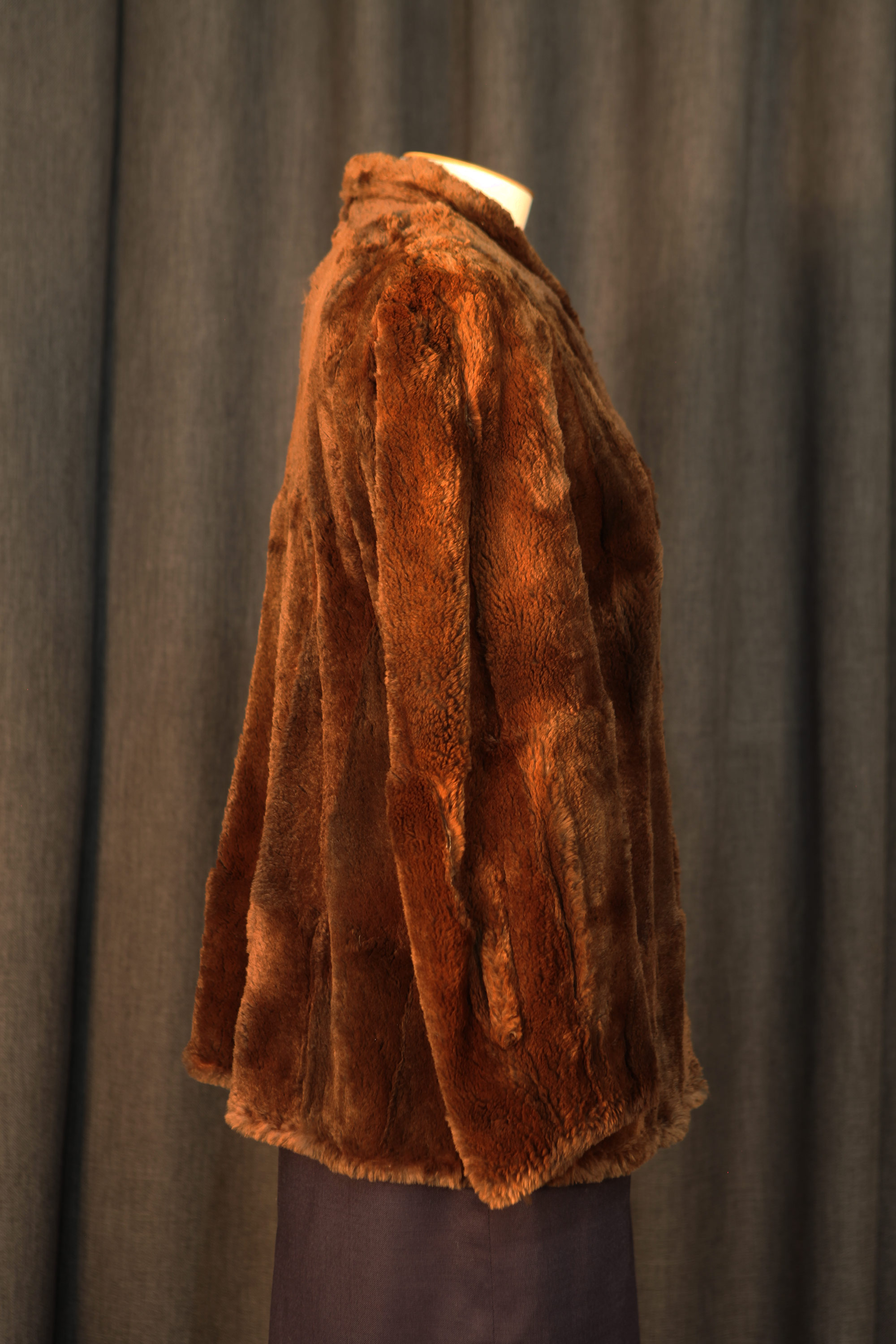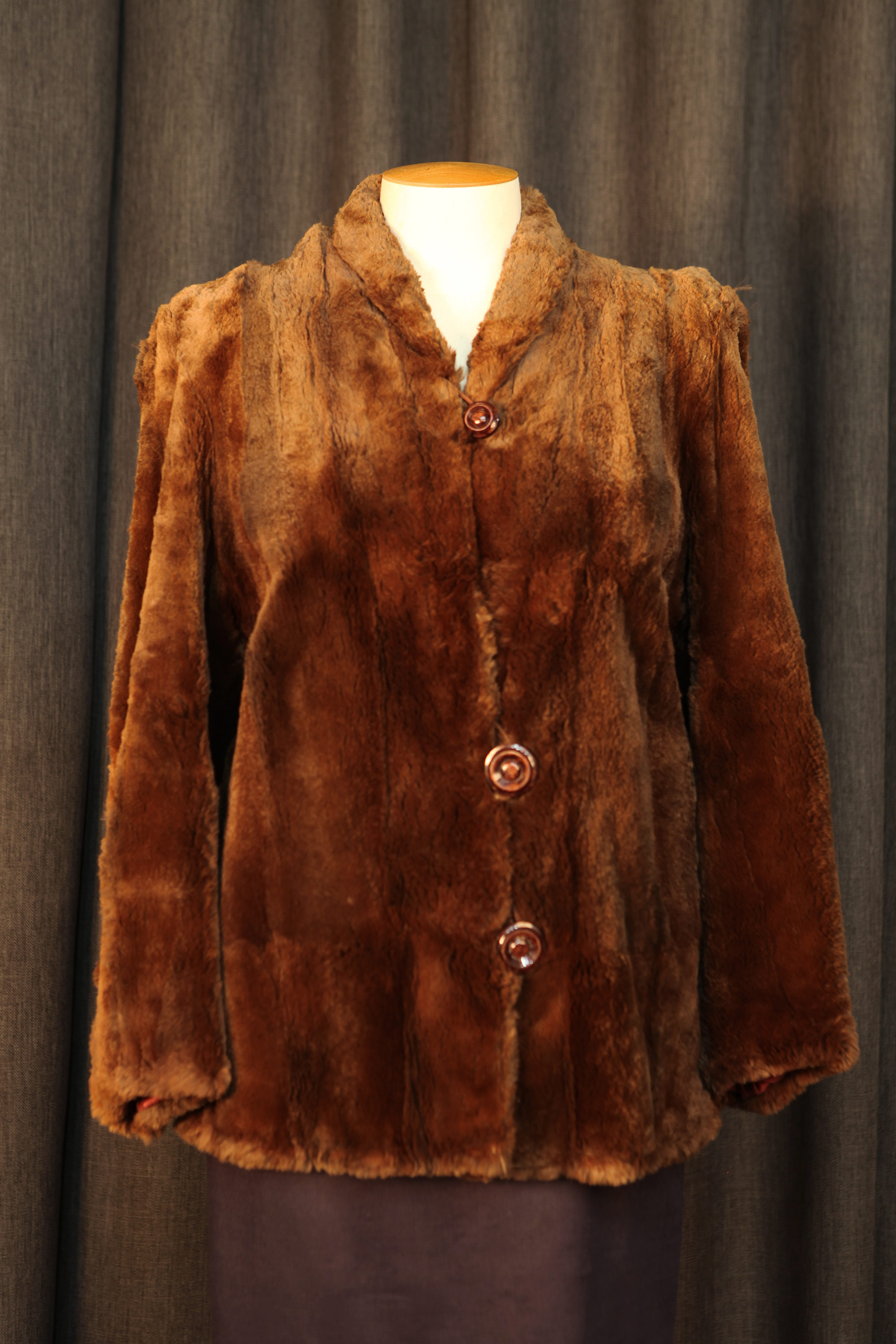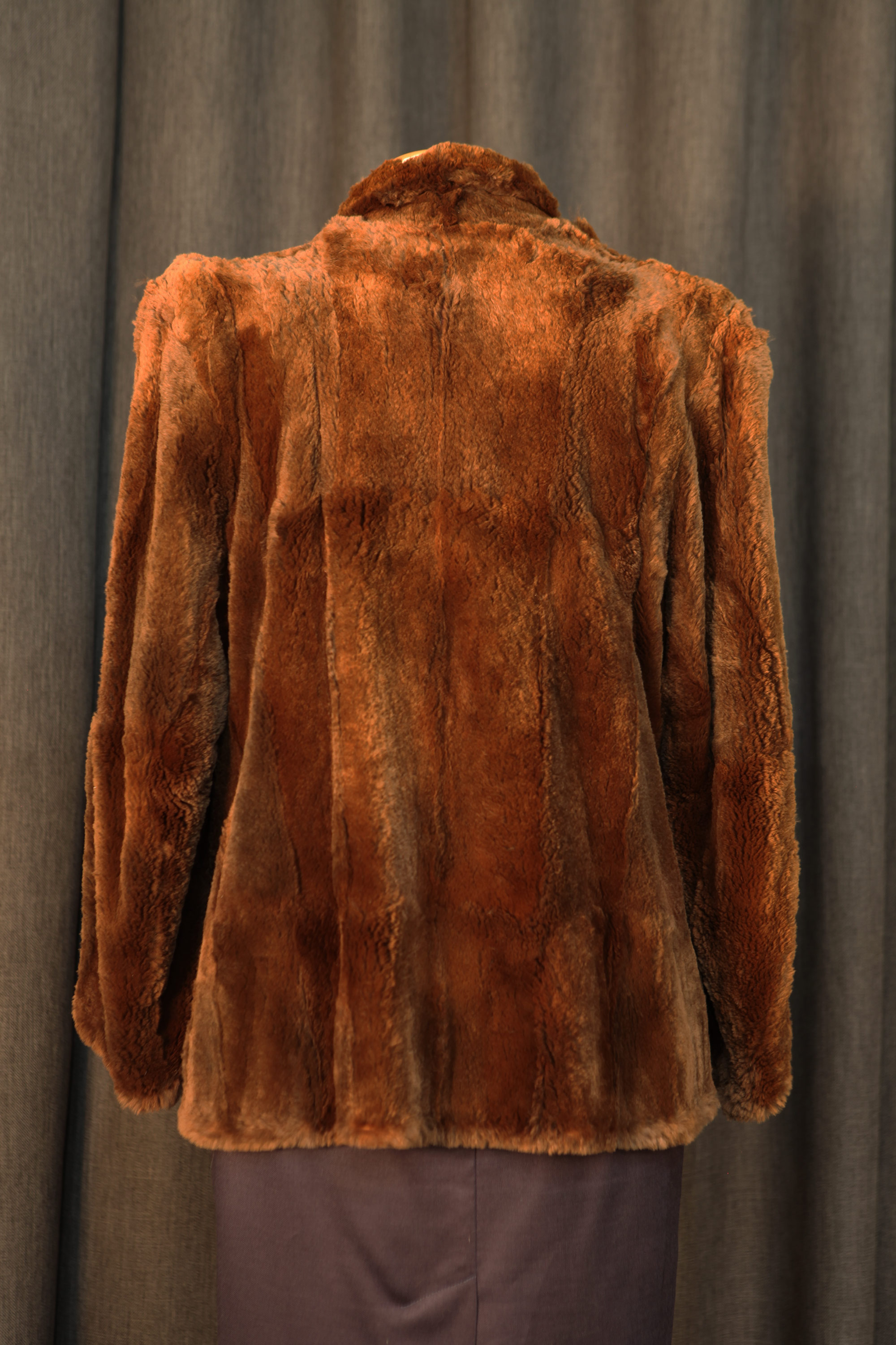 This fur jacket is labelled Fashion Furs by Cynara - one of the Mooneys Furs labels. Mooneys started out in Dunedin in 1912, later opening additional workrooms in Auckland and Wellington. Nola Rae Waters (nee Dignan) worked in the Auckland workroom as a furrier in the 1930s and 1940s. She was able to remain in employment during the Second World War, manufacturing uniforms, including bomber jackets for the American Airforce. Nola got married and had a daughter in 1948 but Mooney’s asked if she would return to work. She did - on the proviso that she could make her mother this jacket, which was originally made as a coat. Nola must have been a highly regarded employee because they agreed, and continued to pay her "a man’s wage" for her work.