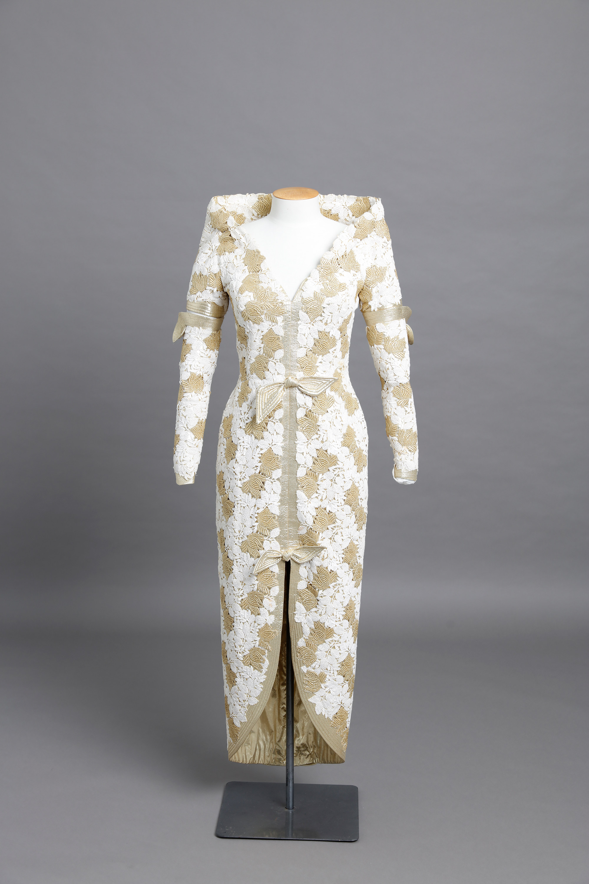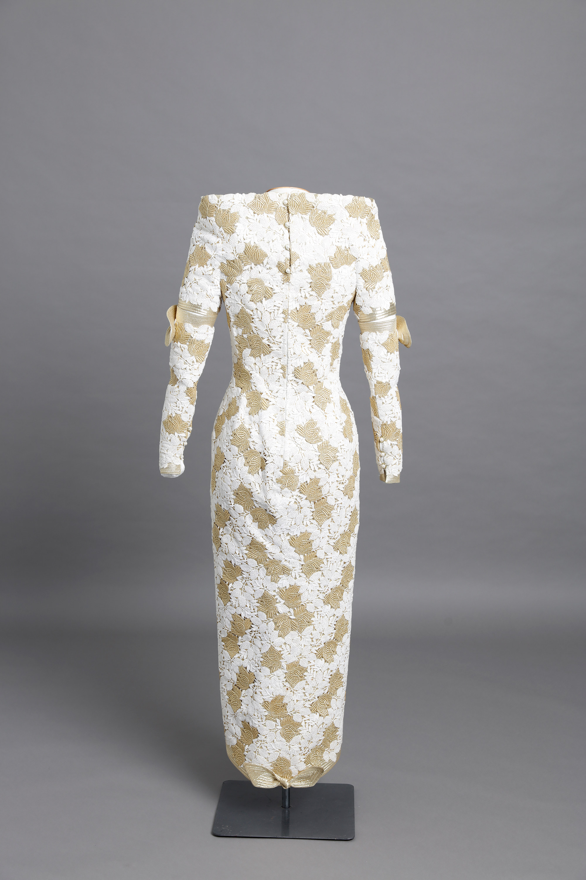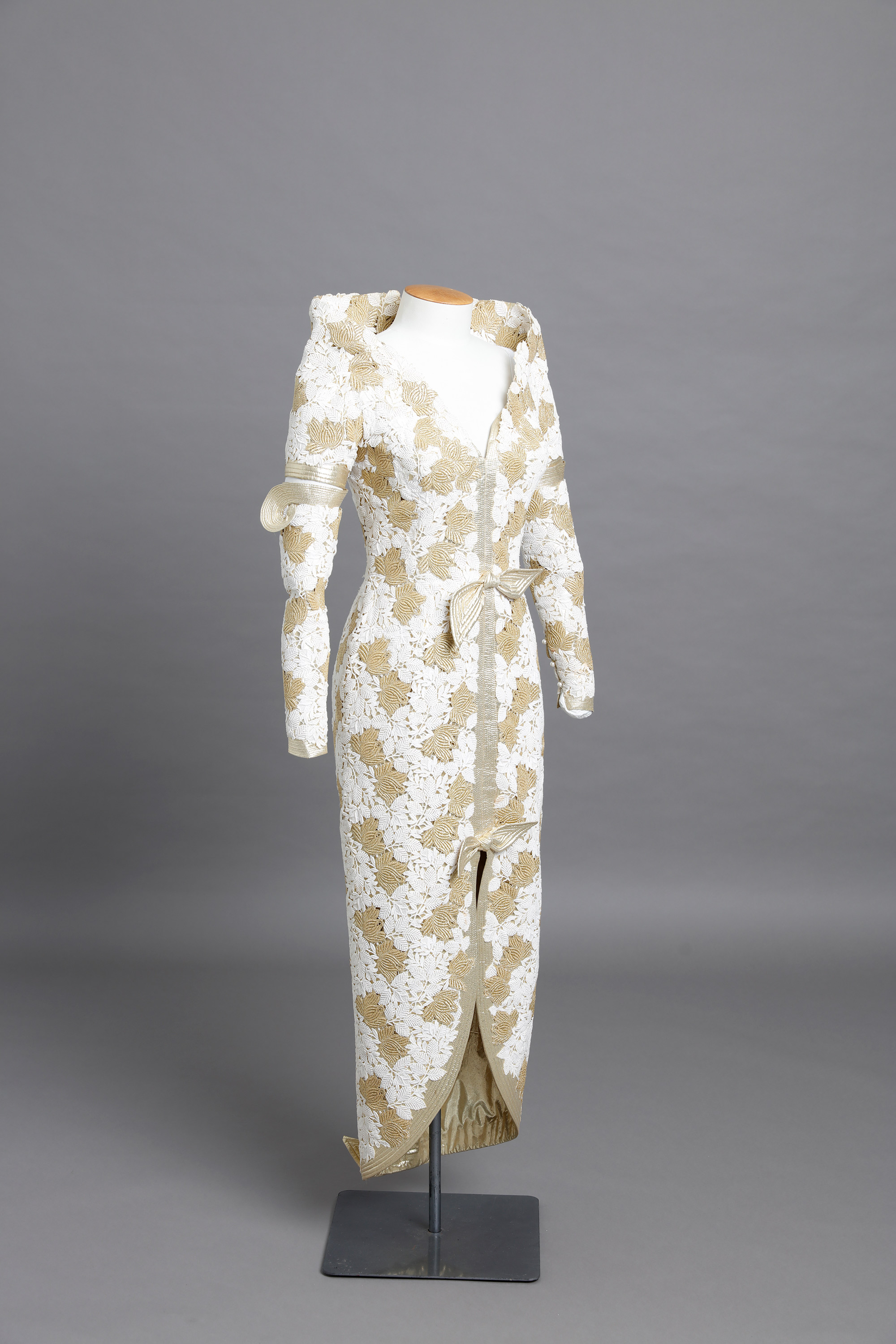 This dress and gauntlets were made by Bruce Papas for Meegan Pollock to wear to the Auckland Racing Club Ball in about 1986. The dress and gauntlets are made from guipure lace overlayed over gold tissue lame. The guipure lace, from Jakob Schlaepfer, was only 40 cm wide so required careful design to create a dress with that narrow width. The same fabric has been used for the bustier that is part of the white and gold leather suit.