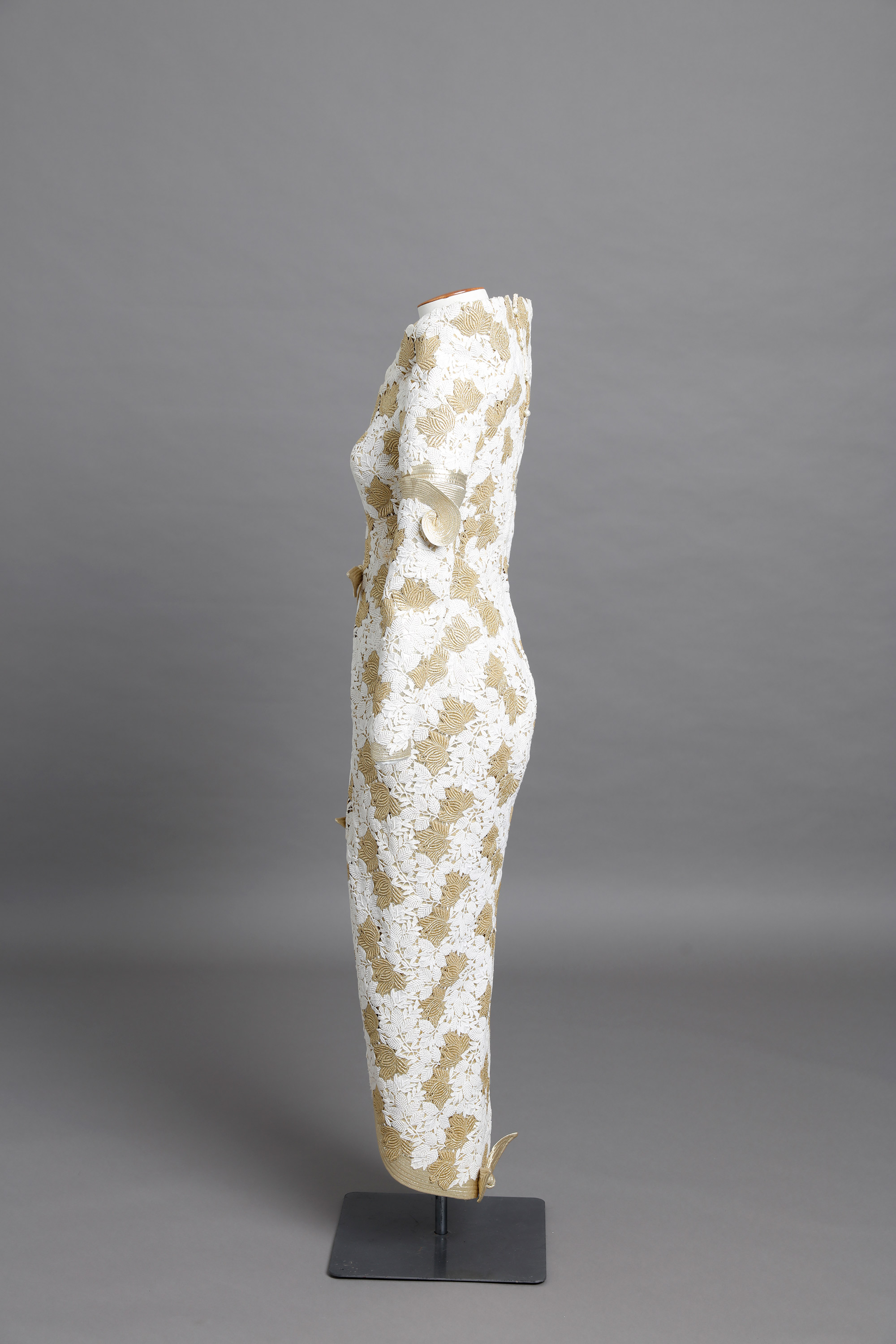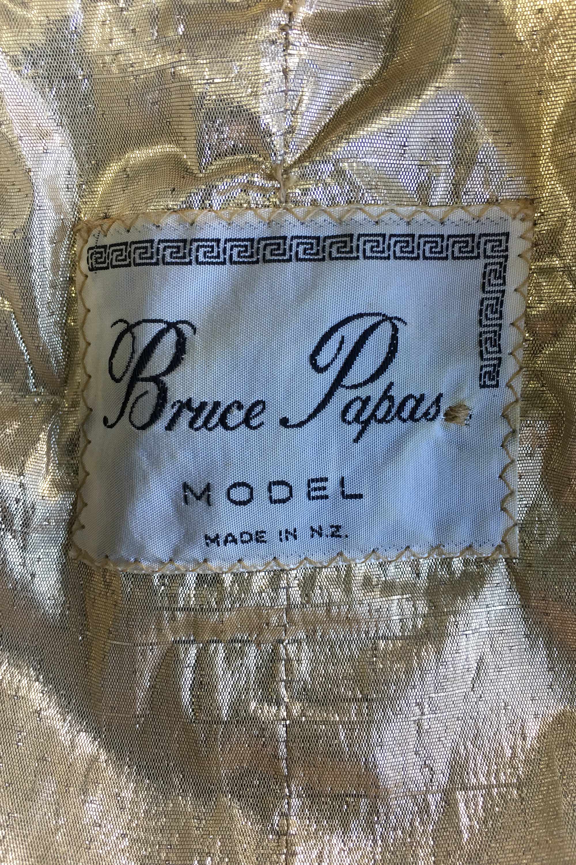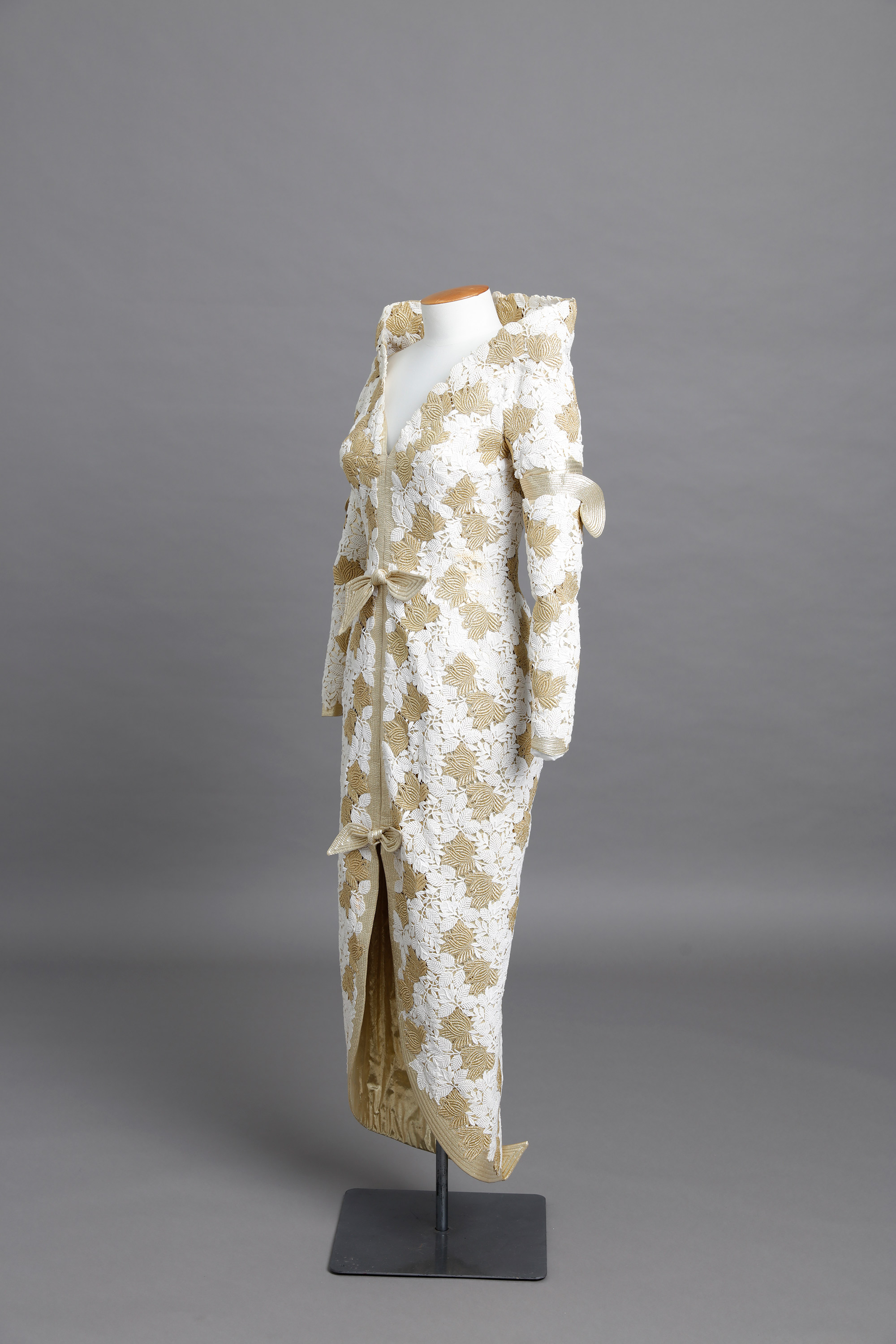 This dress and gauntlets were made by Bruce Papas for Meegan Pollock to wear to the Auckland Racing Club Ball in about 1986. The dress and gauntlets are made from guipure lace overlayed over gold tissue lame. The guipure lace, from Jakob Schlaepfer, was only 40 cm wide so required careful design to create a dress with that narrow width. The same fabric has been used for the bustier that is part of the white and gold leather suit.