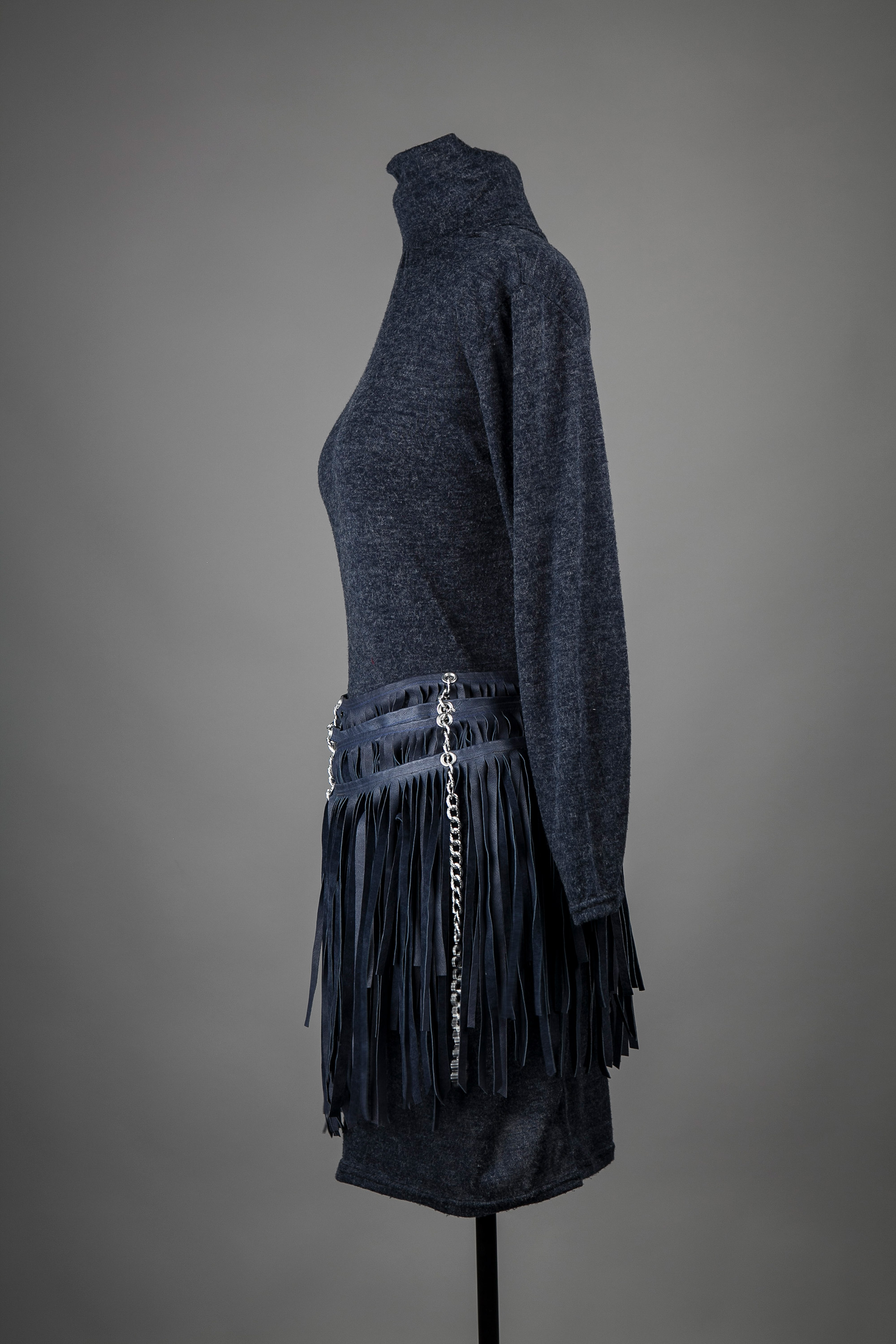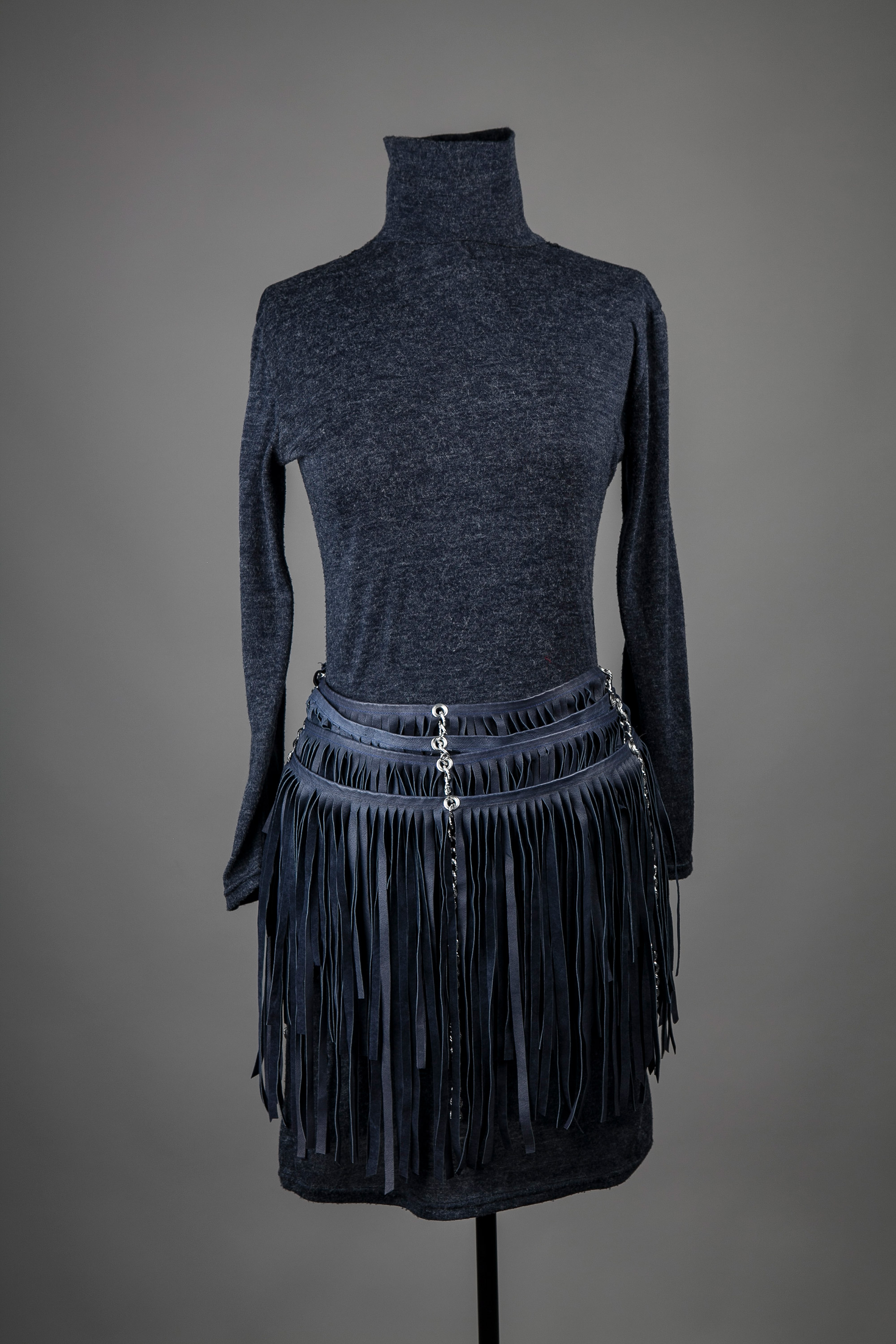 This one-off hand-cut blue leather skirt mimics the design of a piupiu. It is made up of four layers of tassels each connected to the other by metal chain at the centre of the front and back and at either side. It is worn over a short Filigress dress.