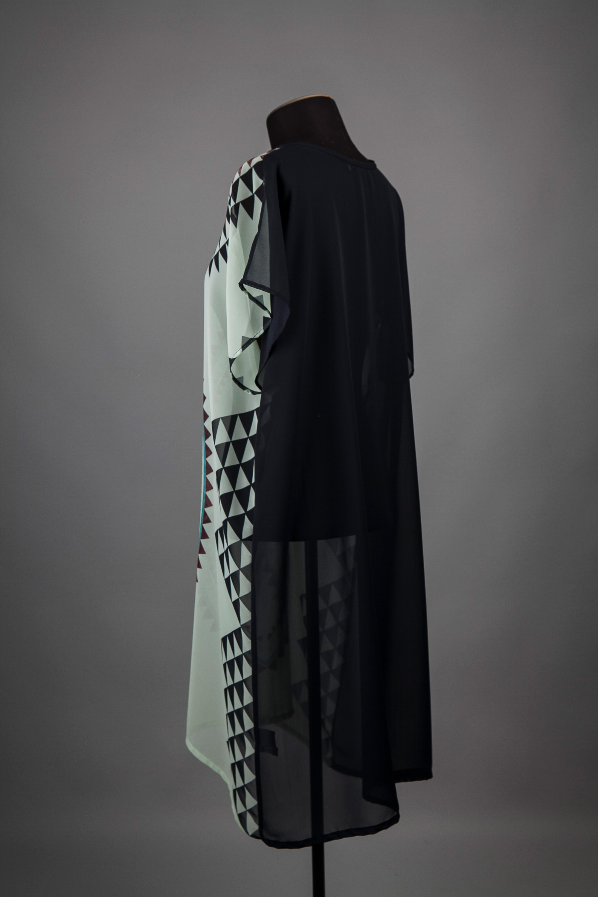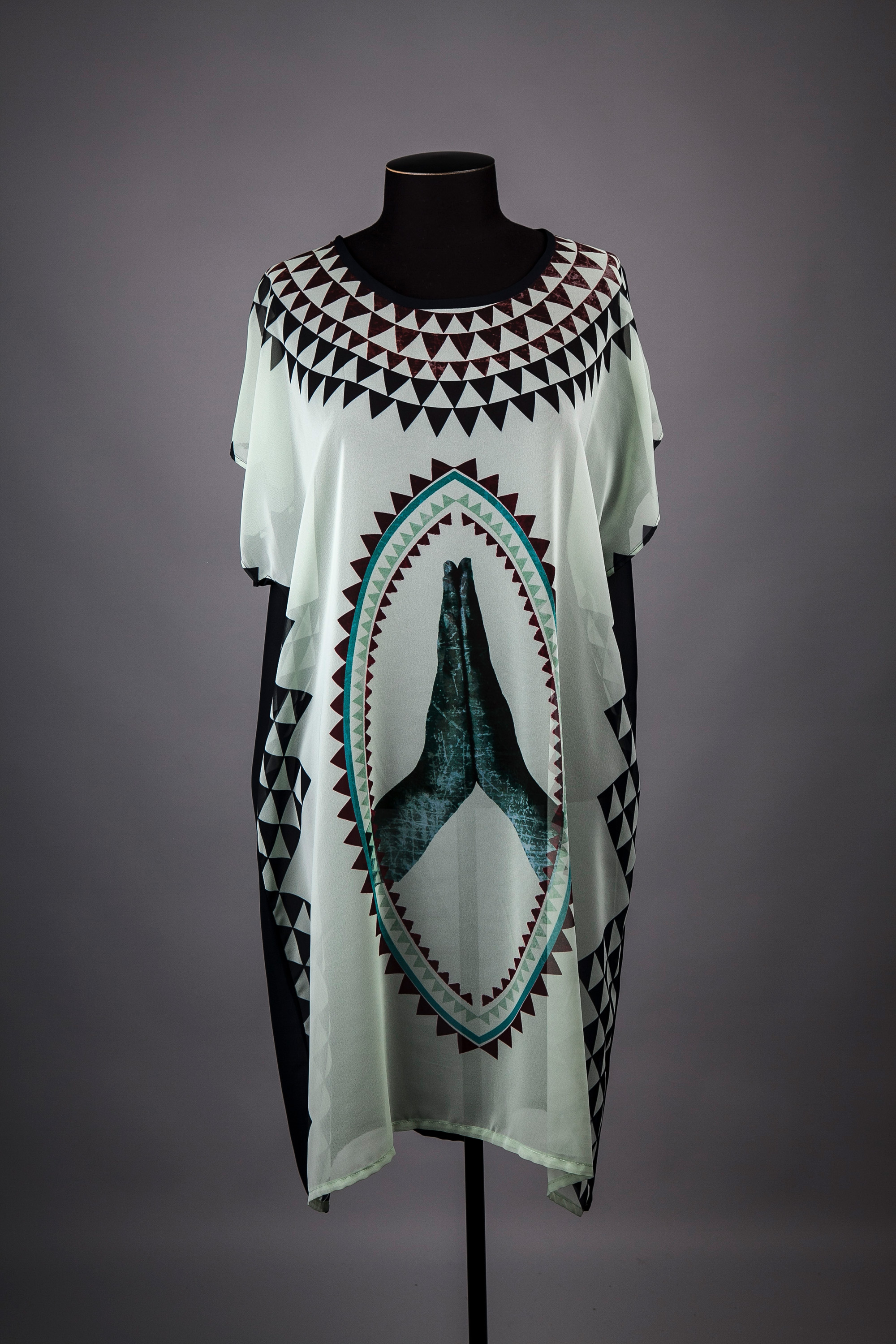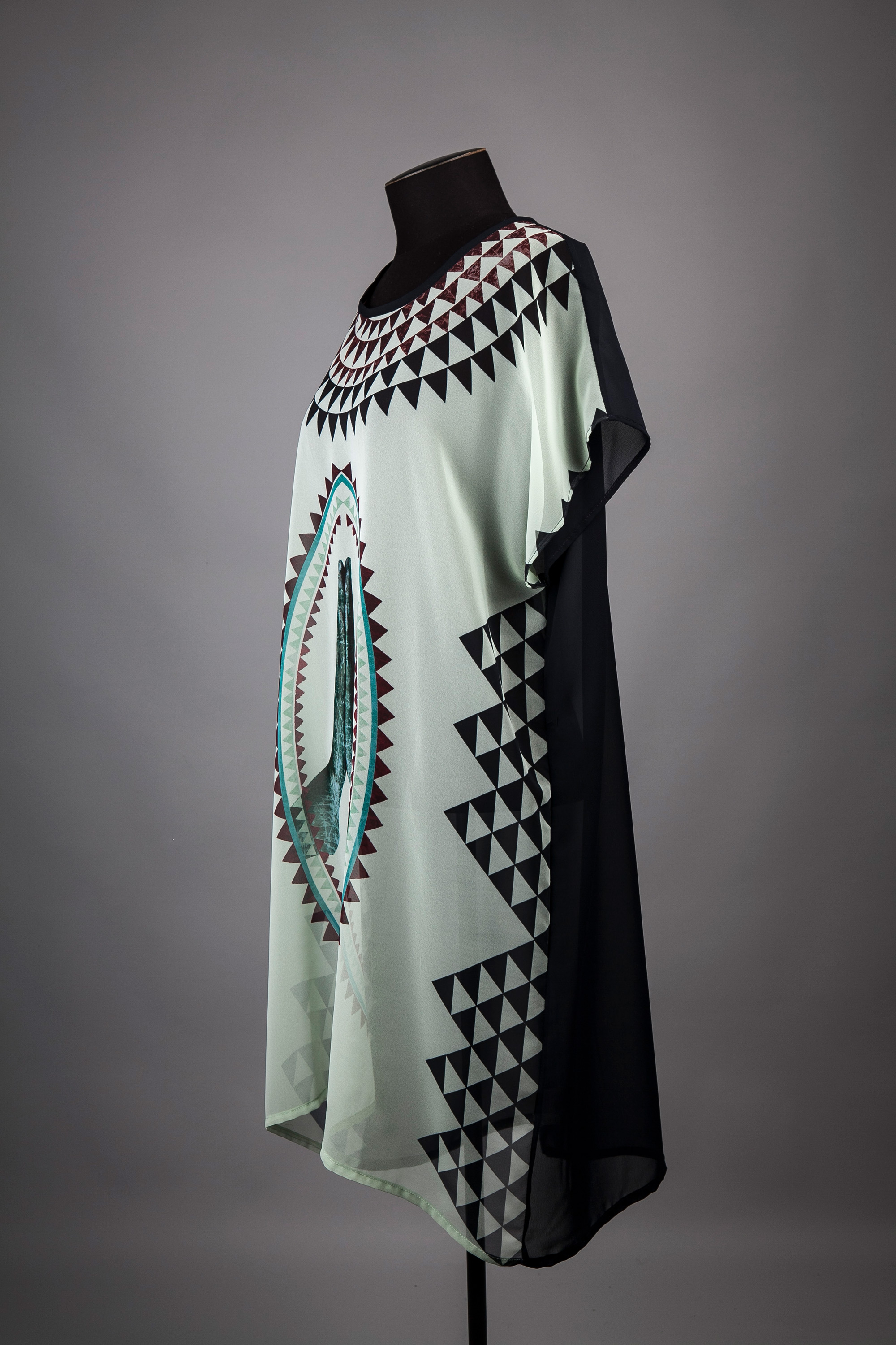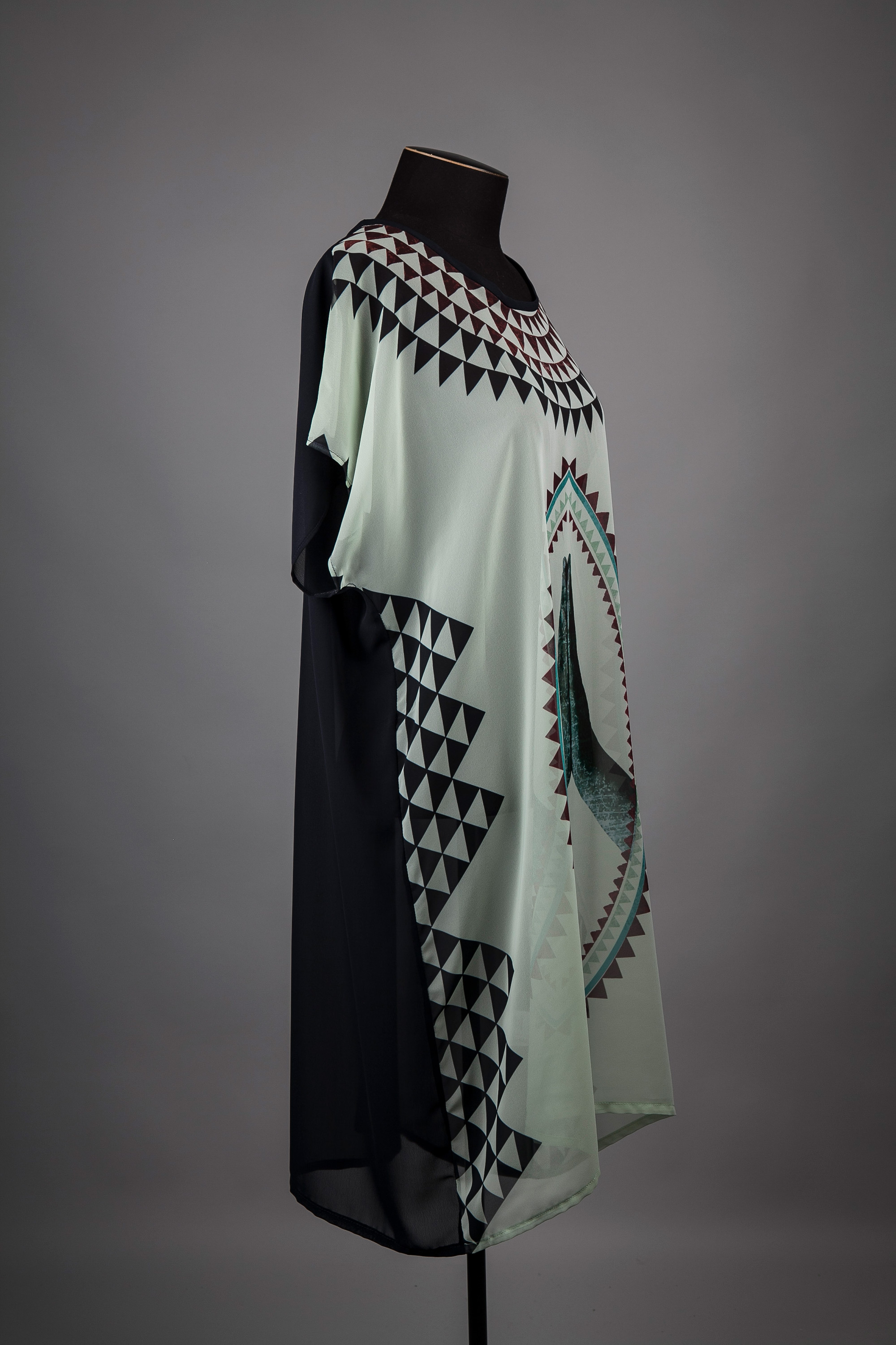 This 'Karakia' print dress was created as part of collection featured at the Miromoda Showcase during New Zealand Fashion Week in 2013. It has also become designer Adrienne Whitewood's most popular garment and has been favoured by New Zealand celebrities including singer Maisey Rika and MP Louisa Wall. The design was inspired by the imagery used in popular media to symbolise spirituality and also incorporates Adrienne's signature taniko patterning.